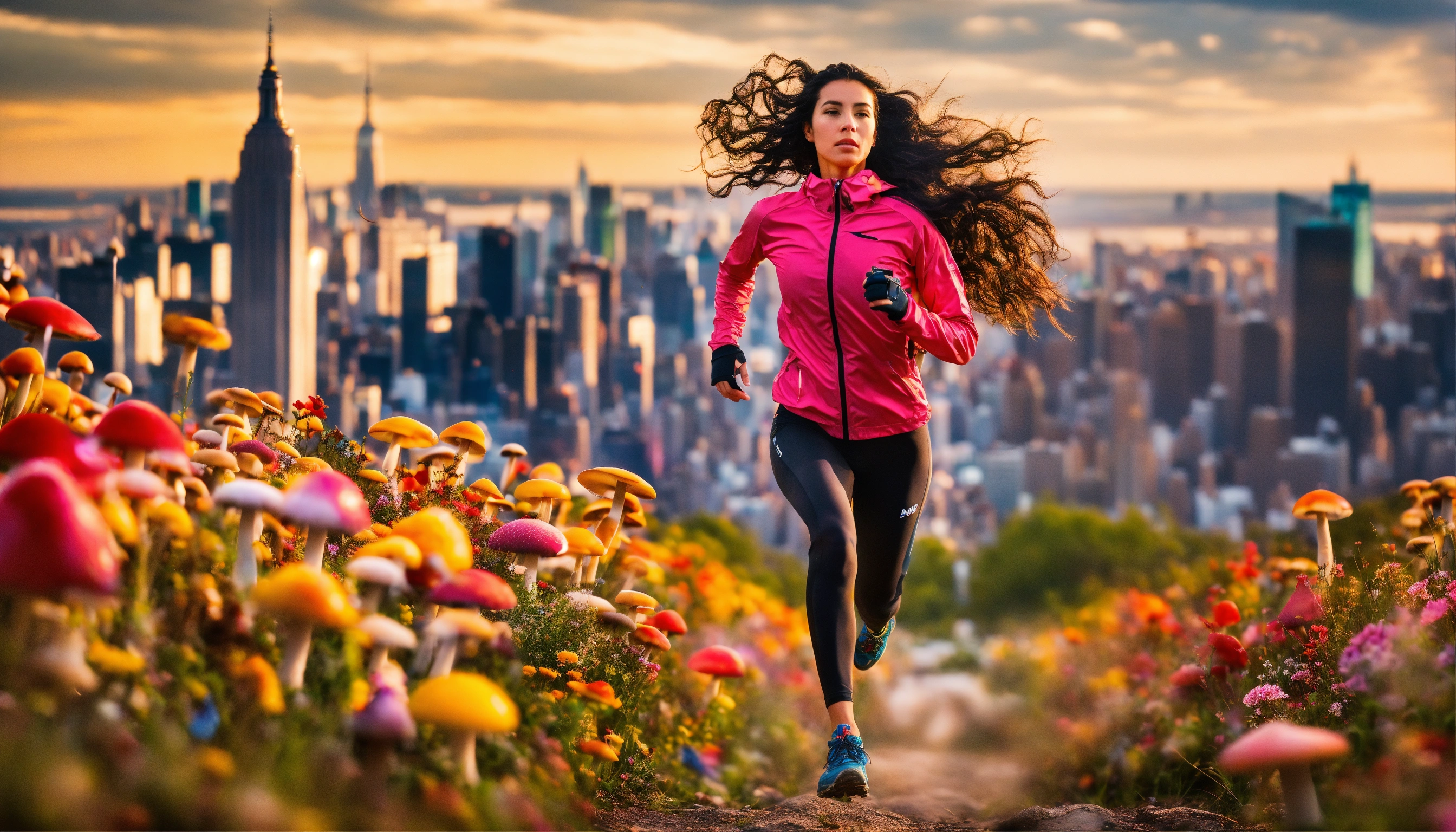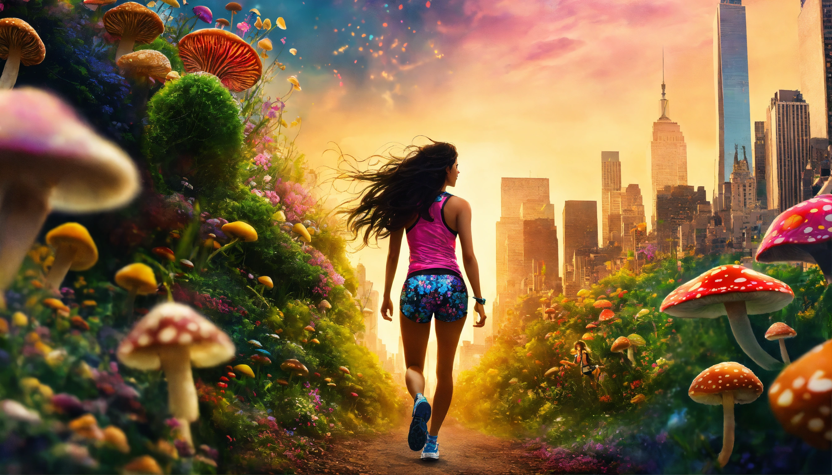 Full length view, trail runner woman looking straight, long curly dark hair blowing in the wind, running in a big city as new york a bottle of perfume in her hand, close up on a a psychedelic universe made of flowers, mushrooms, nikon d5600 photography