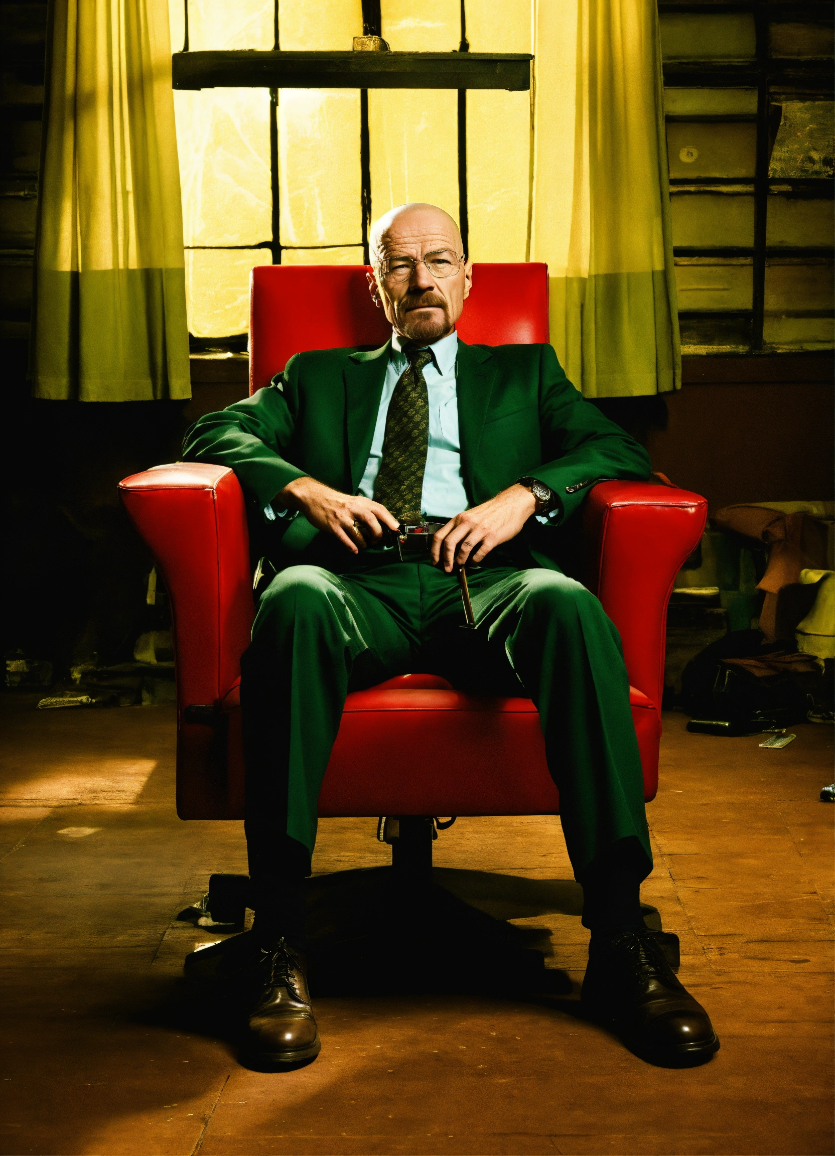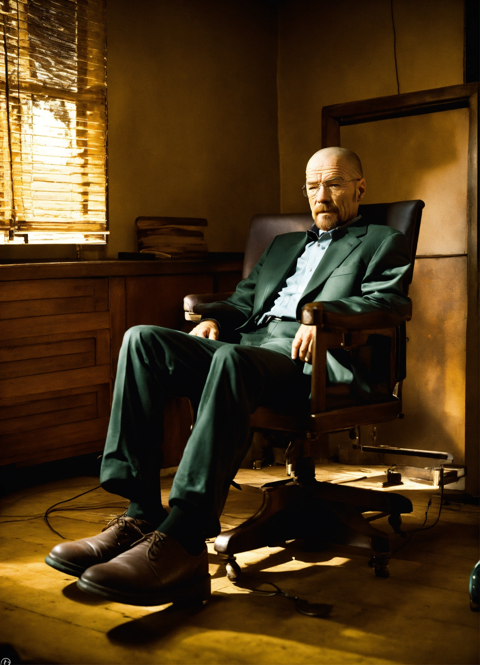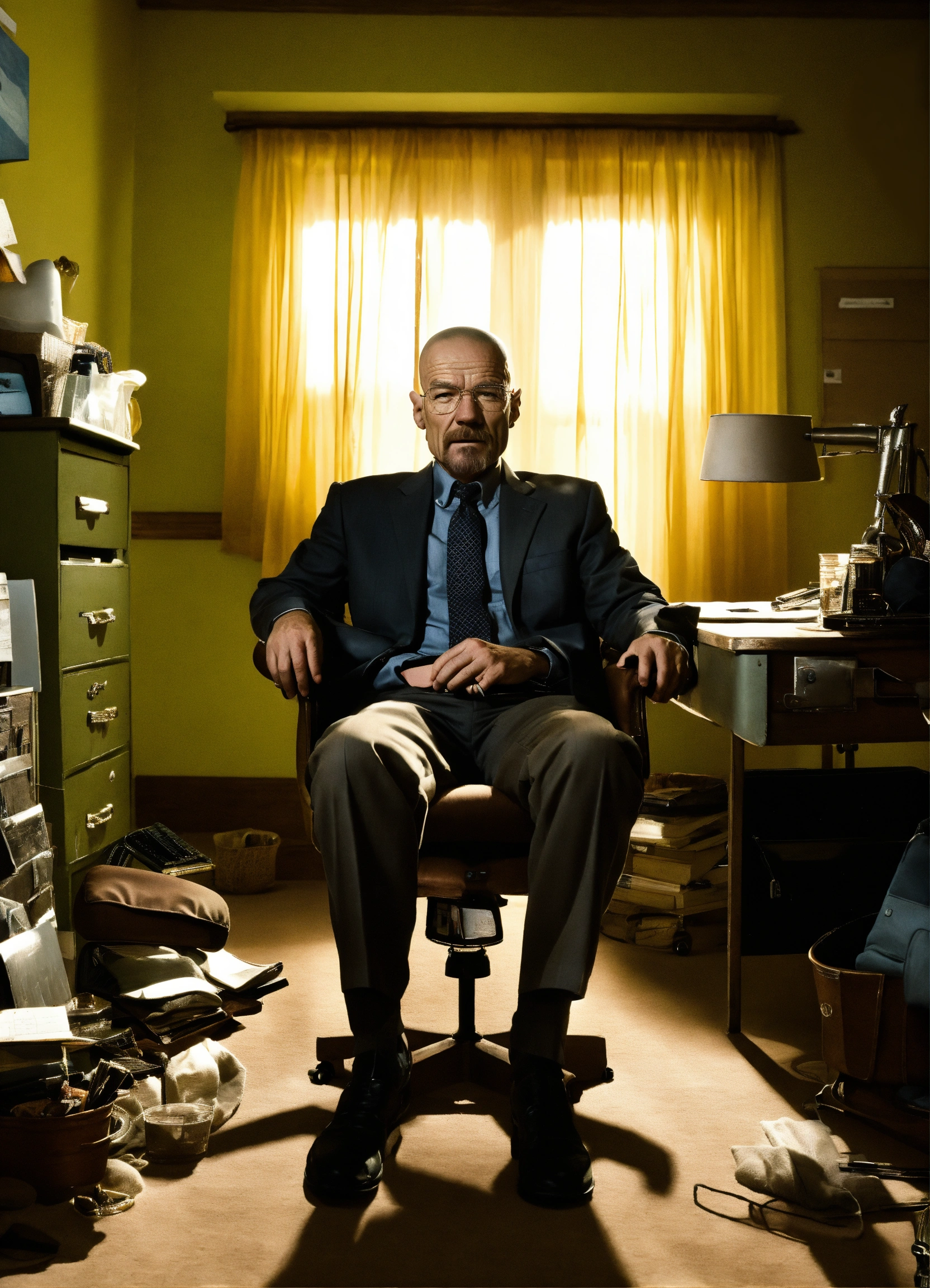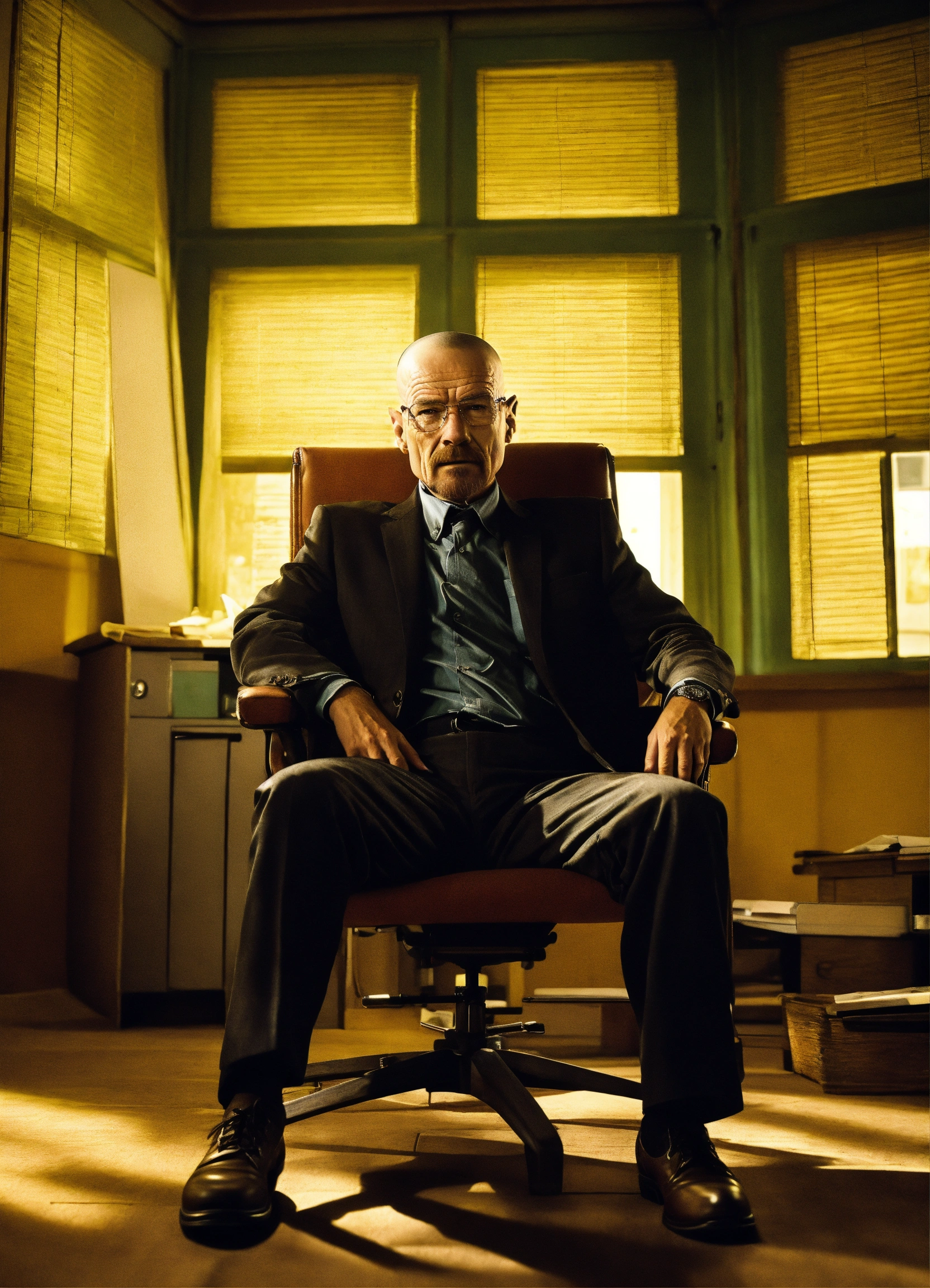 Walter white est assis sur un bureau ancien, il regarde l’objectif, il est assis sur une chaise basse, le visage est légèrement différent de la réalité, il est recroquevillé sur lui même