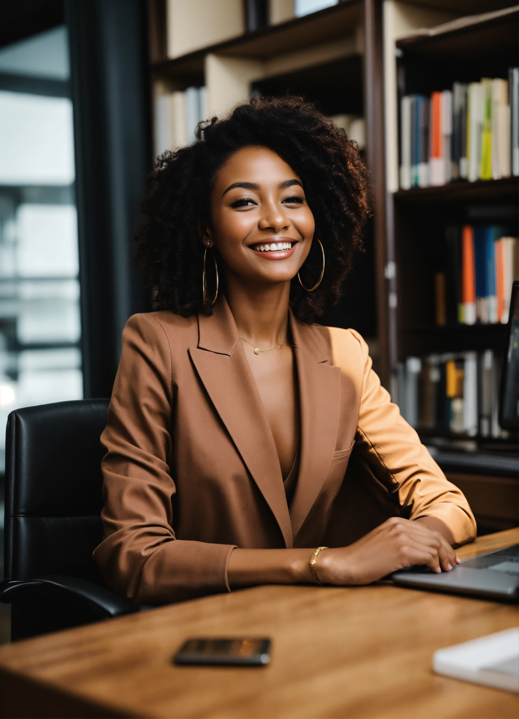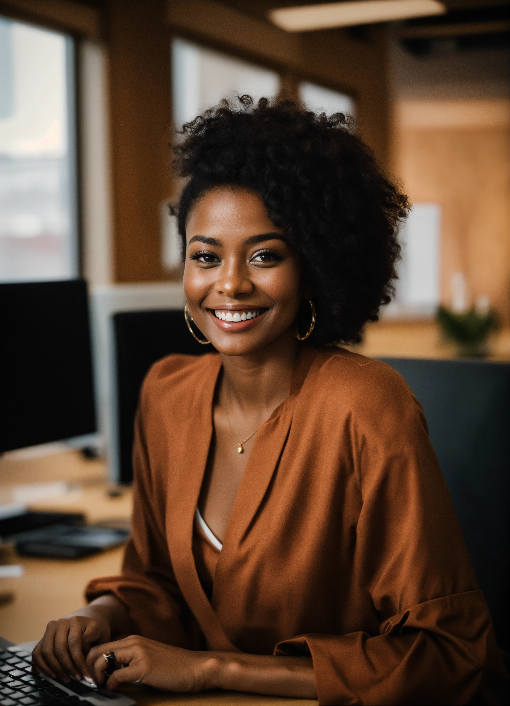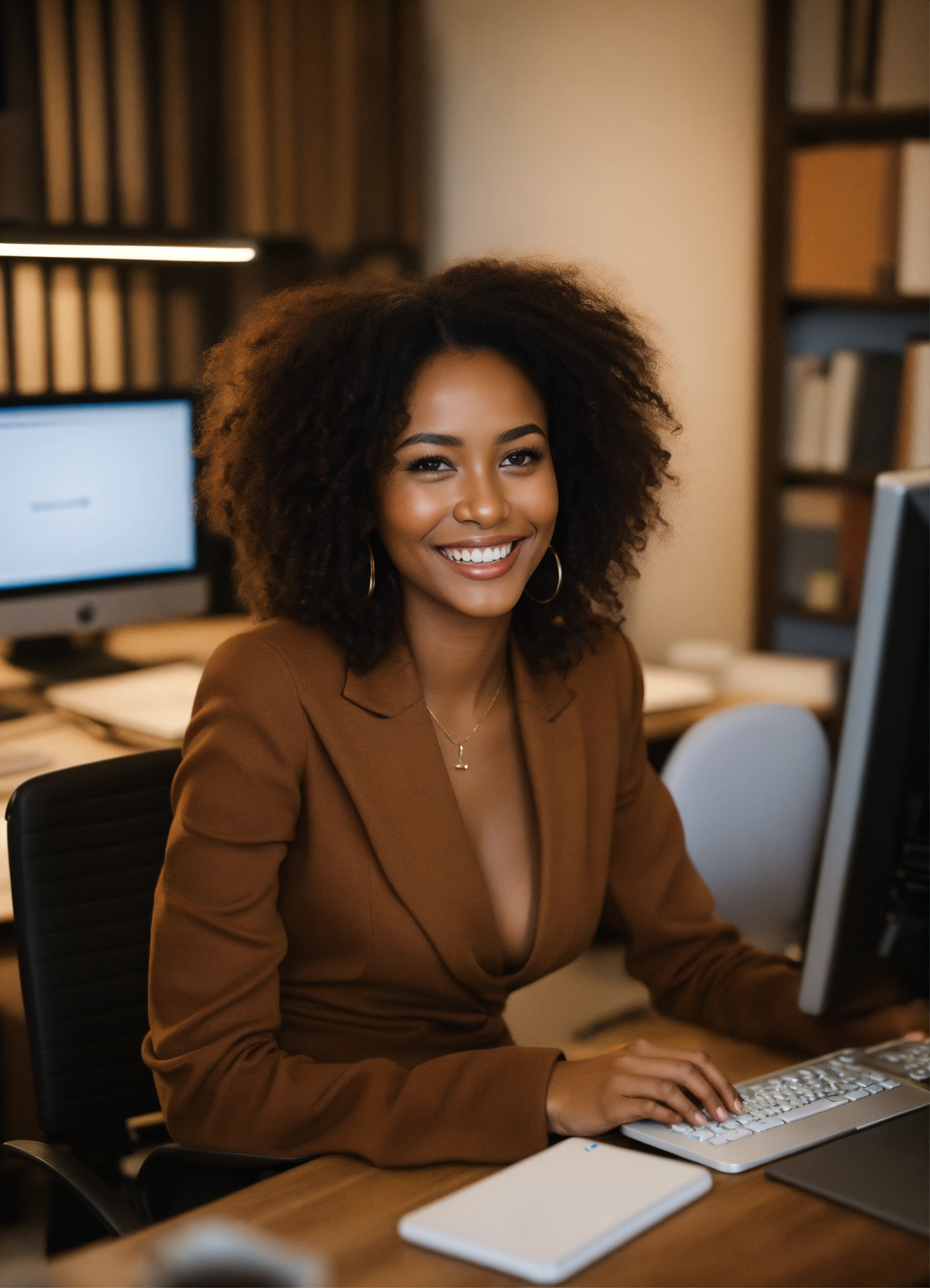 Stunning brown lady sitting in the office smiling