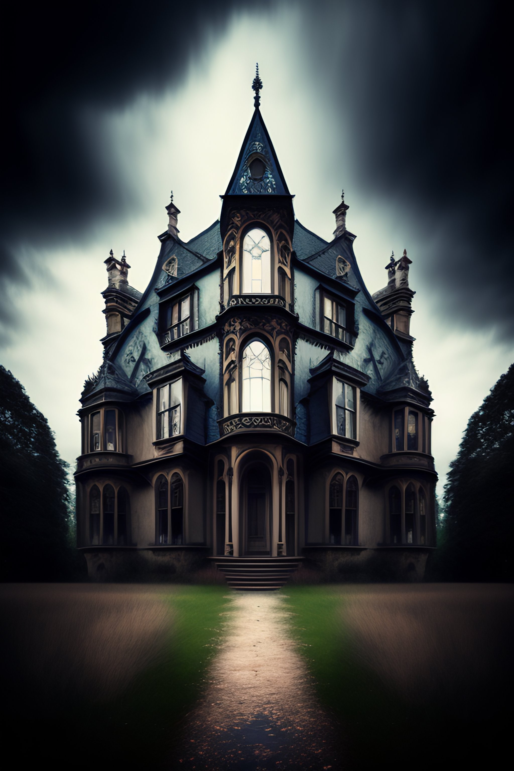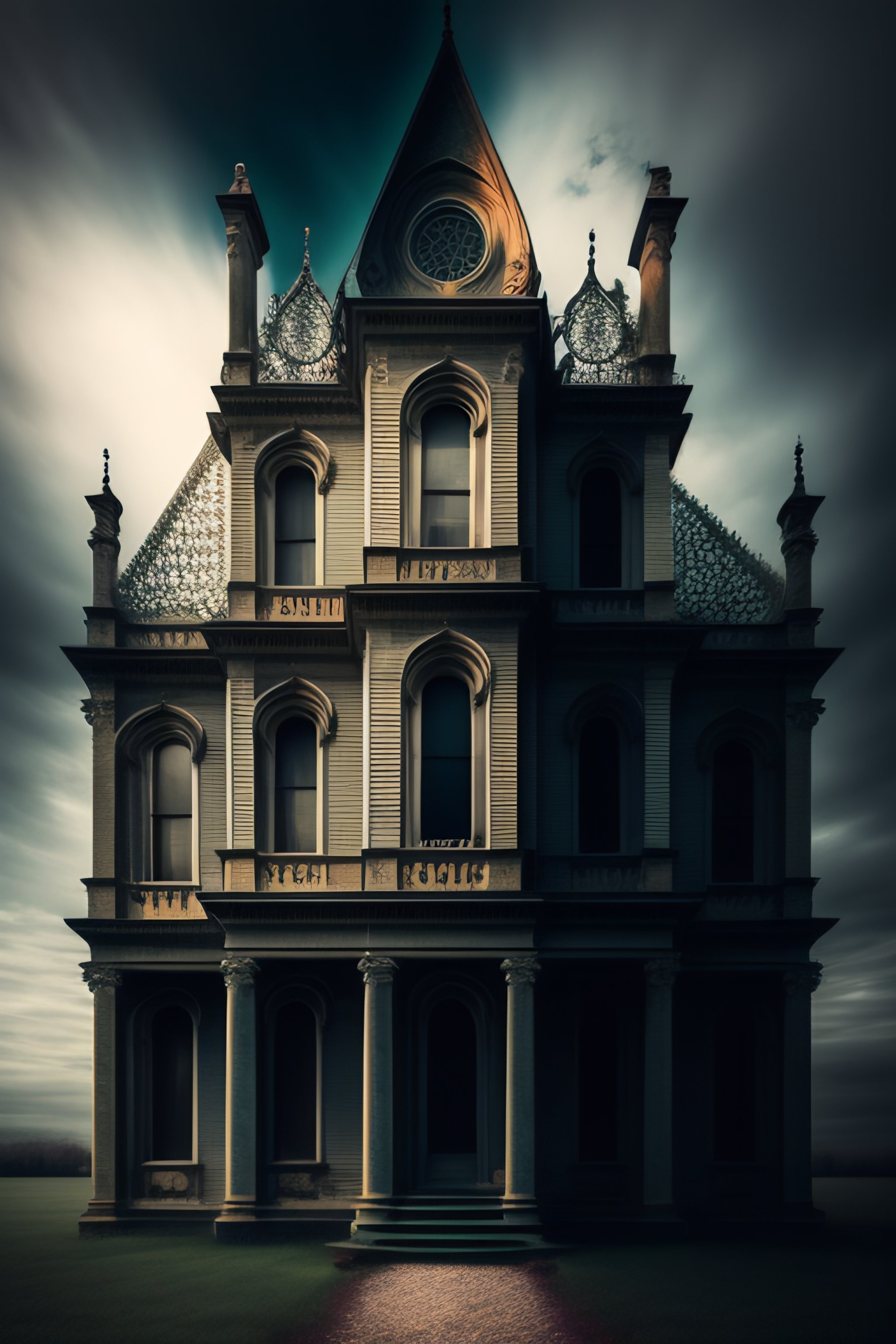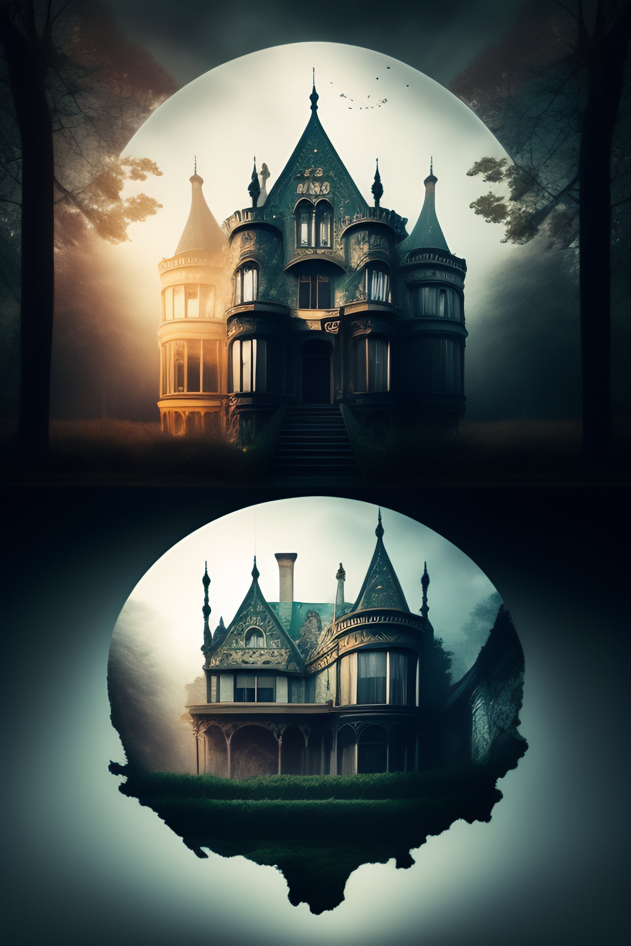 Surrealism dark emotional and romantic broken down haunted gothic mansion double exposure texture