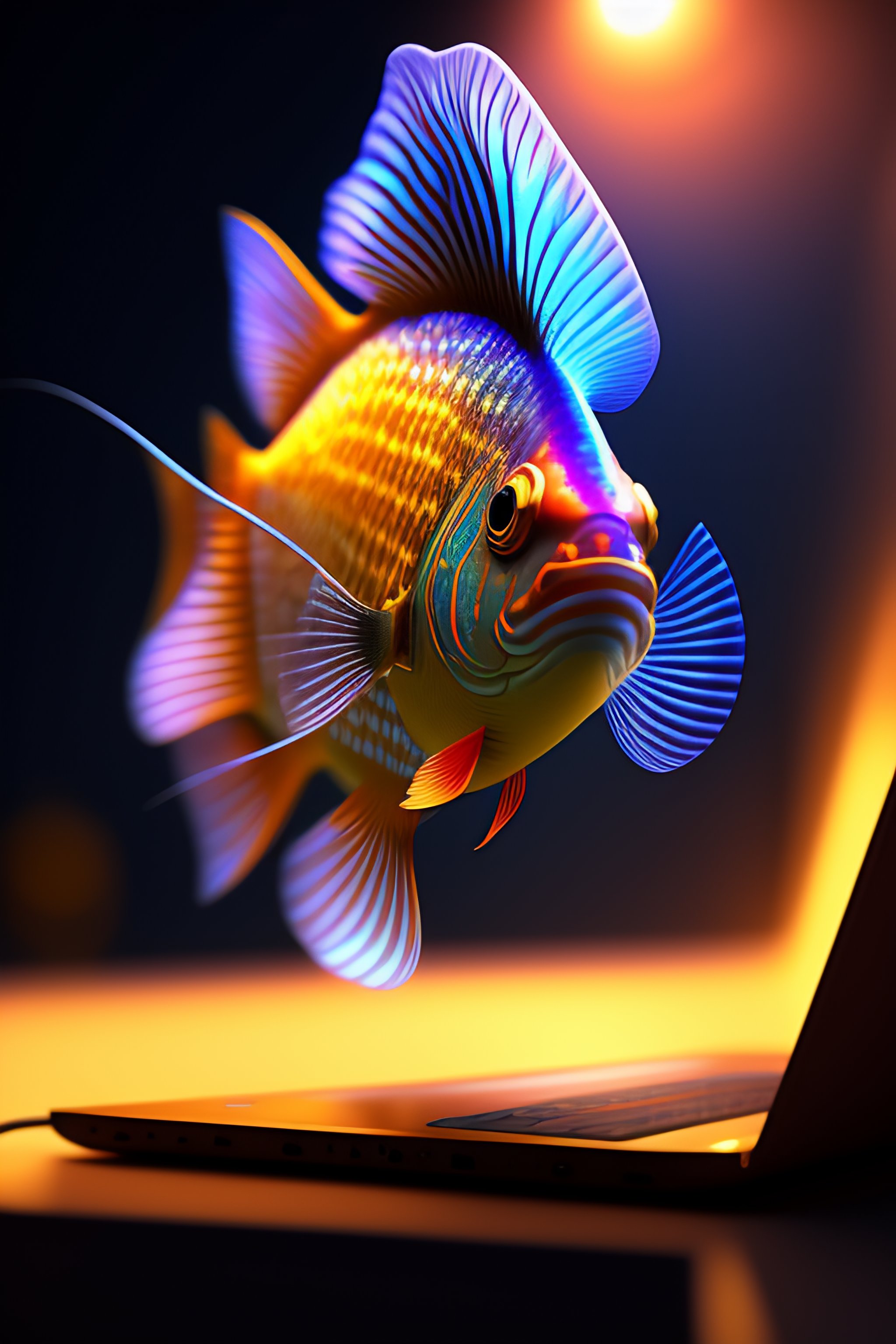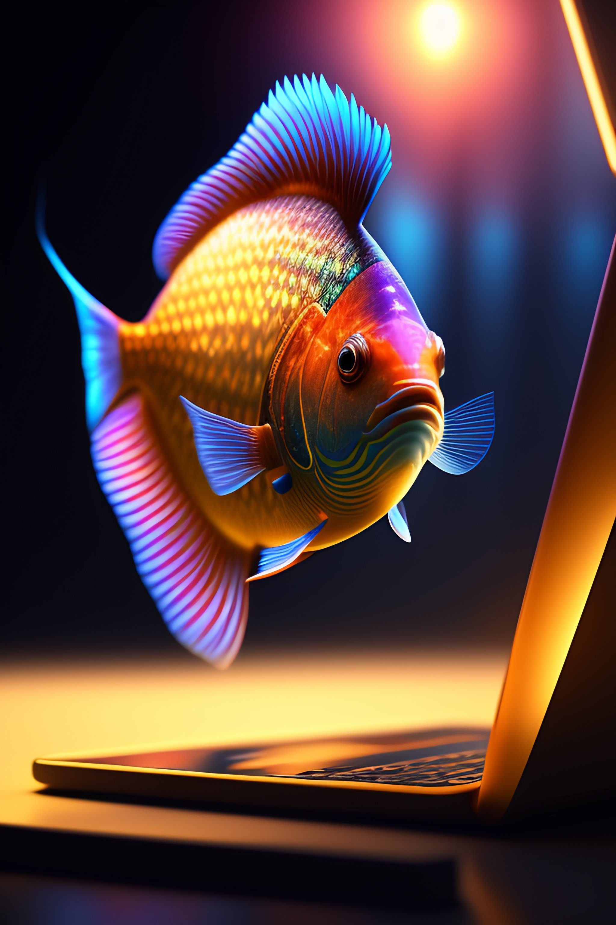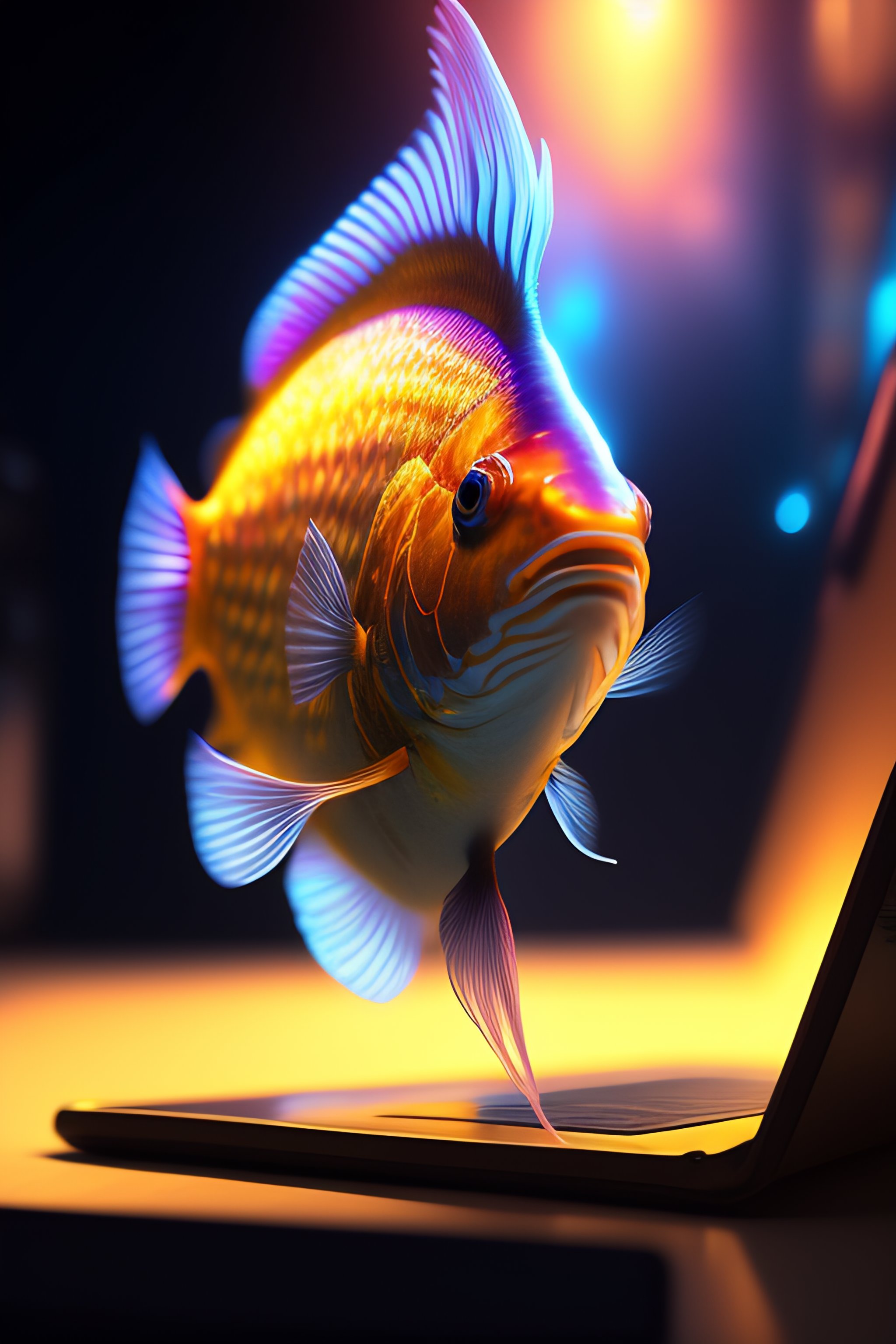 A fuzzy fish coding in a laptop from a coworking space in ny, glowing, prismatic, pearlescent, shimmering, highly detailed, concept art, cinema lighting, digital painting, unreal engine, smooth, sharp focus, illustration, trending on artstation, art by artgerm and greg rutkowski and alphonse mucha and craig mullins