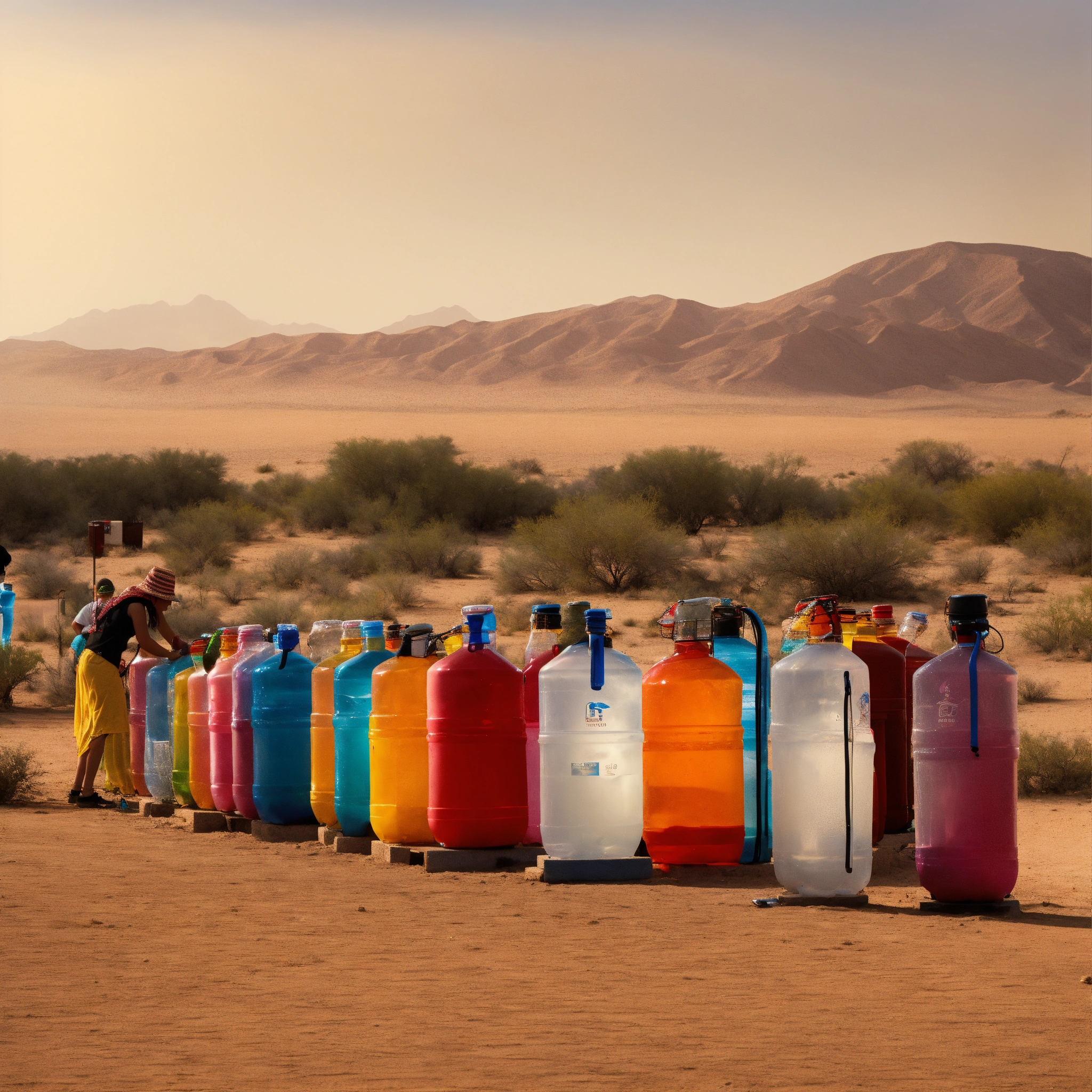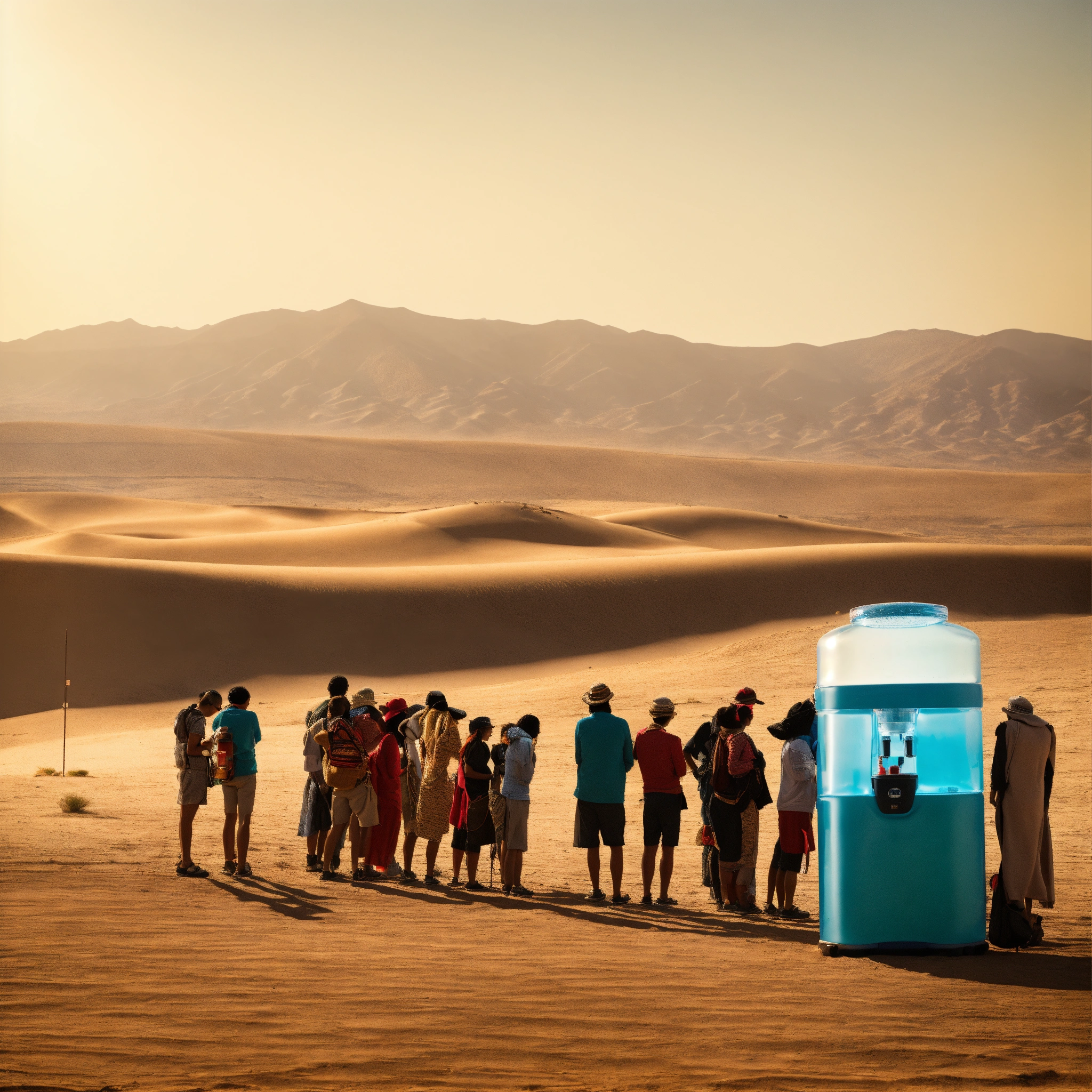 a line of people queue up for a water cooler like a big glass water bottle.