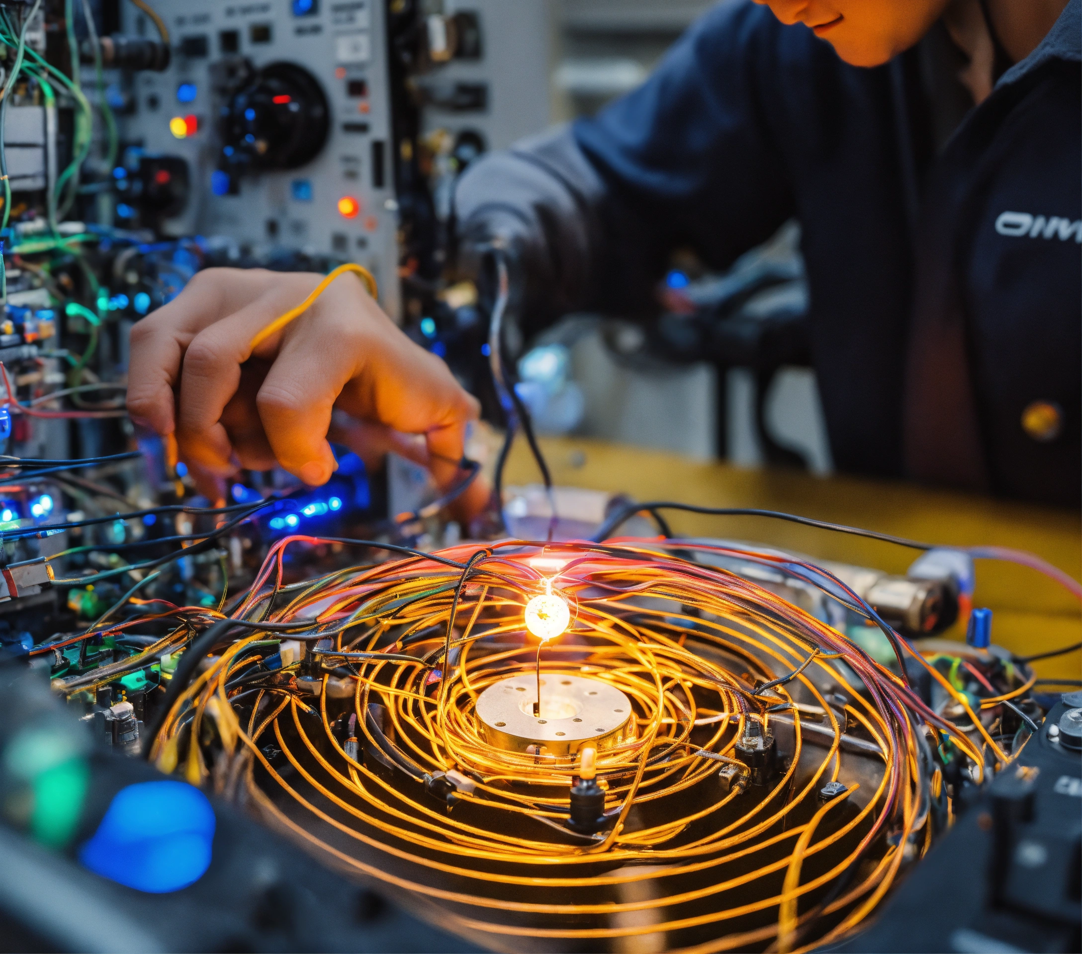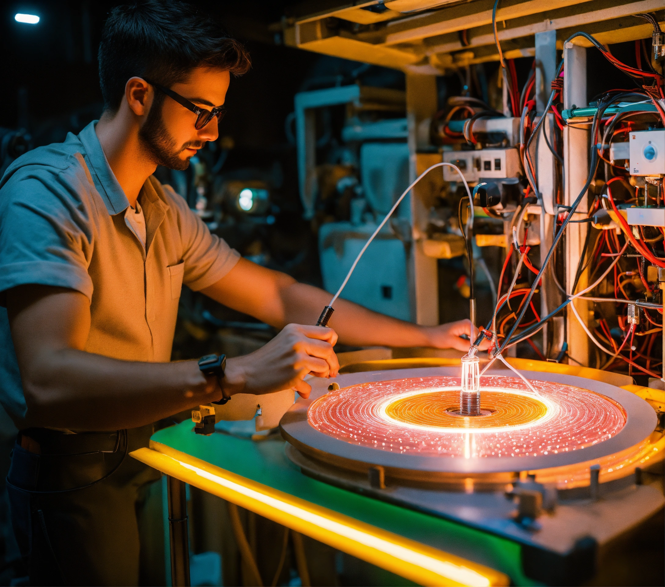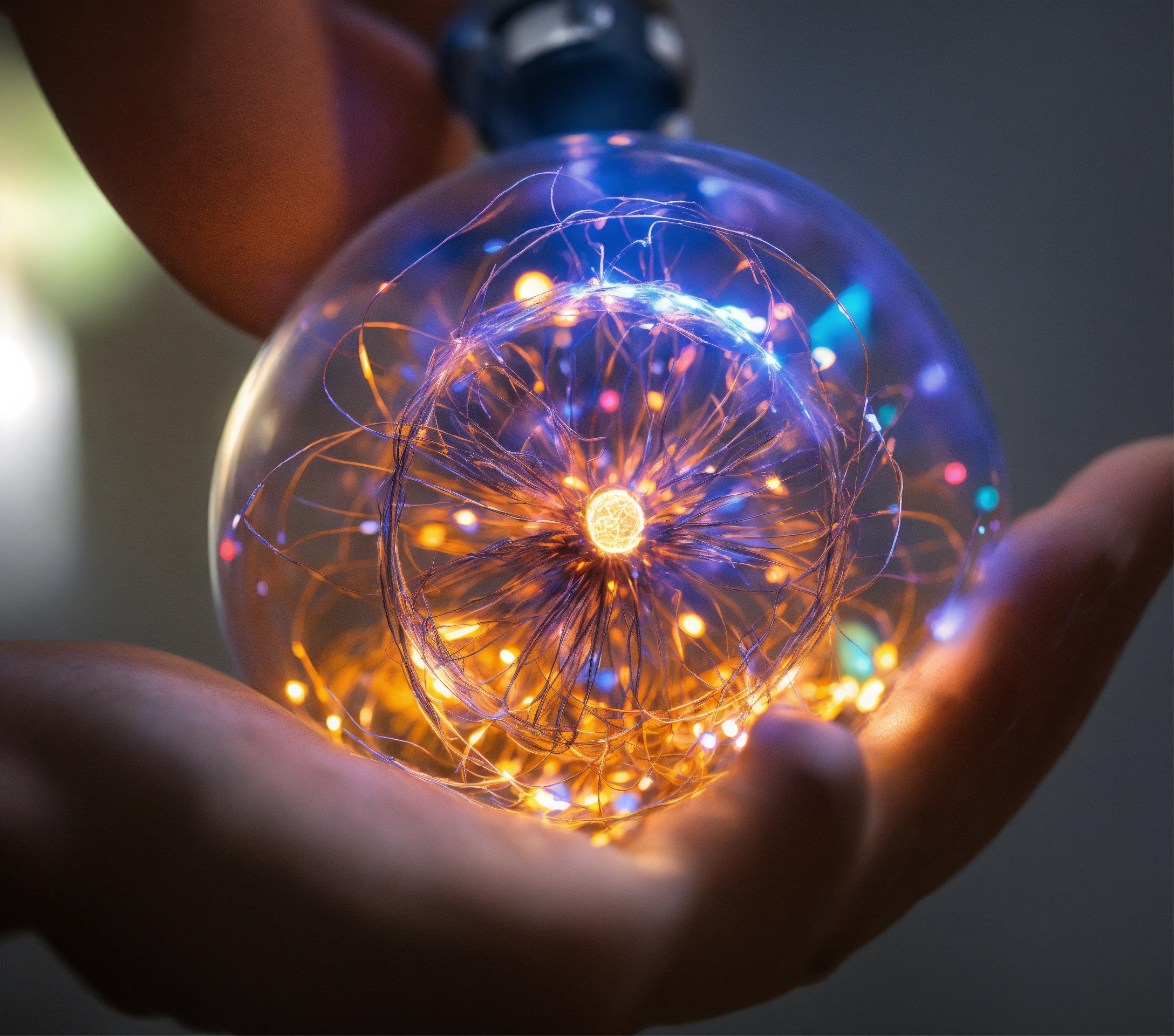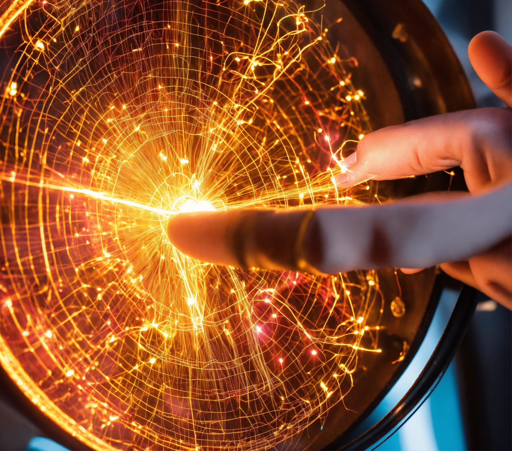 Una mano sosteniendo un pequeño dispositivo cuantico electron invertido spin down -1/2 con formacion de campo electrico invertido disrrupción de particula fermionica bicónica en el baricentro