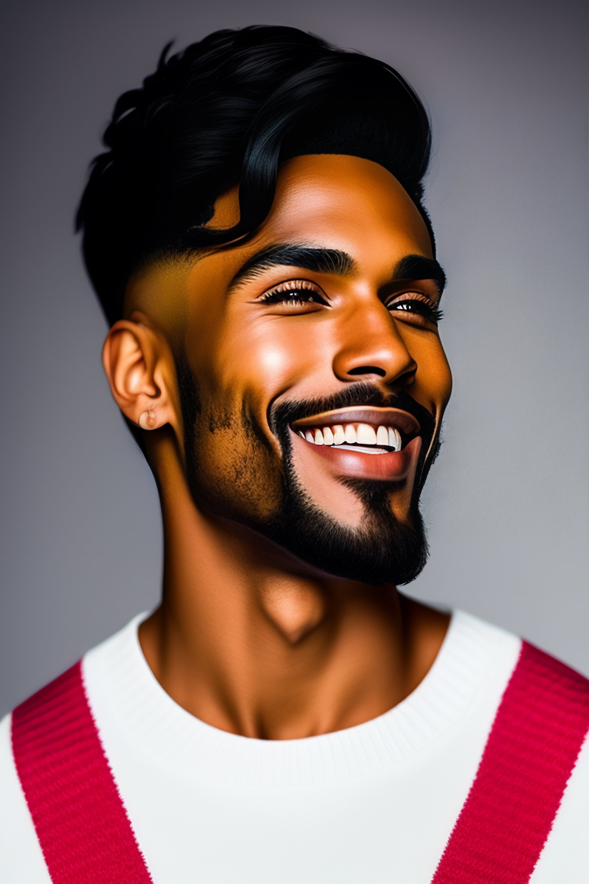 A beautiful man with short black hair, big eyes, a patchy beard, laughing, white teeth, a beautiful sharp nose, scarlet eyes