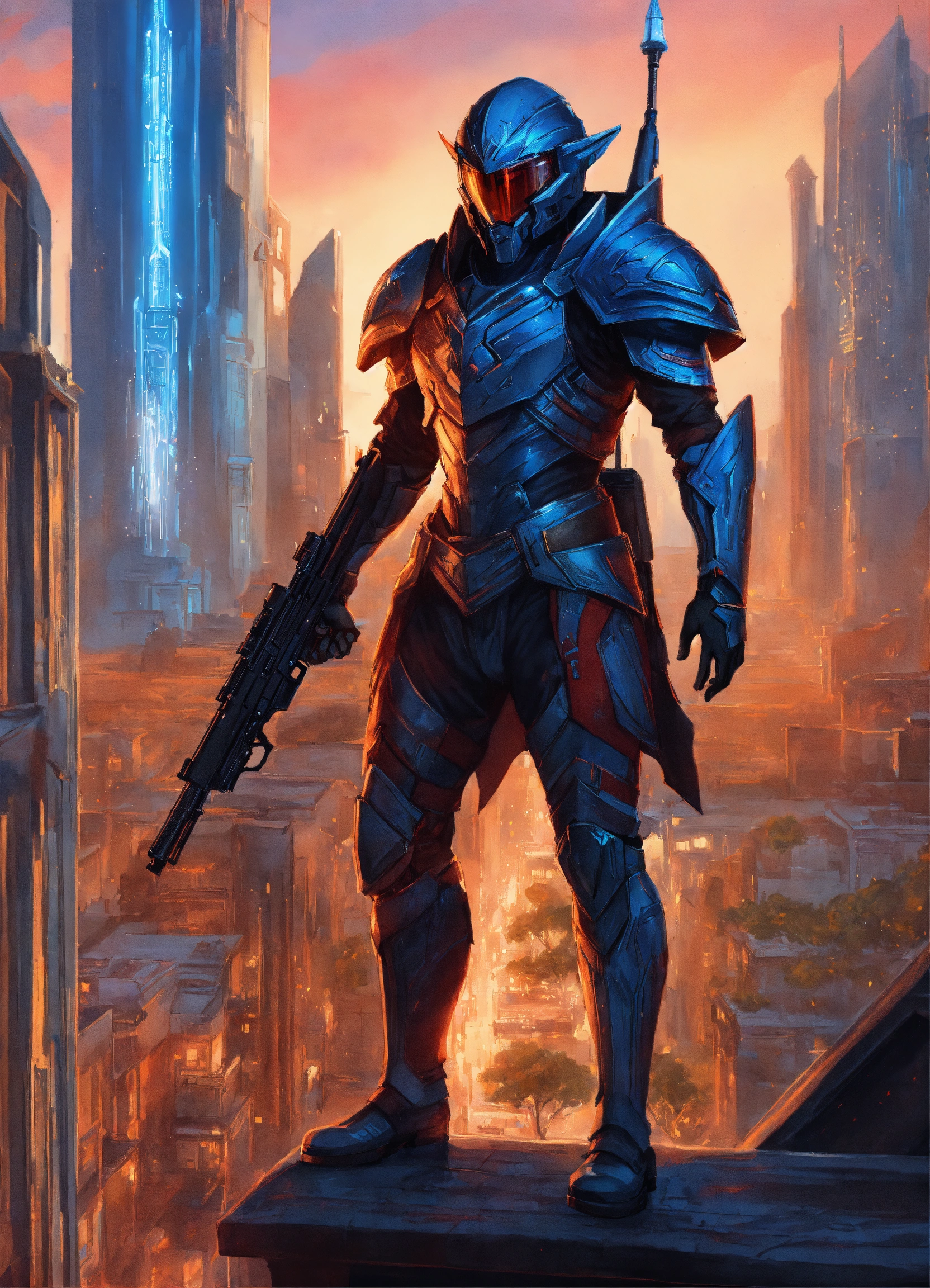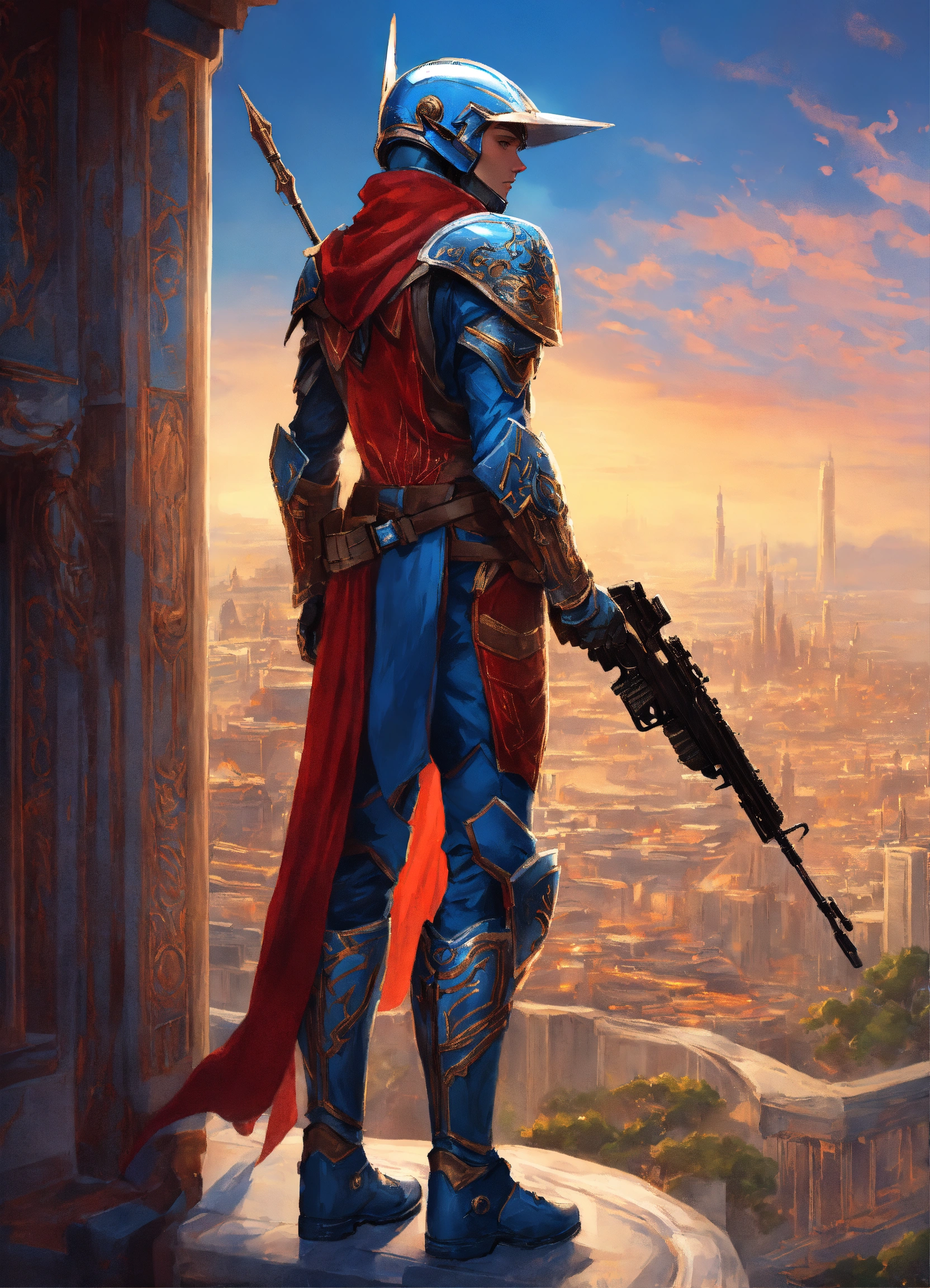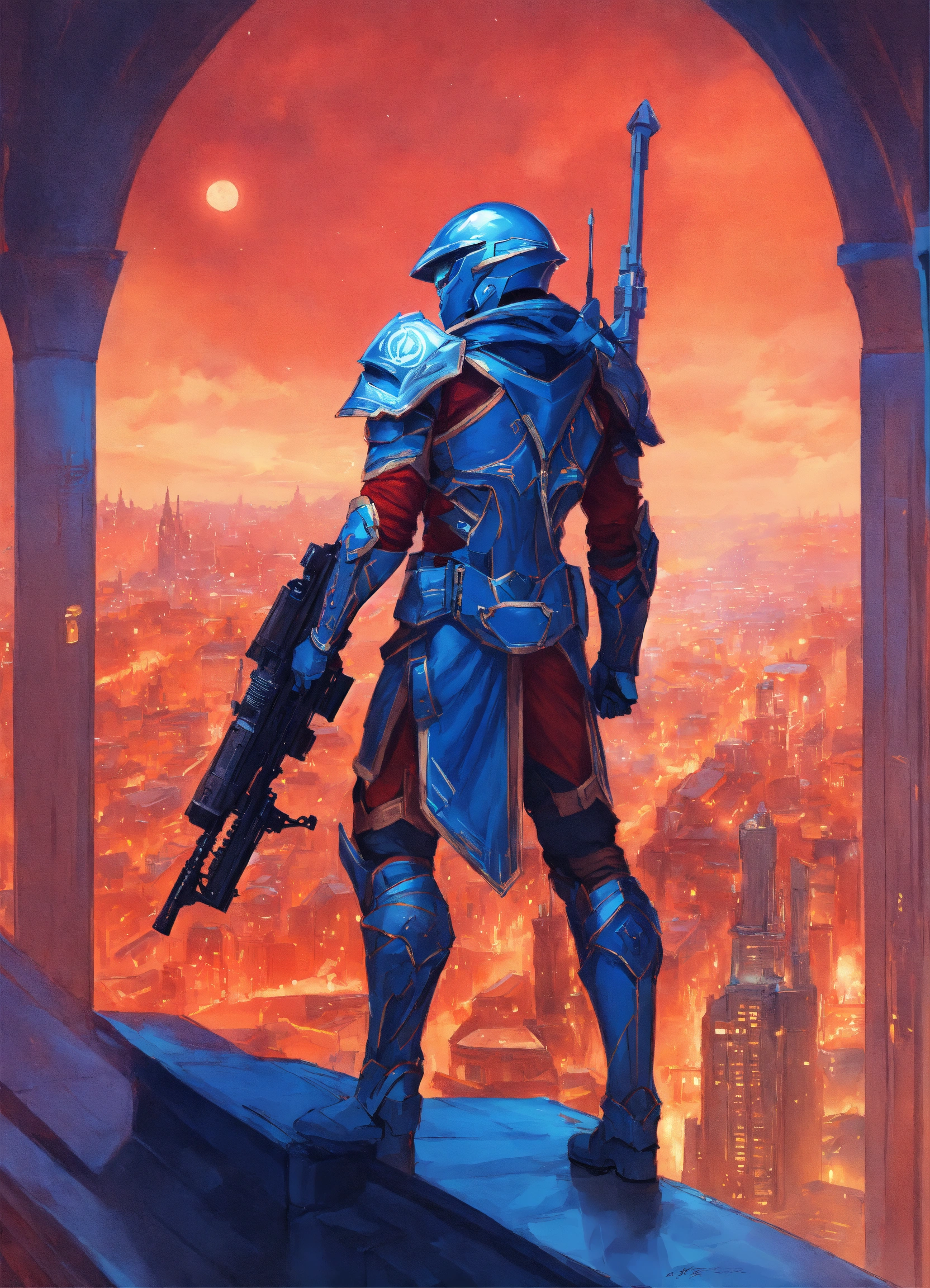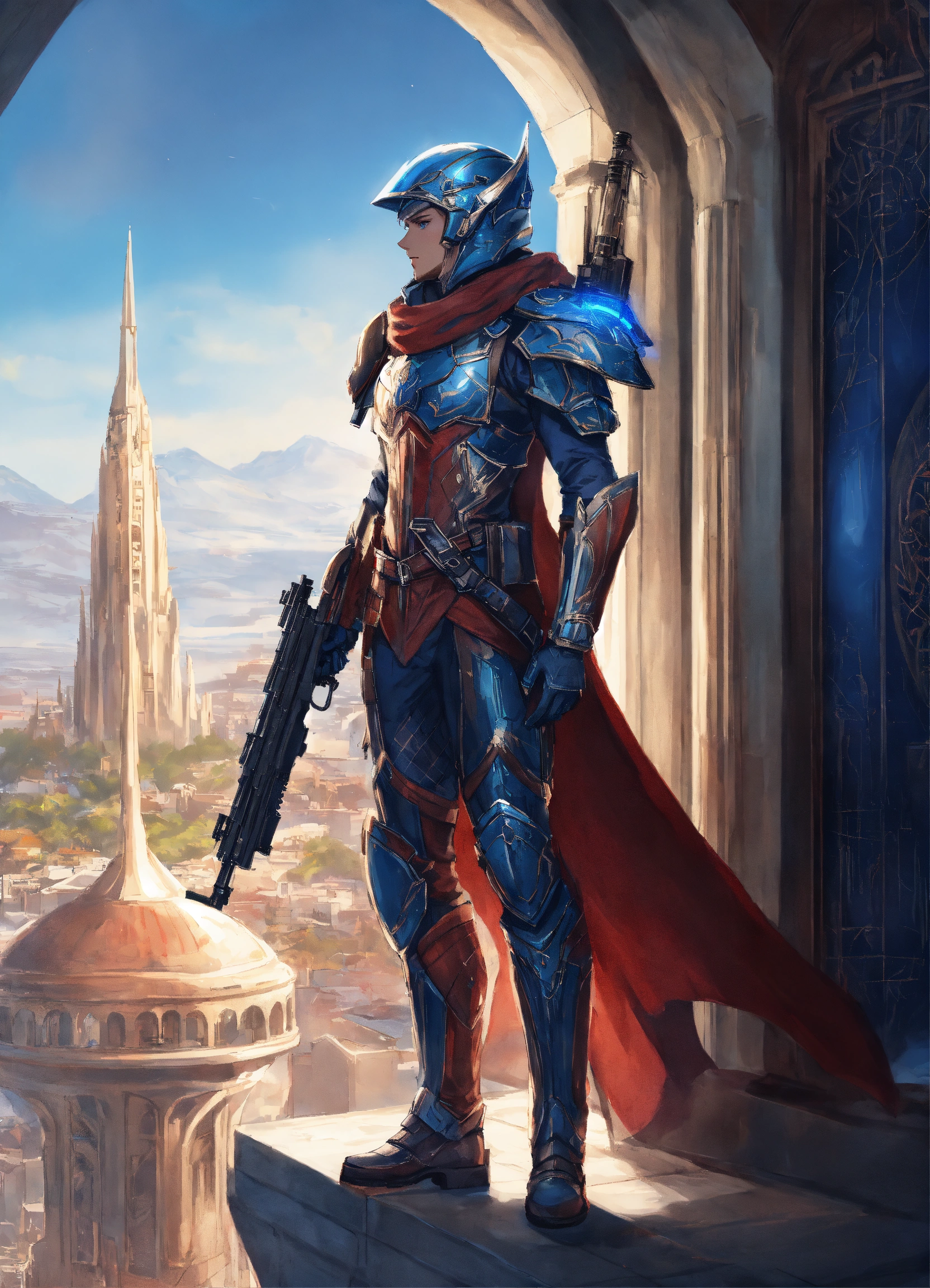 Epic drawing of a full body of a high elf sci fi soldier wearing sci fi armor, blue and light red sci fi armor and helmet, boots, male, holding a machine gun, standing on a balcony overlooking an elven city