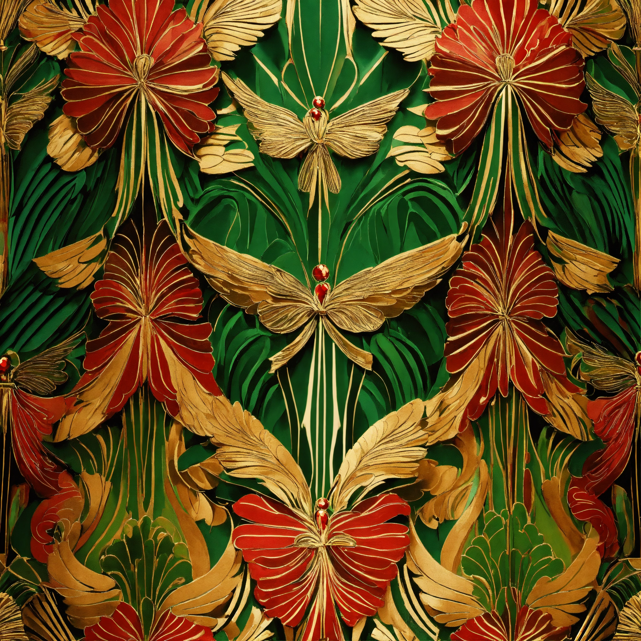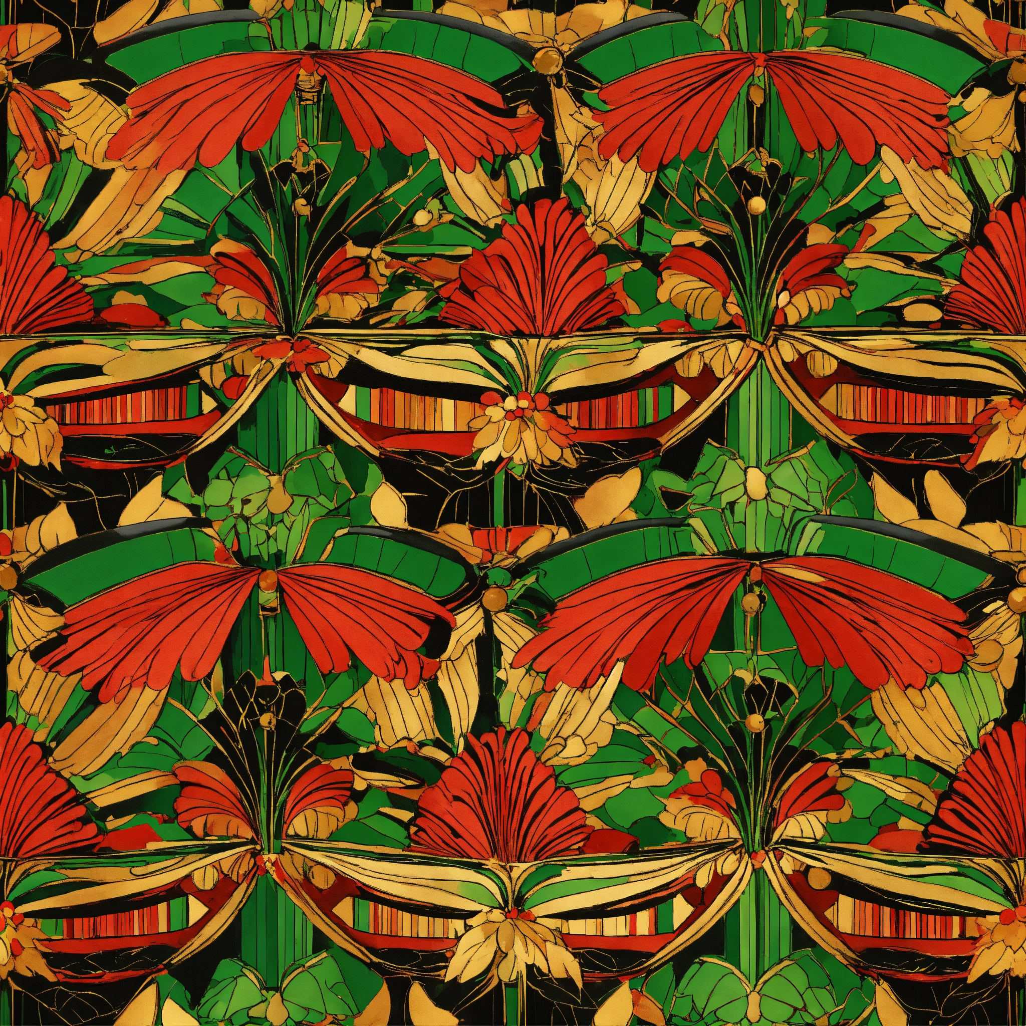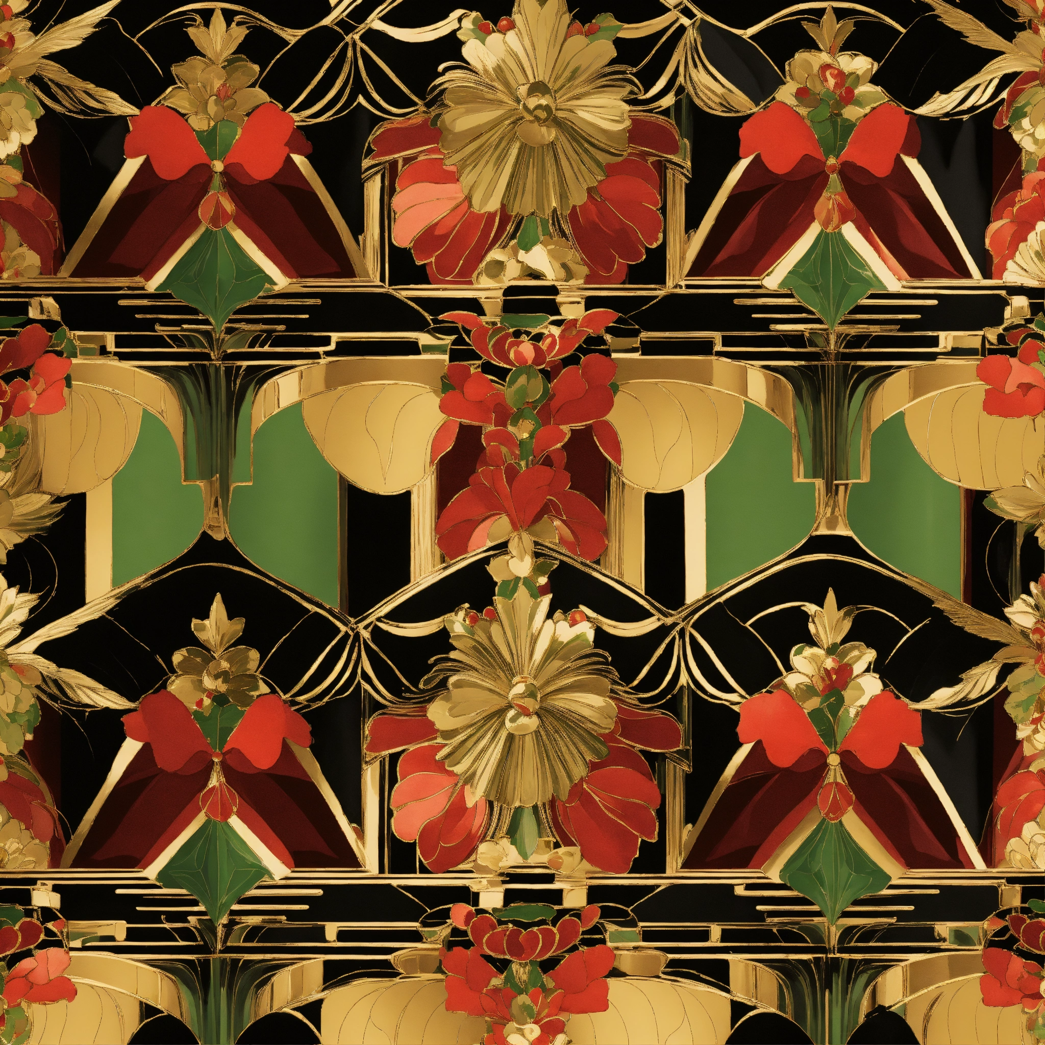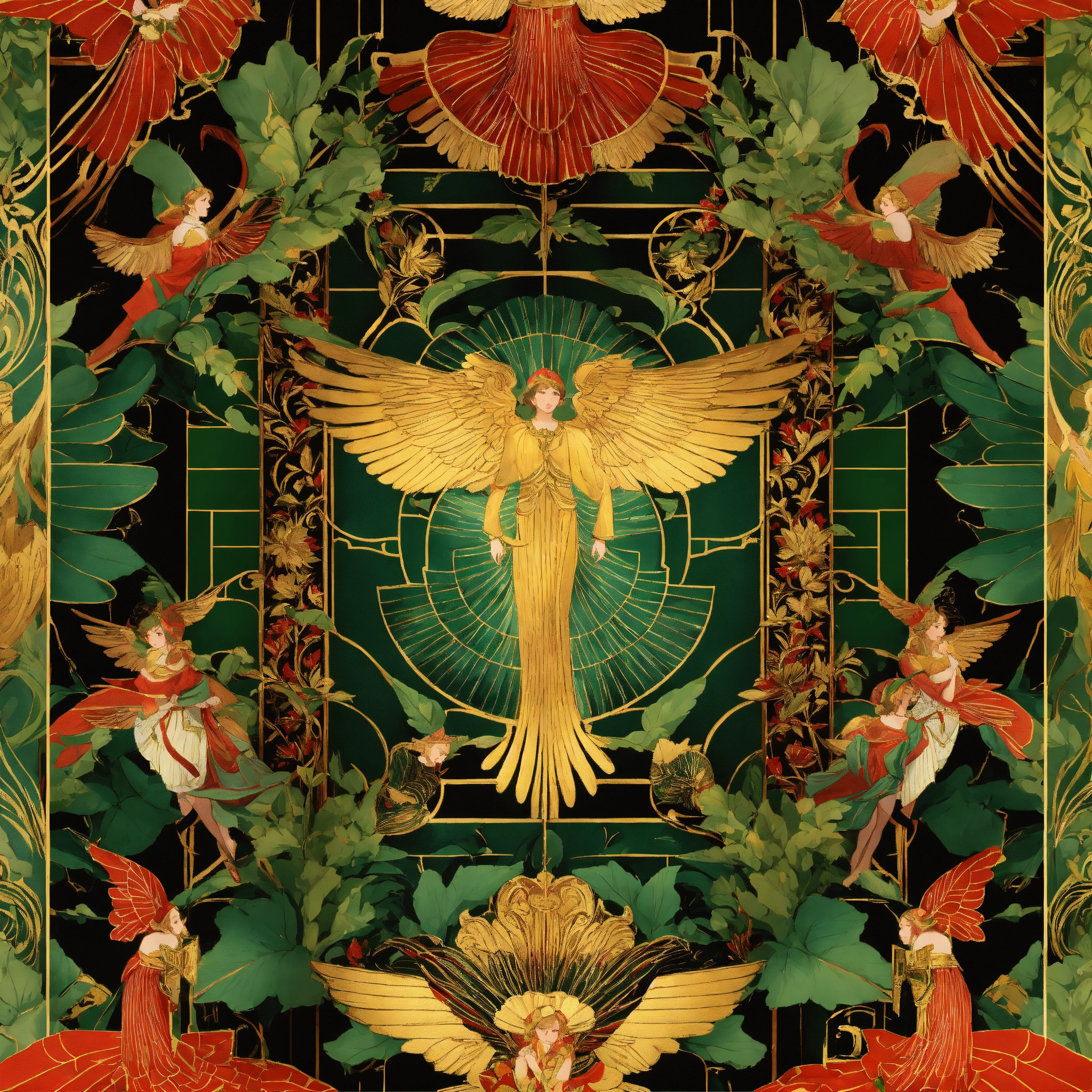 Repeating pattern create 24 black angels, that embody christmas, 4d, vibrant greens, reds, and golds, art deco, each image should be individual