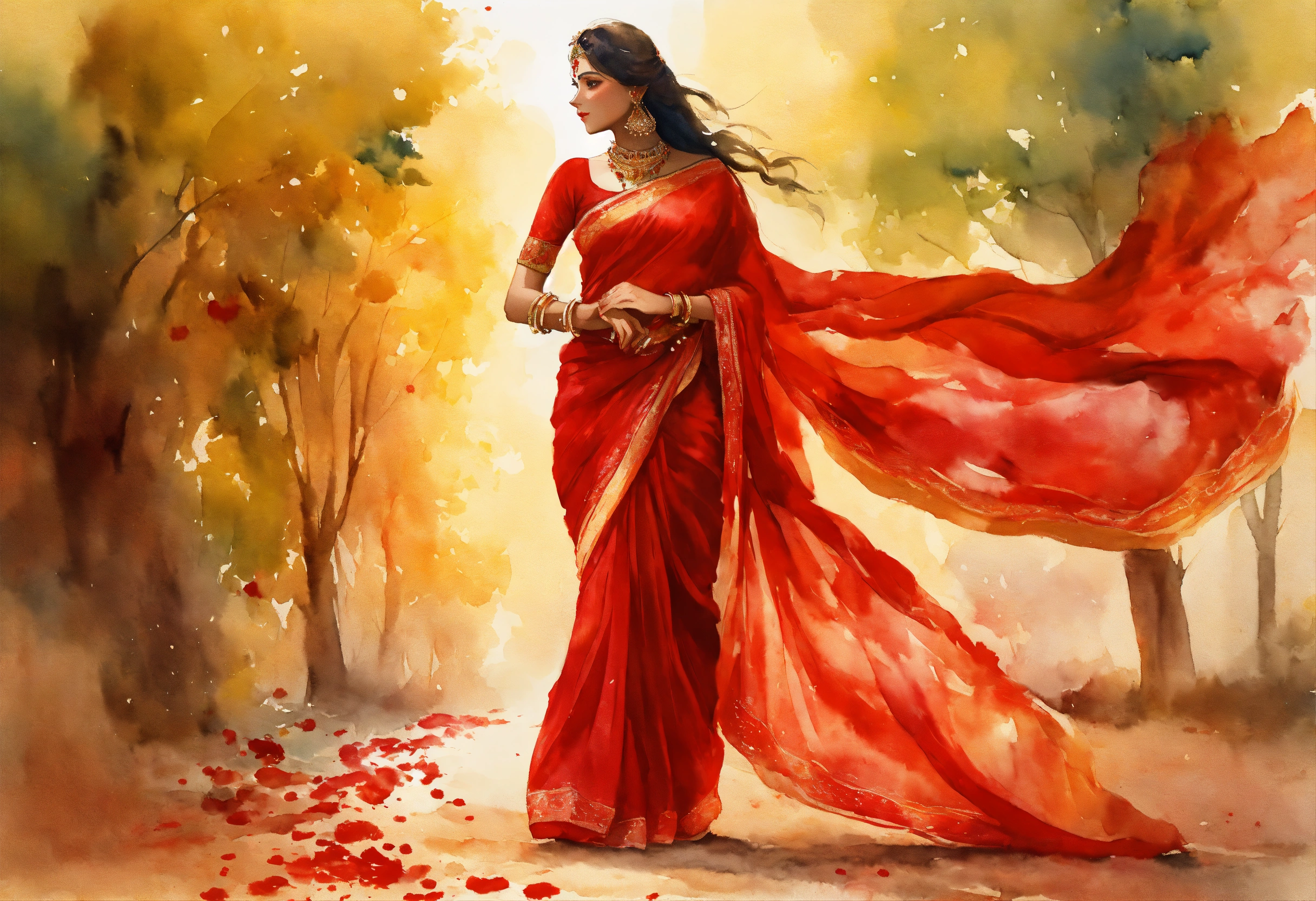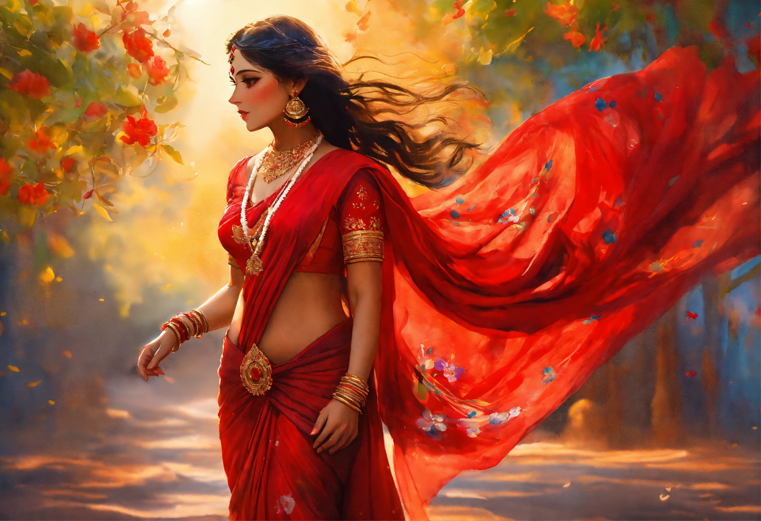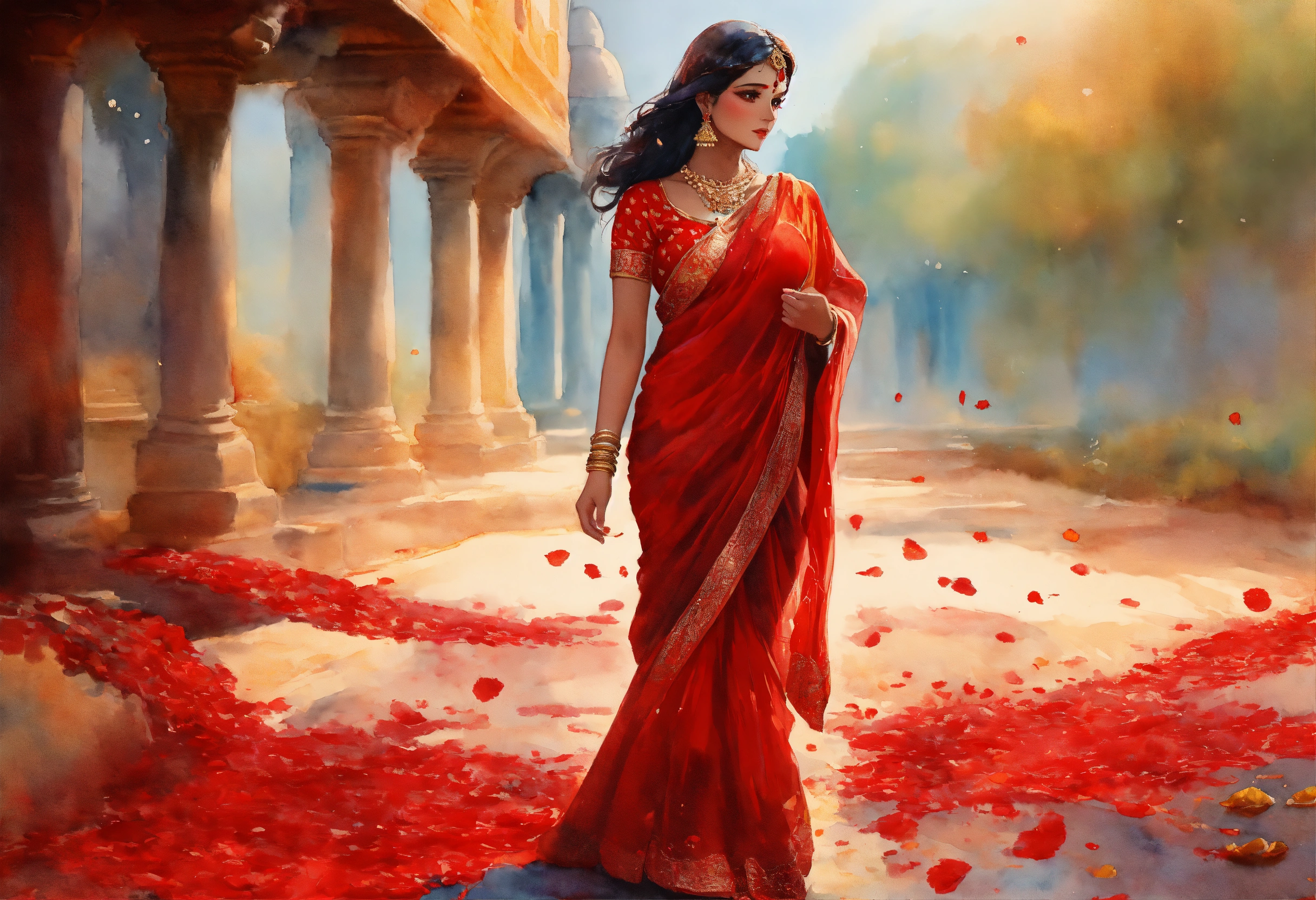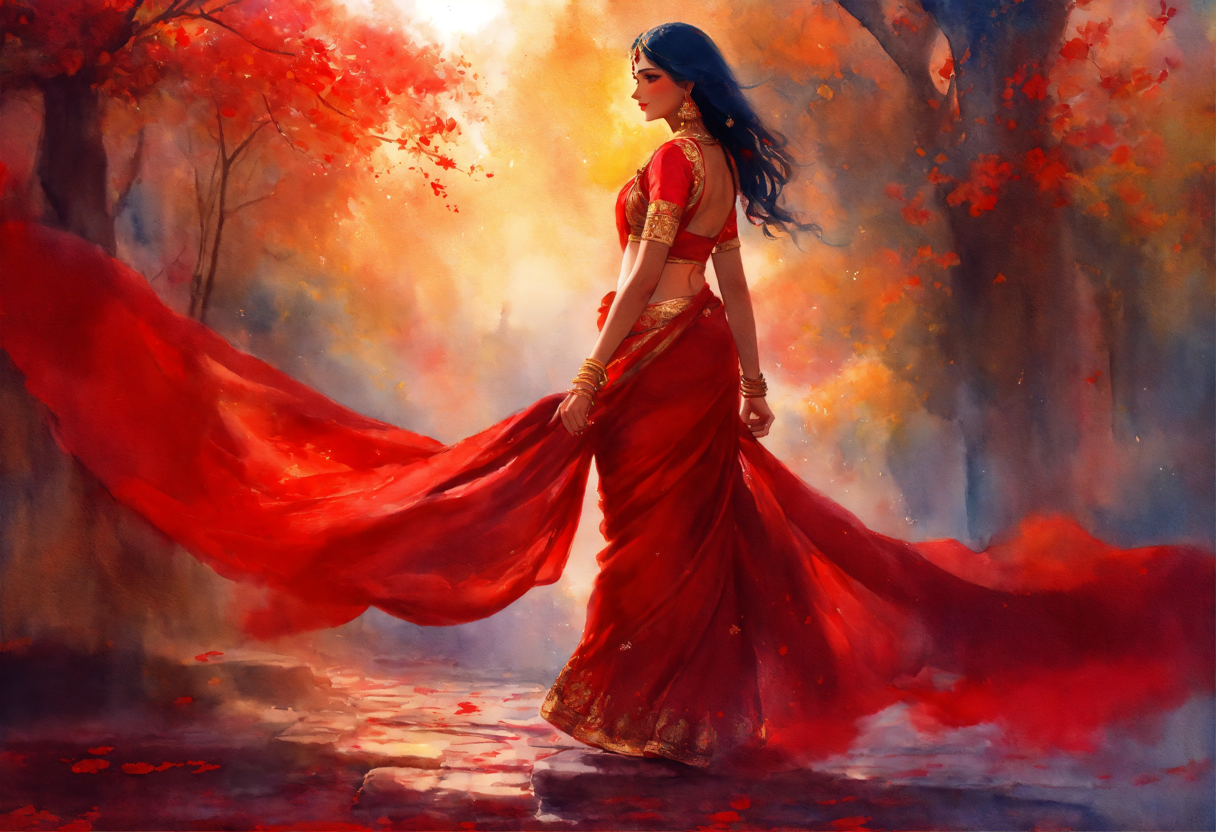 Indian goddess radha leaves a trail of vibrant red footprints as she gracefully walks in her stunning red saree, filling the scene with her divine presence. the watercolor strokes depict the ethereal beauty of this sacred moment. 8k