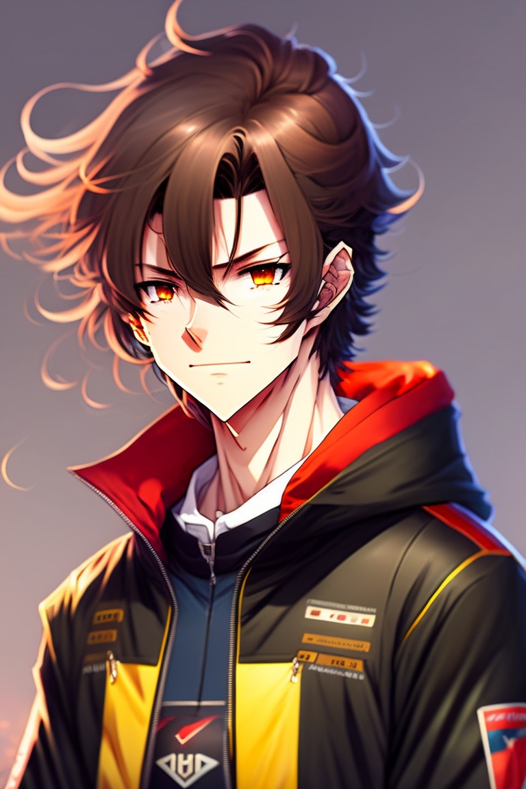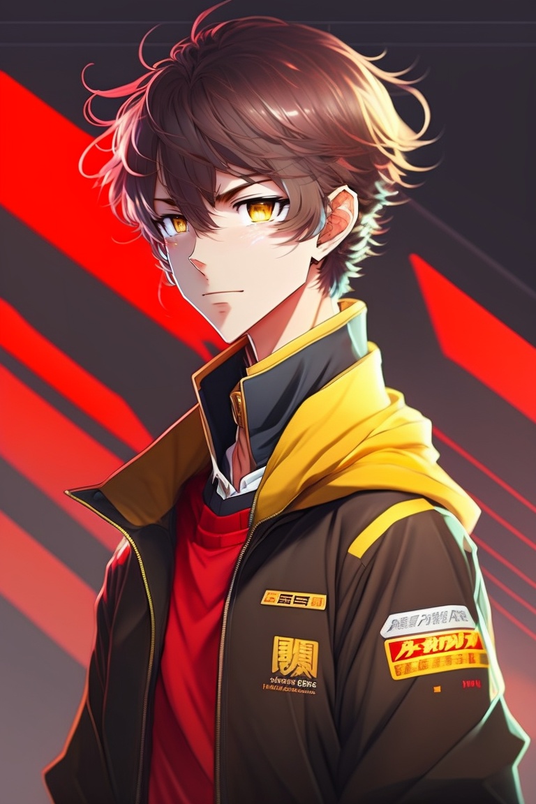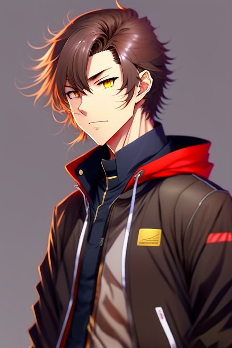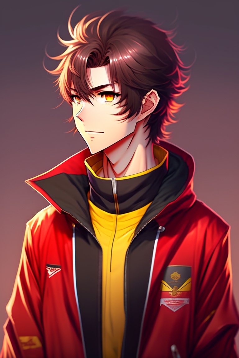 Anime boy, brown hair, ponytail hair, yellow eyes, red t-shirt, black jacket, takeuchi takashi style, looking até the viewer