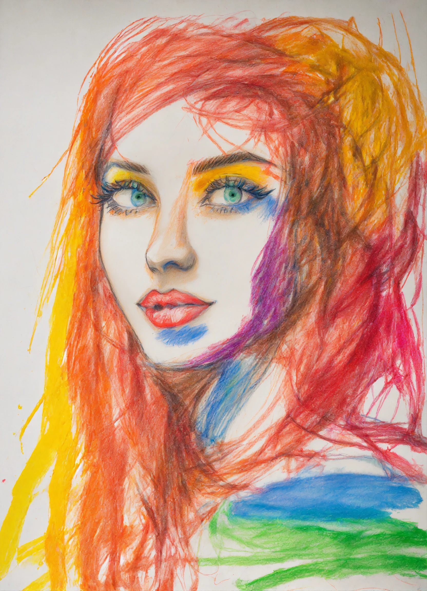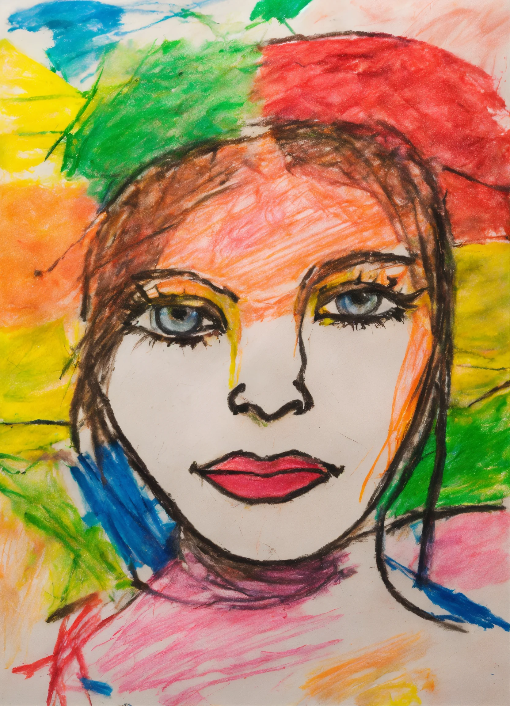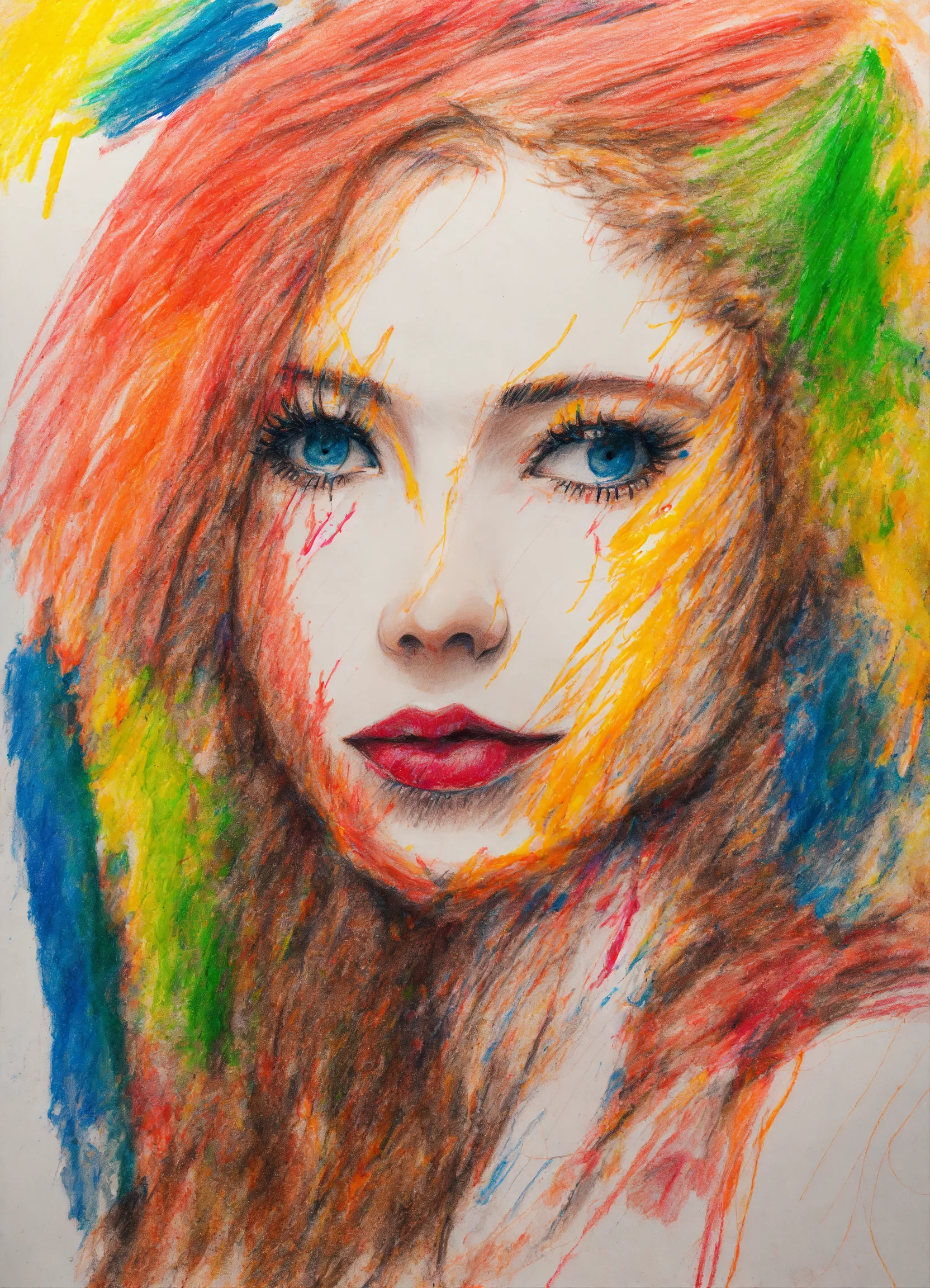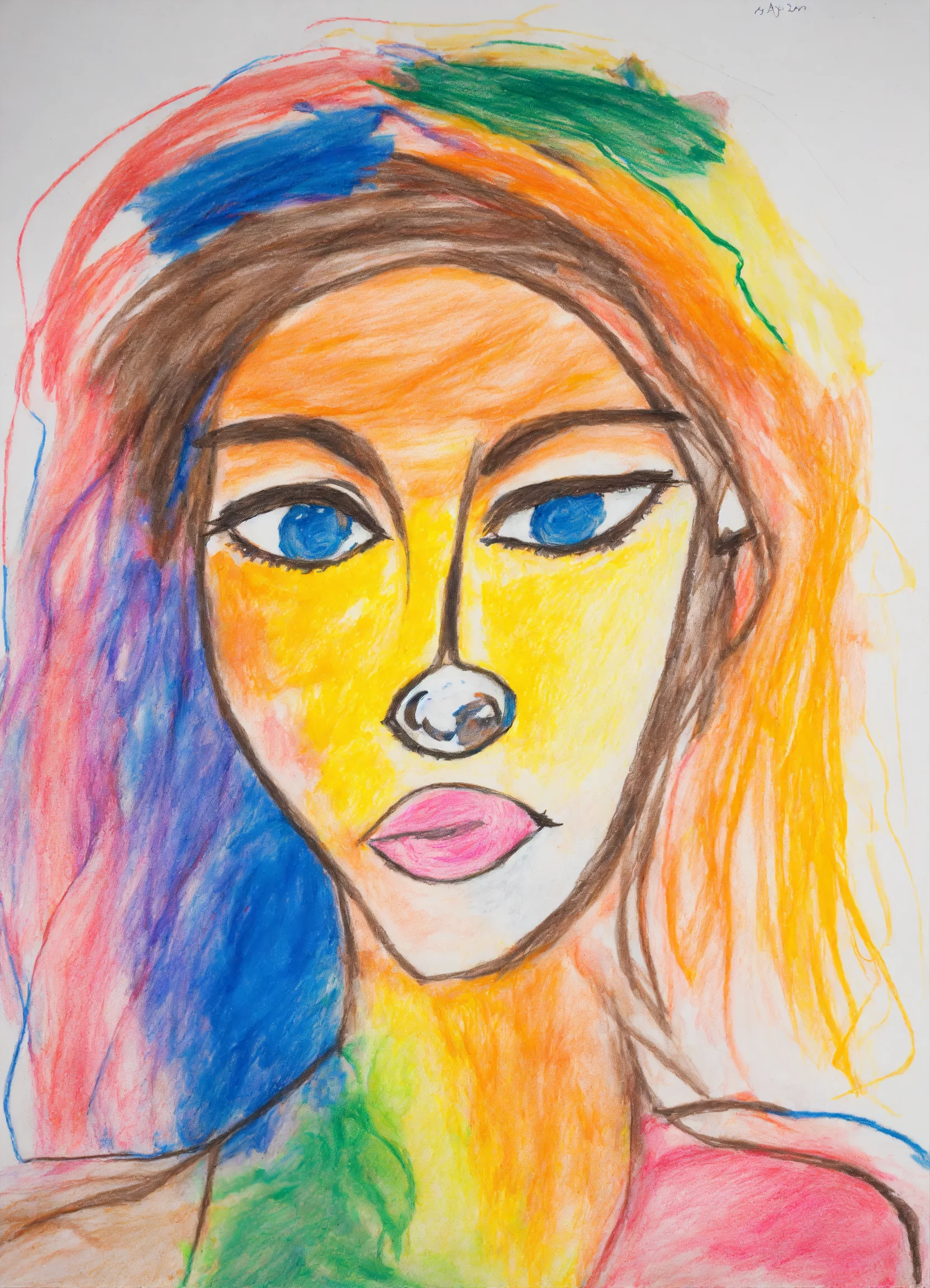 Messy ugly colorful crayon drawing of a pretty woman, crayon drawing. by a 3 year old. white construction paper.