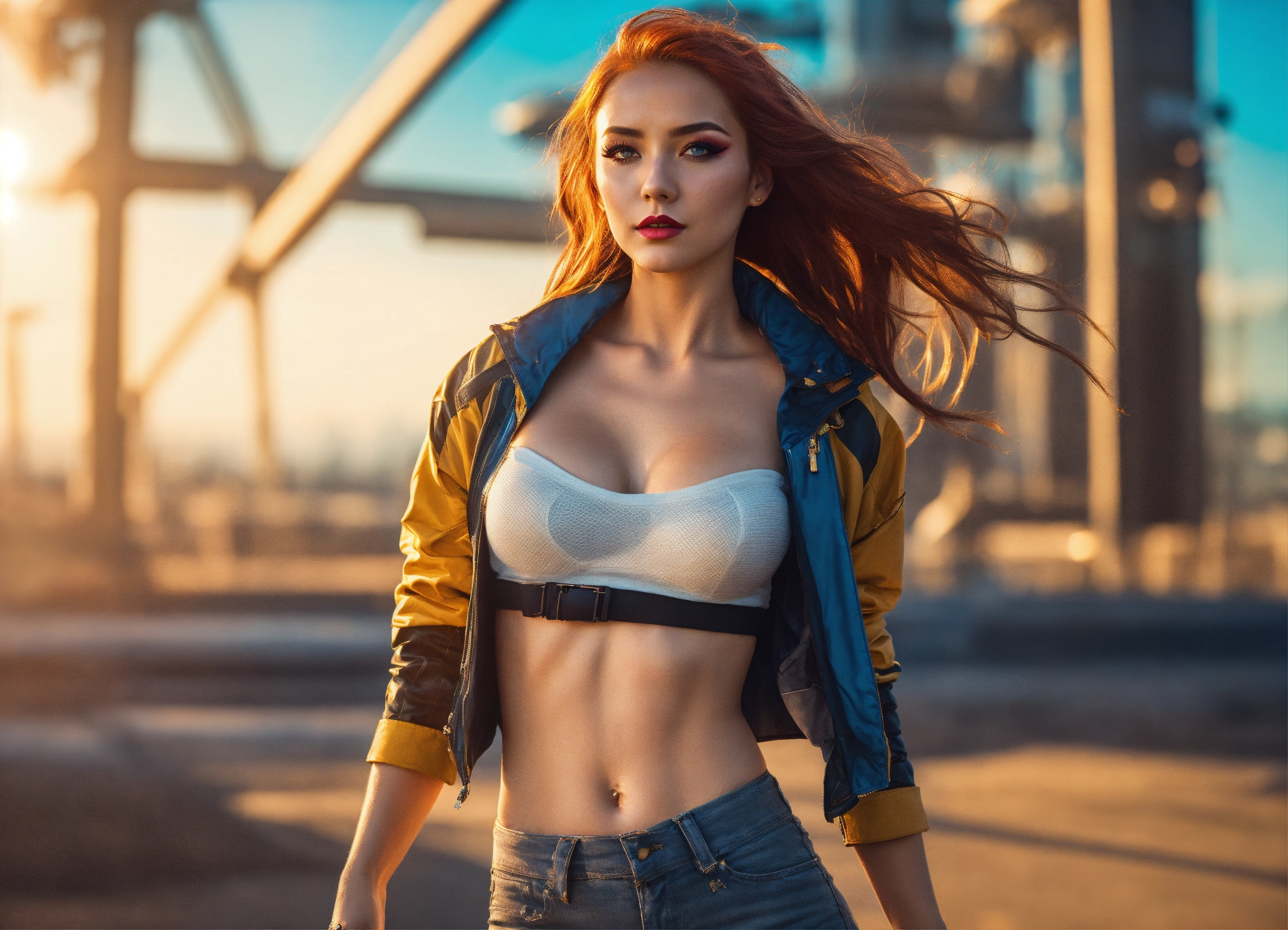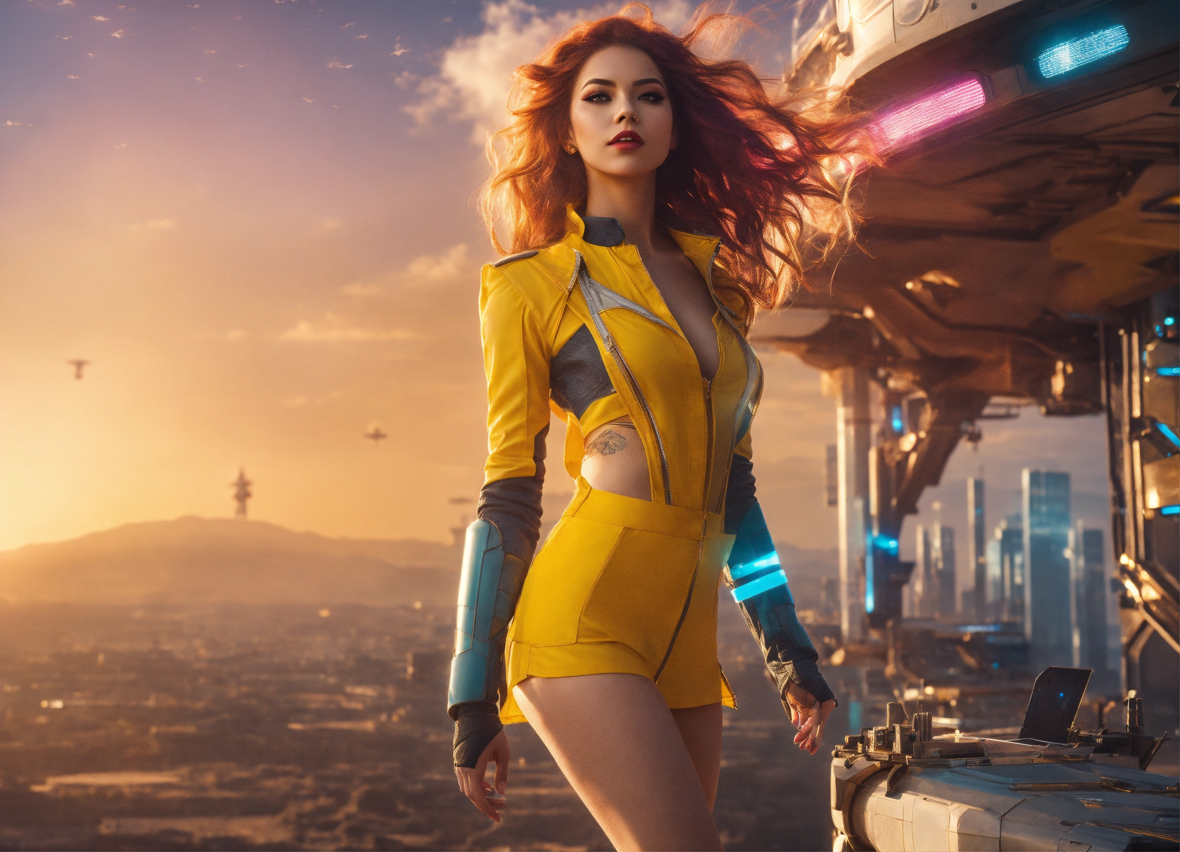 Full body, photo, sci-fi dream girl, futuristic, sunny weather, open shirt, wearing underwaee, 8k, extreme make-up, x-men, there is no gravity