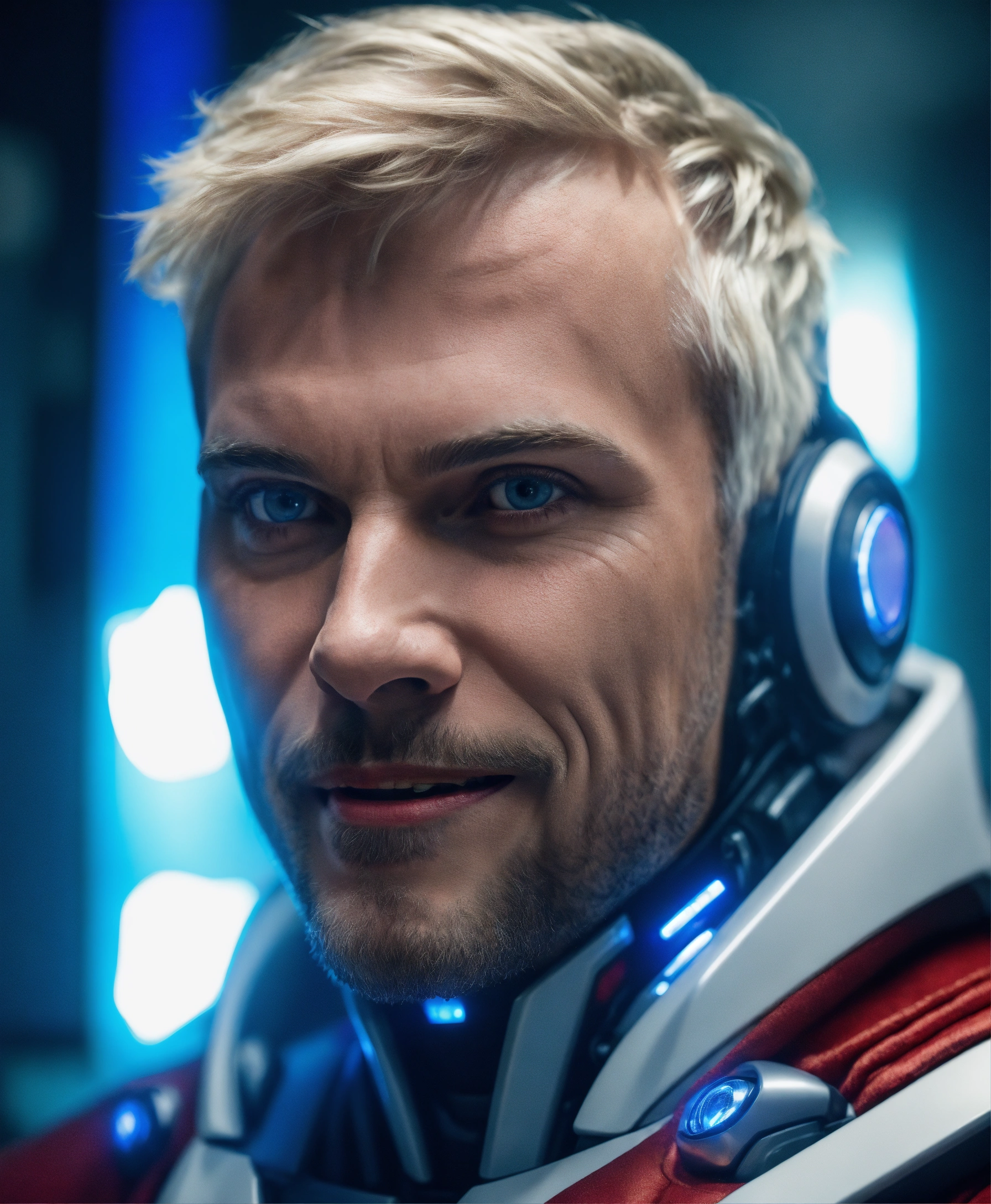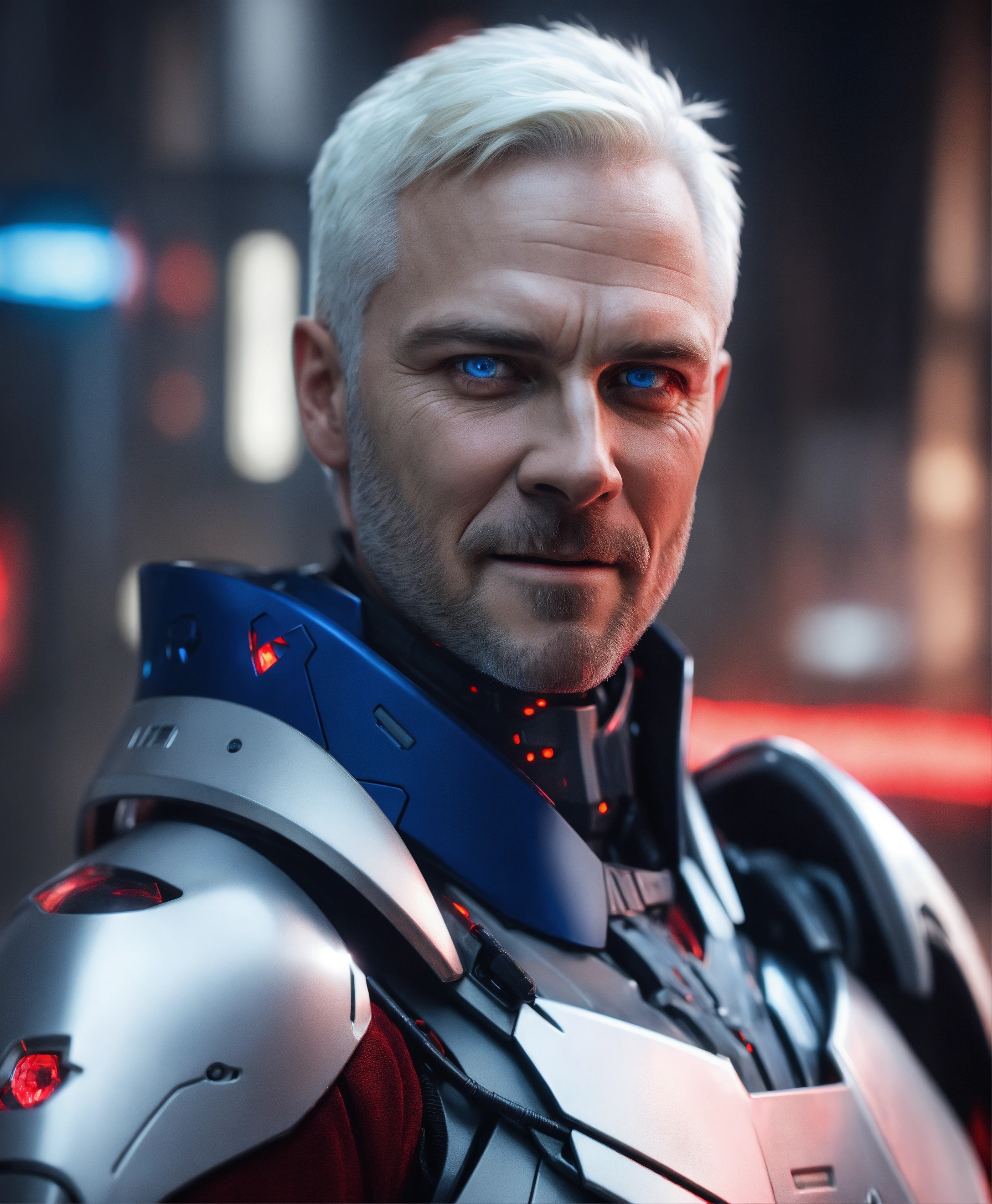 A realistic photo of psychopath 45 years old scary man with deep blue eyes, intimidating traits, creepy psycho smiling face, slim face, sharp nose, white blonde well groomed short hair, angry expression, wearing a white sci-fi robotic armor, with a red cape, dramatic ilumination, hyperrealistic, hyperdetailed, 8 k