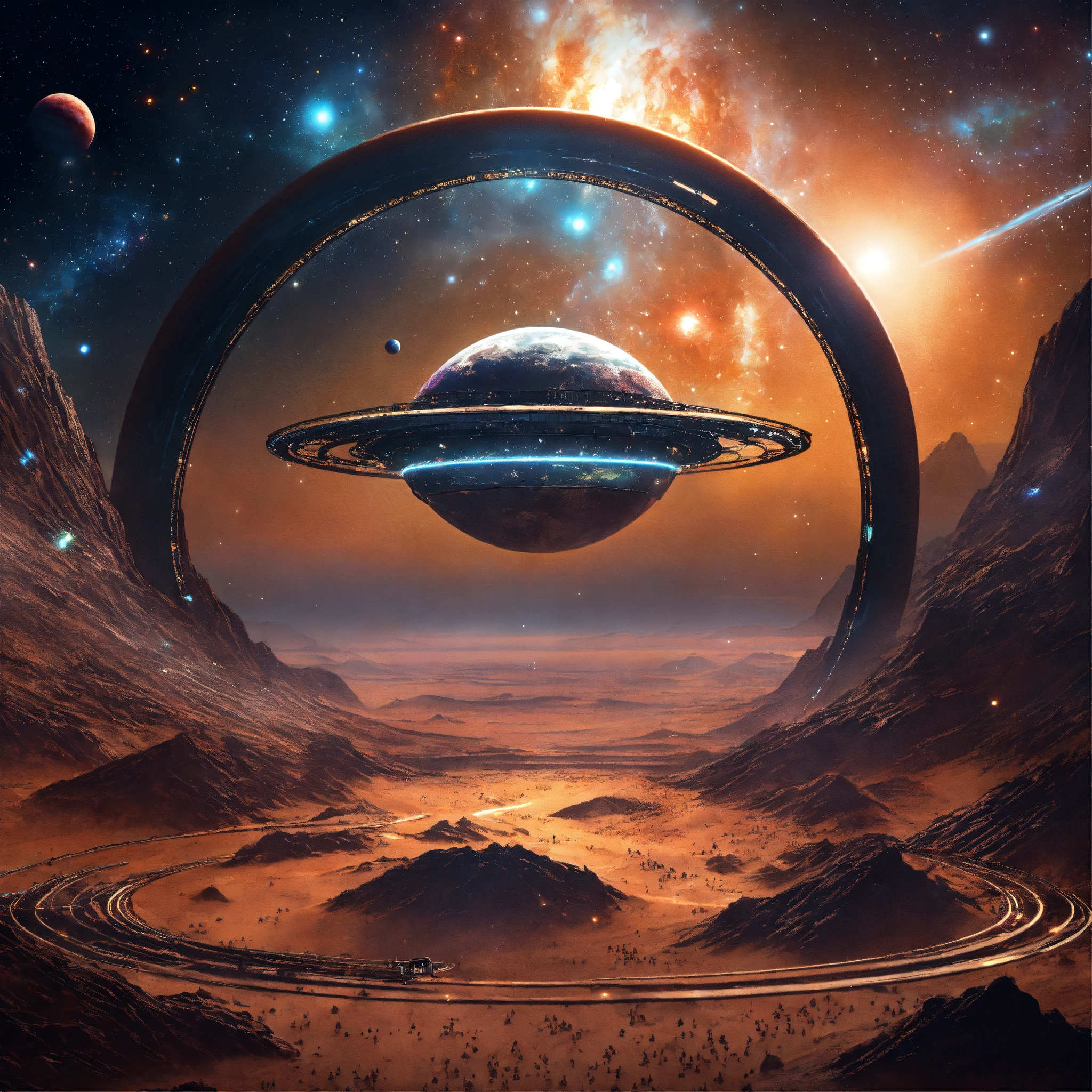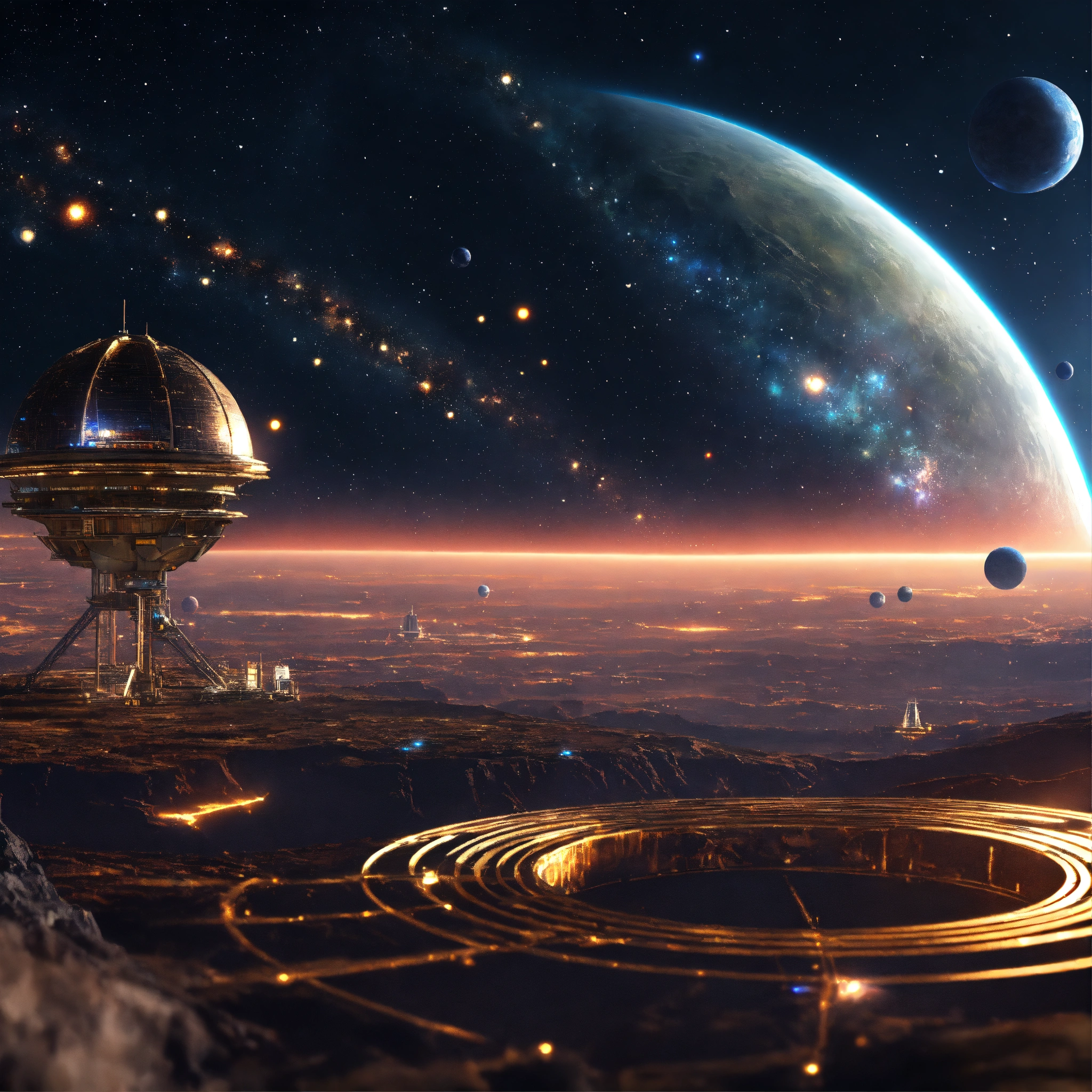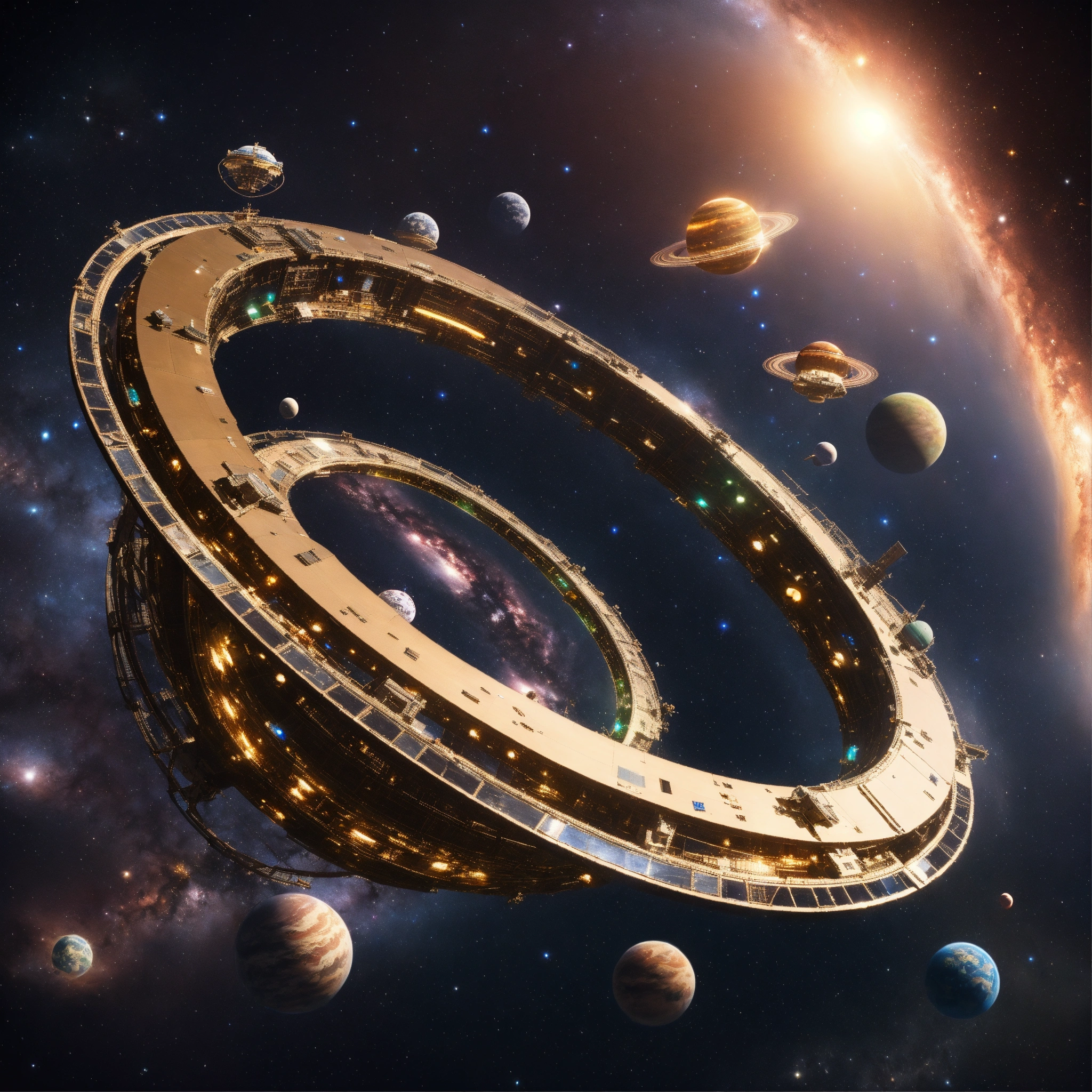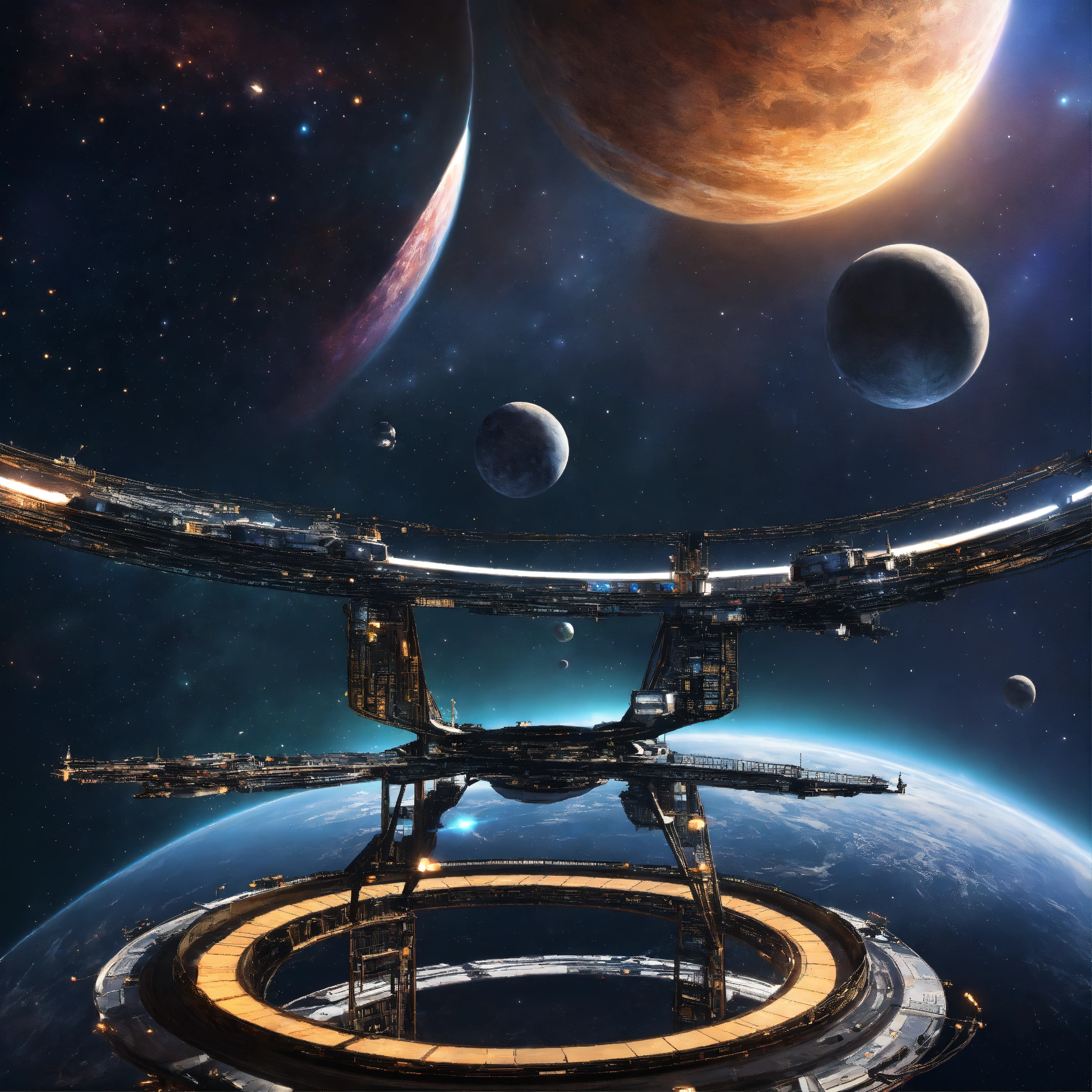 Metallic ring space stations around a planet little stars and space in the background