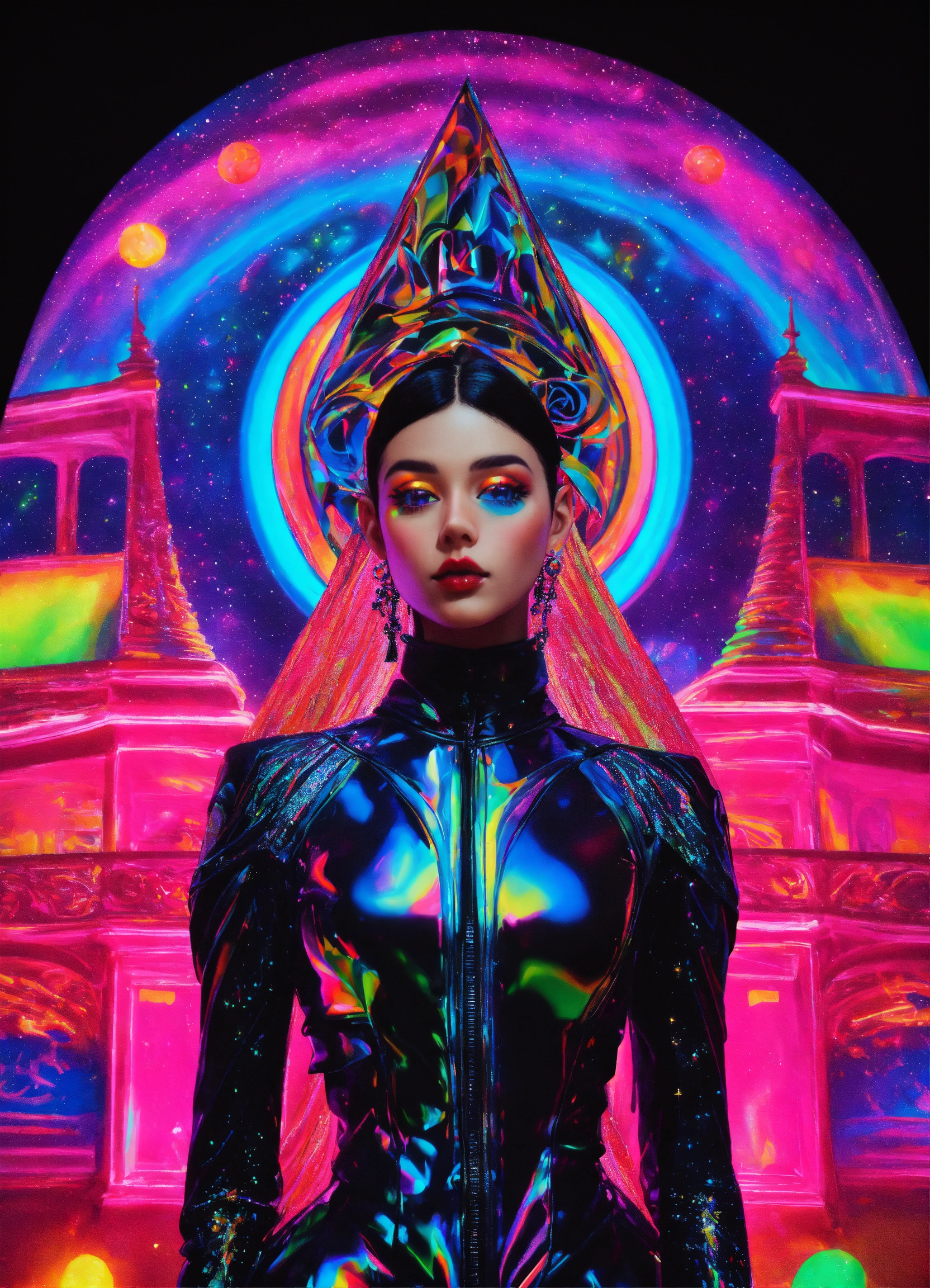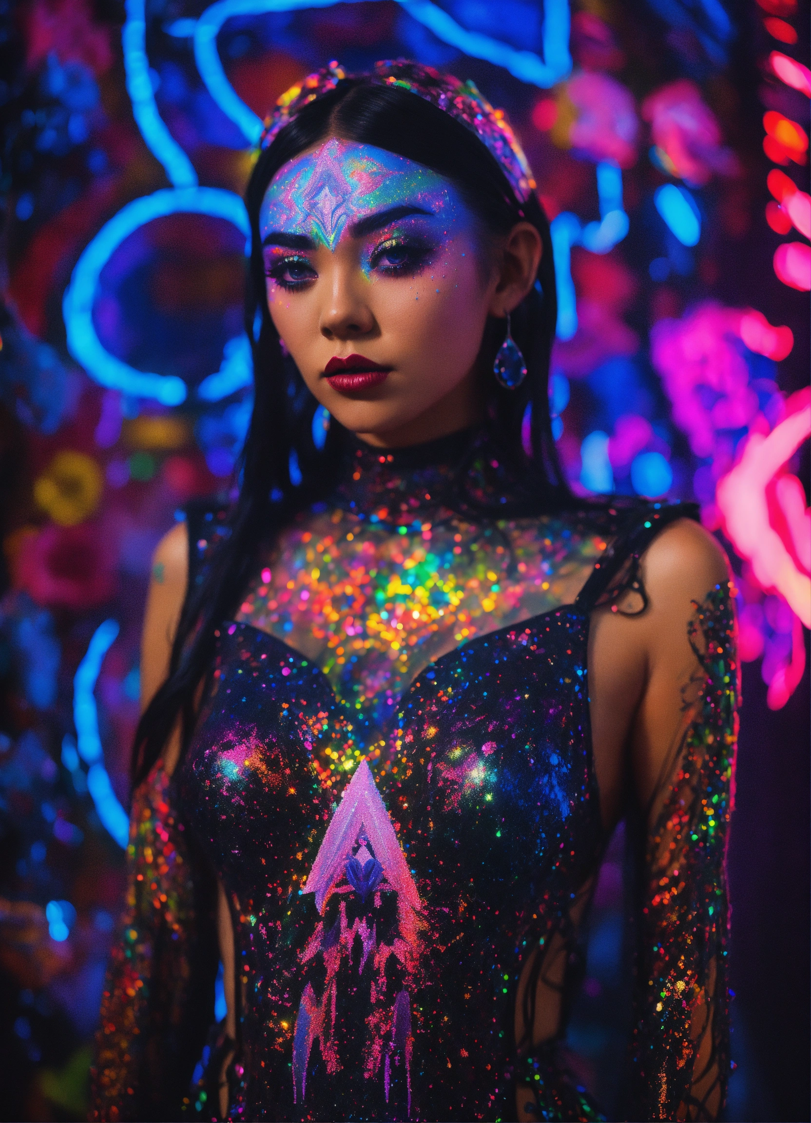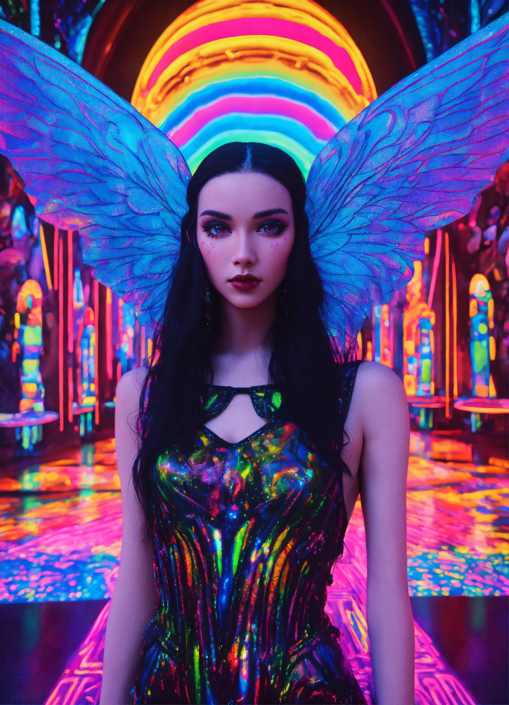Photorealistic 3d full body portrait of gorgeous goth emo thai grimes angel kawaii punk rock anime haute couture costume, of cosmic alex grey painting in a dmt black light glitter neon black rainbow glitter holographic paris fashion night 70mm film, art by salvador dali and holy mountain the movie.