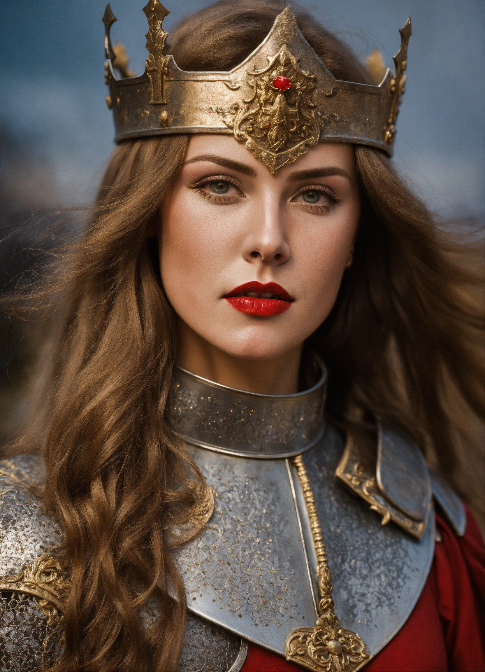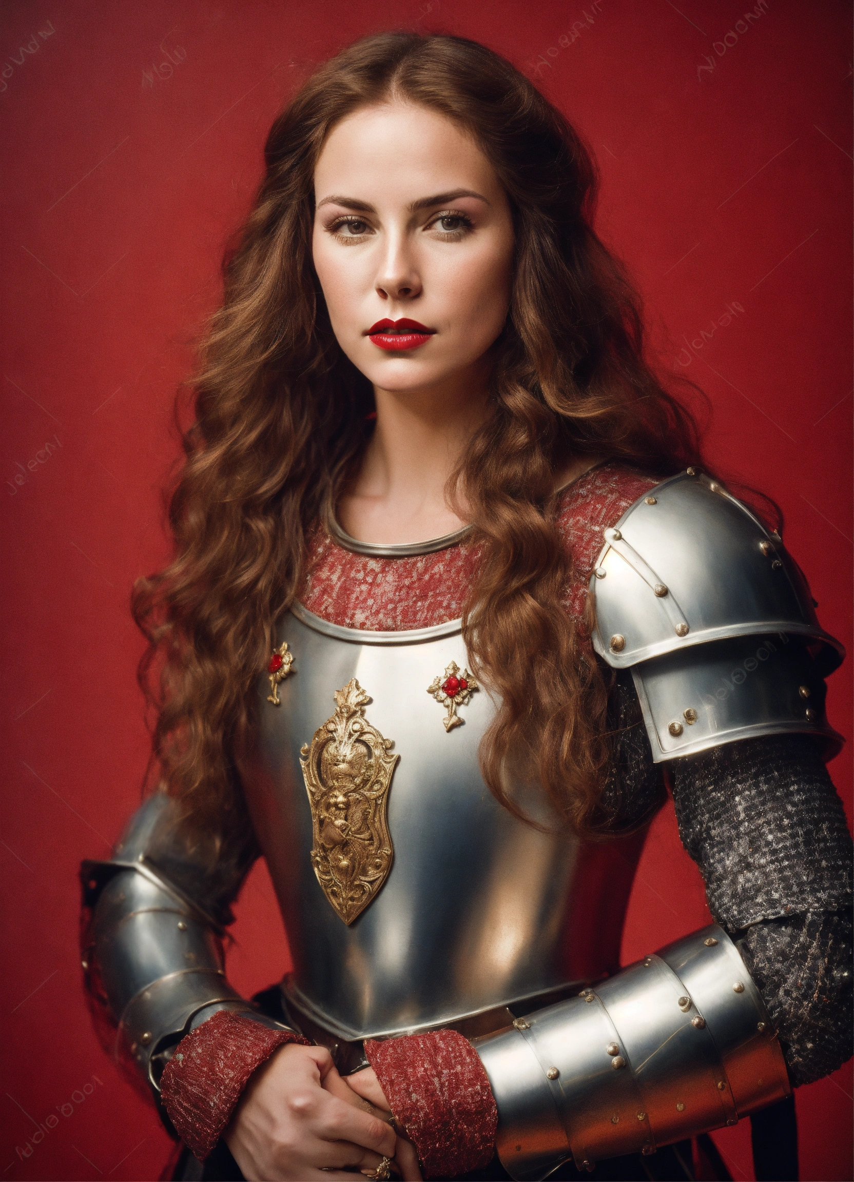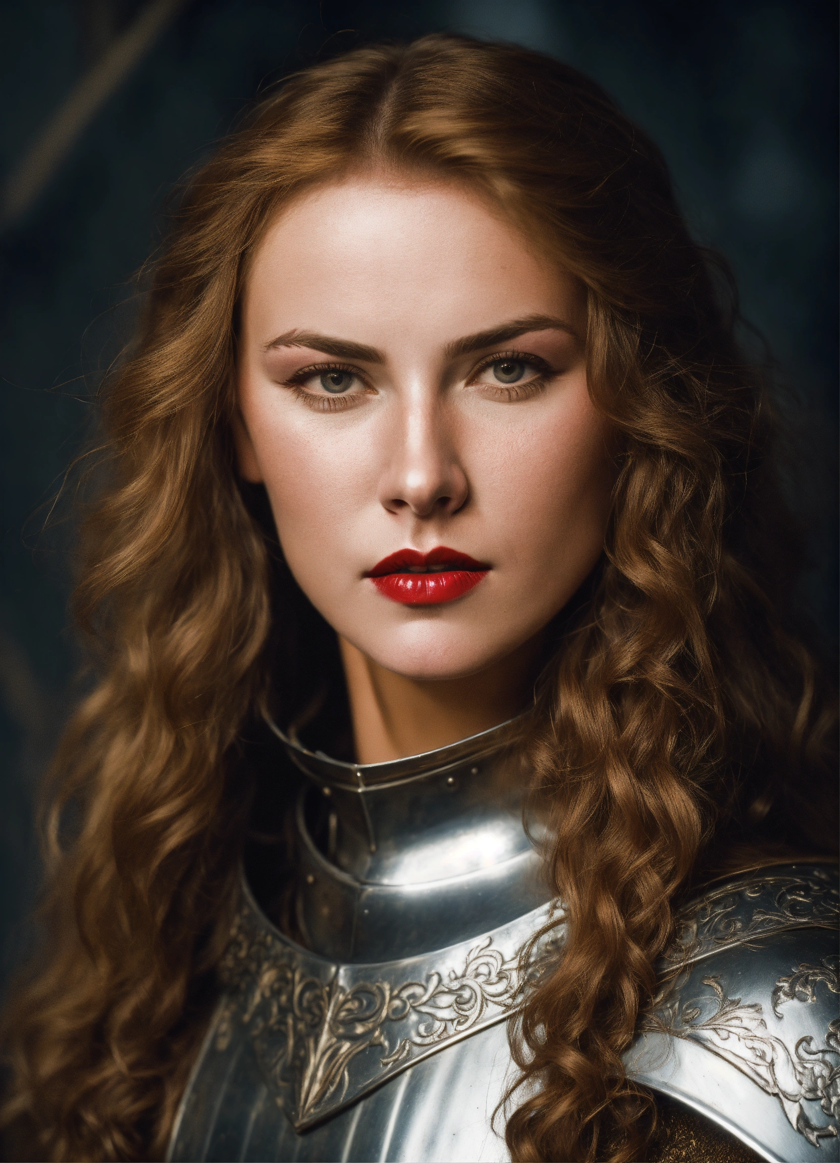 Photo quality portrait of young beautiful carol varderman as a mediaeval knight in shining armor with flowing hair, red lips and a stern expression