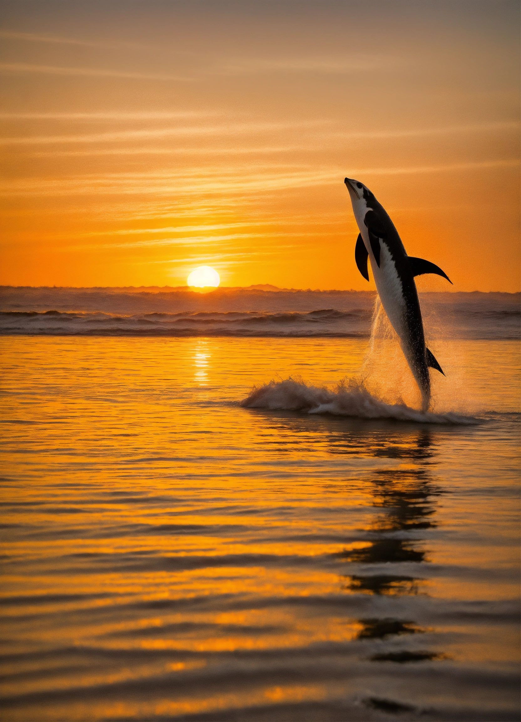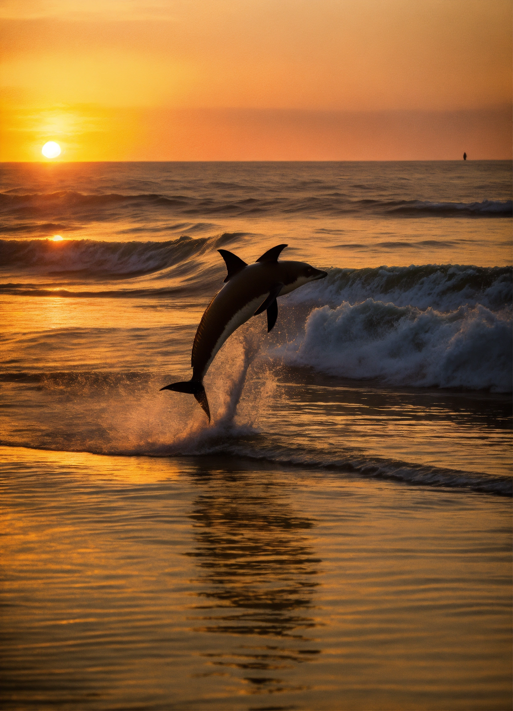 Erstelle mir ein bild auf dem delfine zu sehen sind die im sonnenuntergang springen und sich des lebens freuen. das bild soll so gut sein, dass es einen preis erhalten könnte beim national geographic.