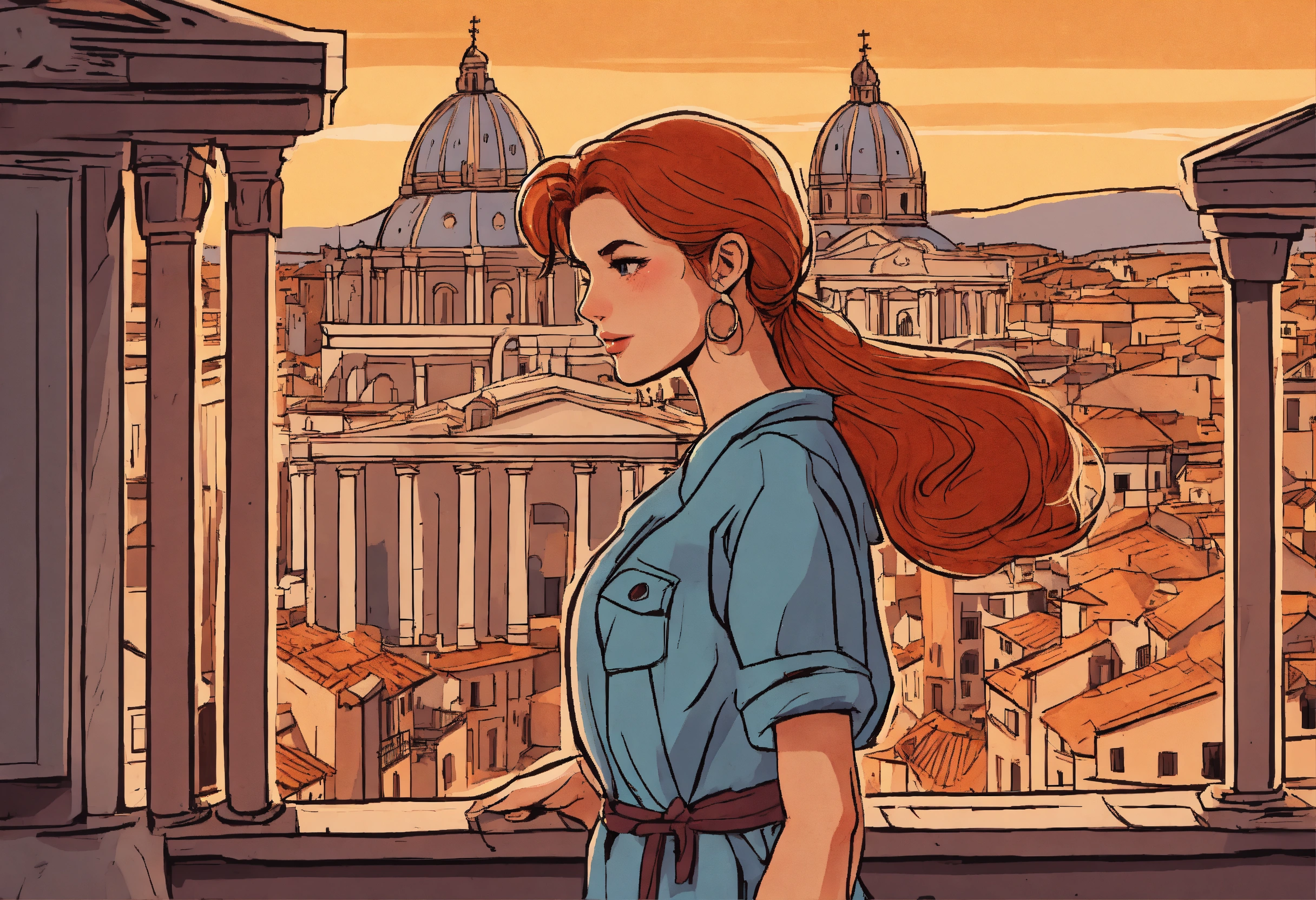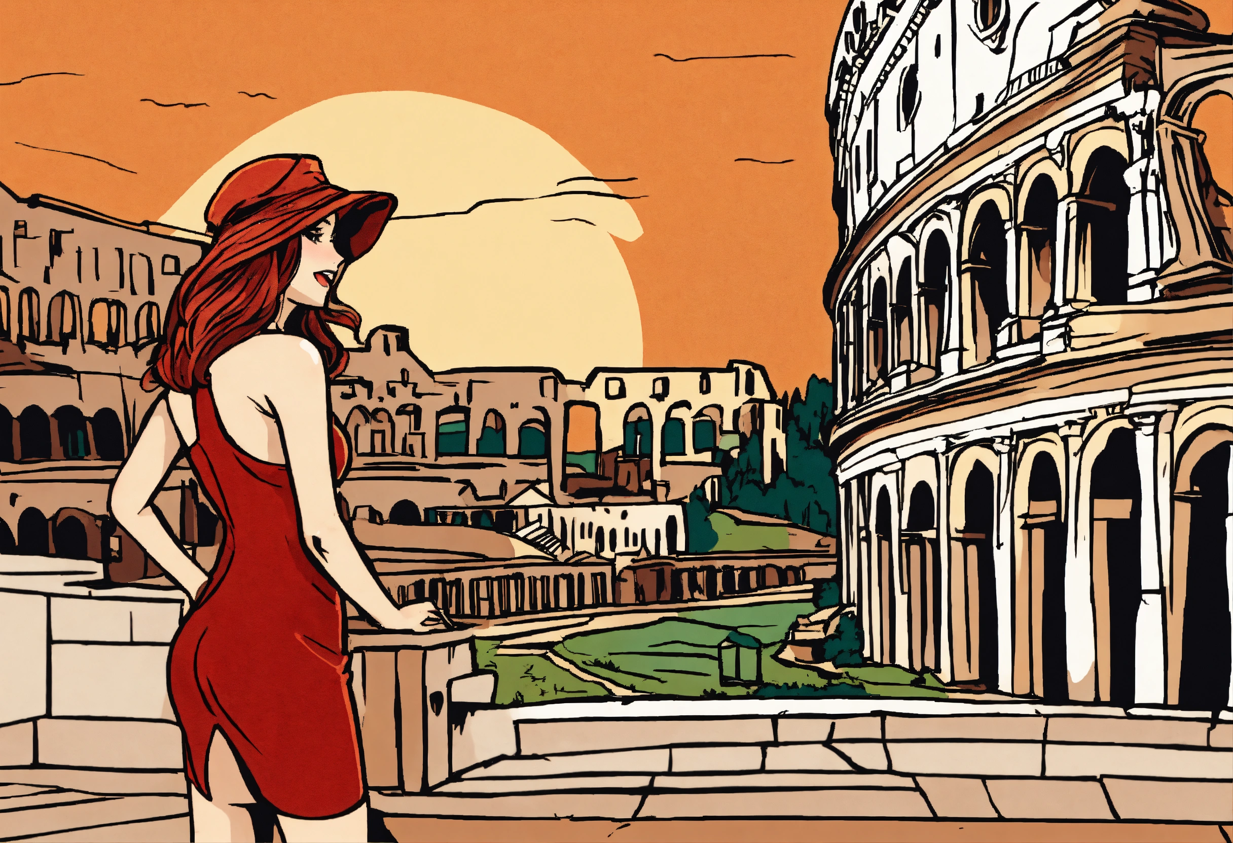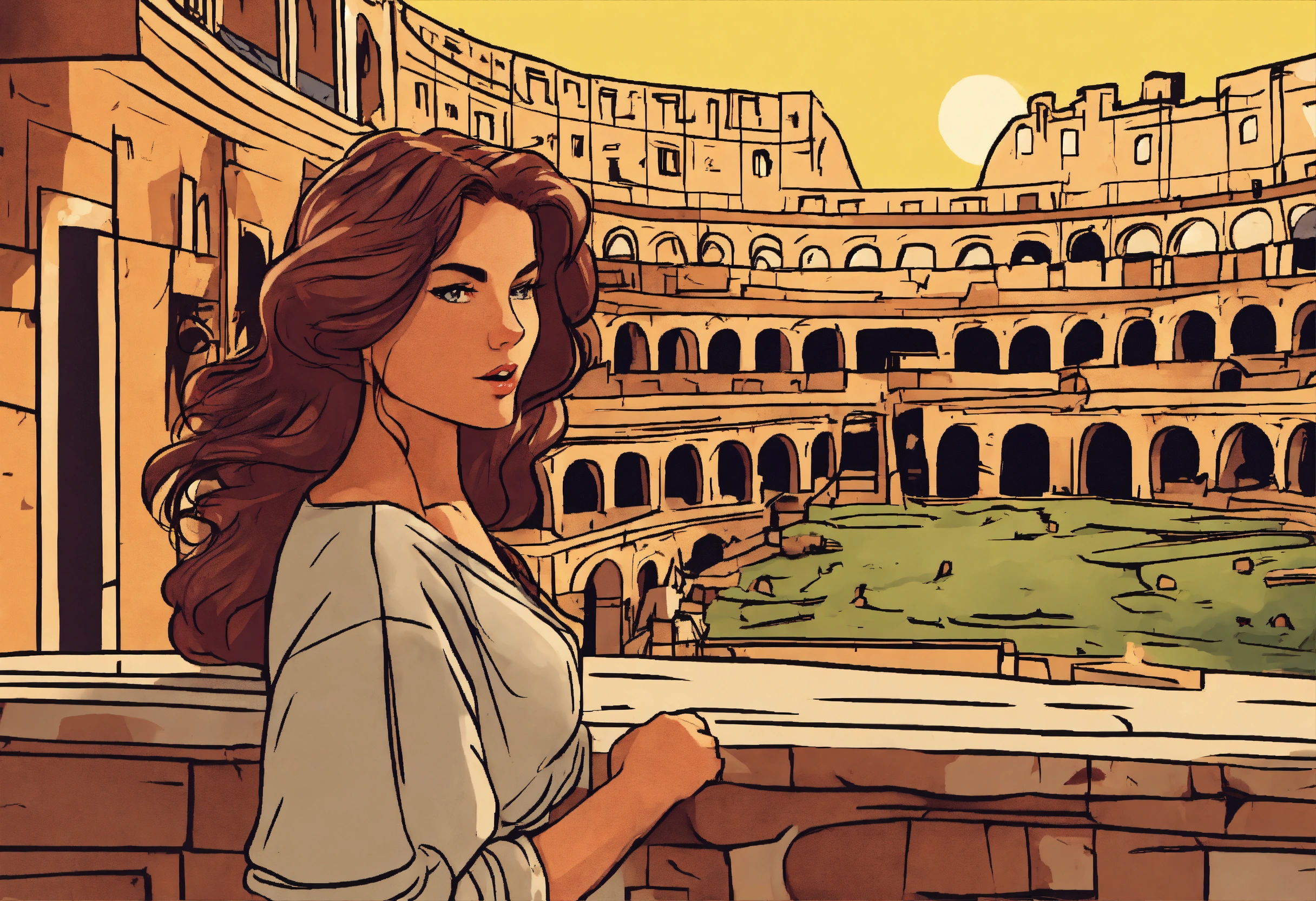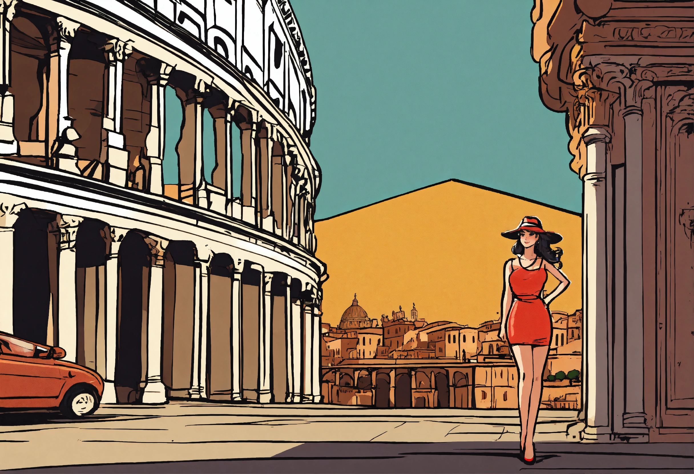 A european comic style hand drawn cartoon of a hot girl standing in rome