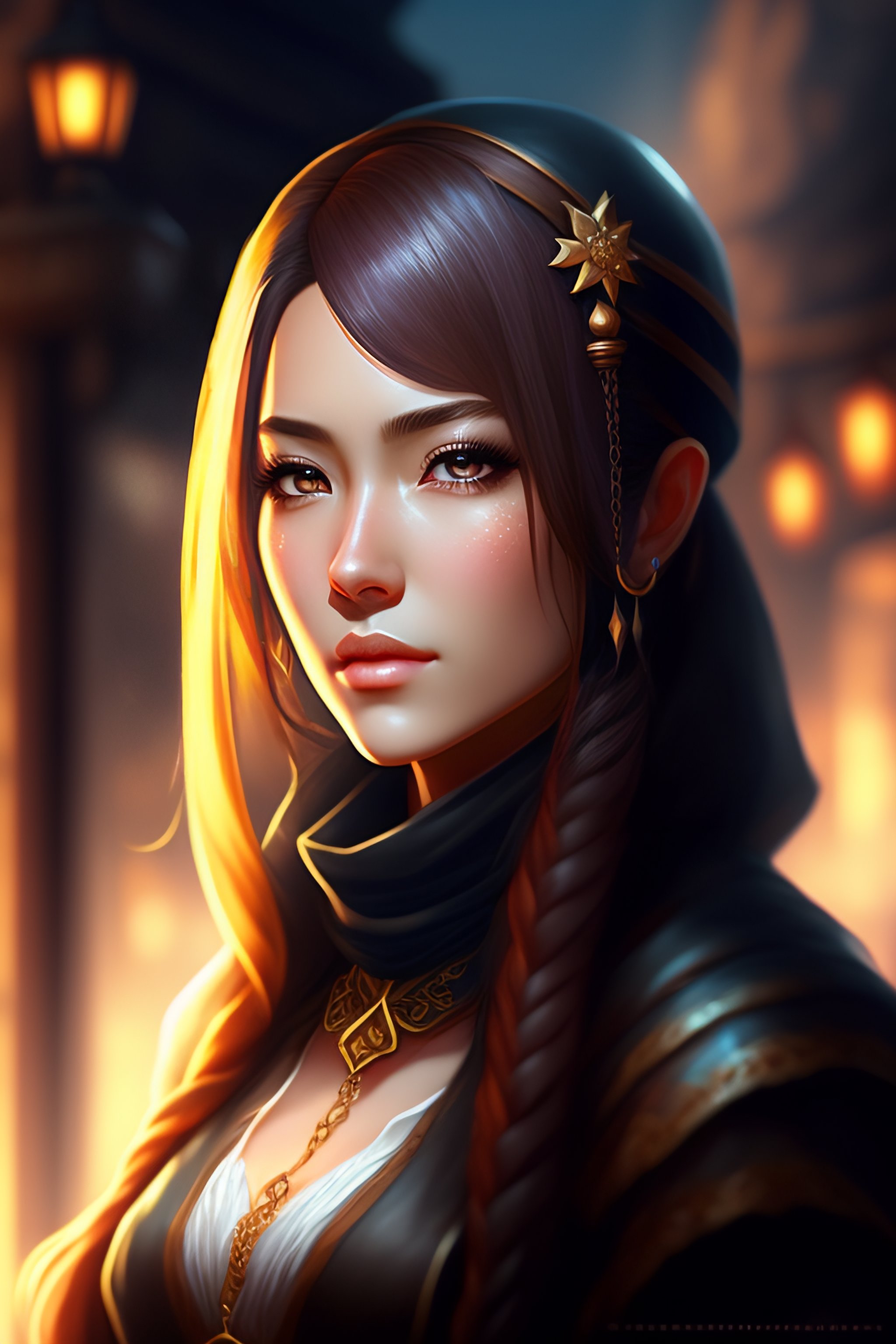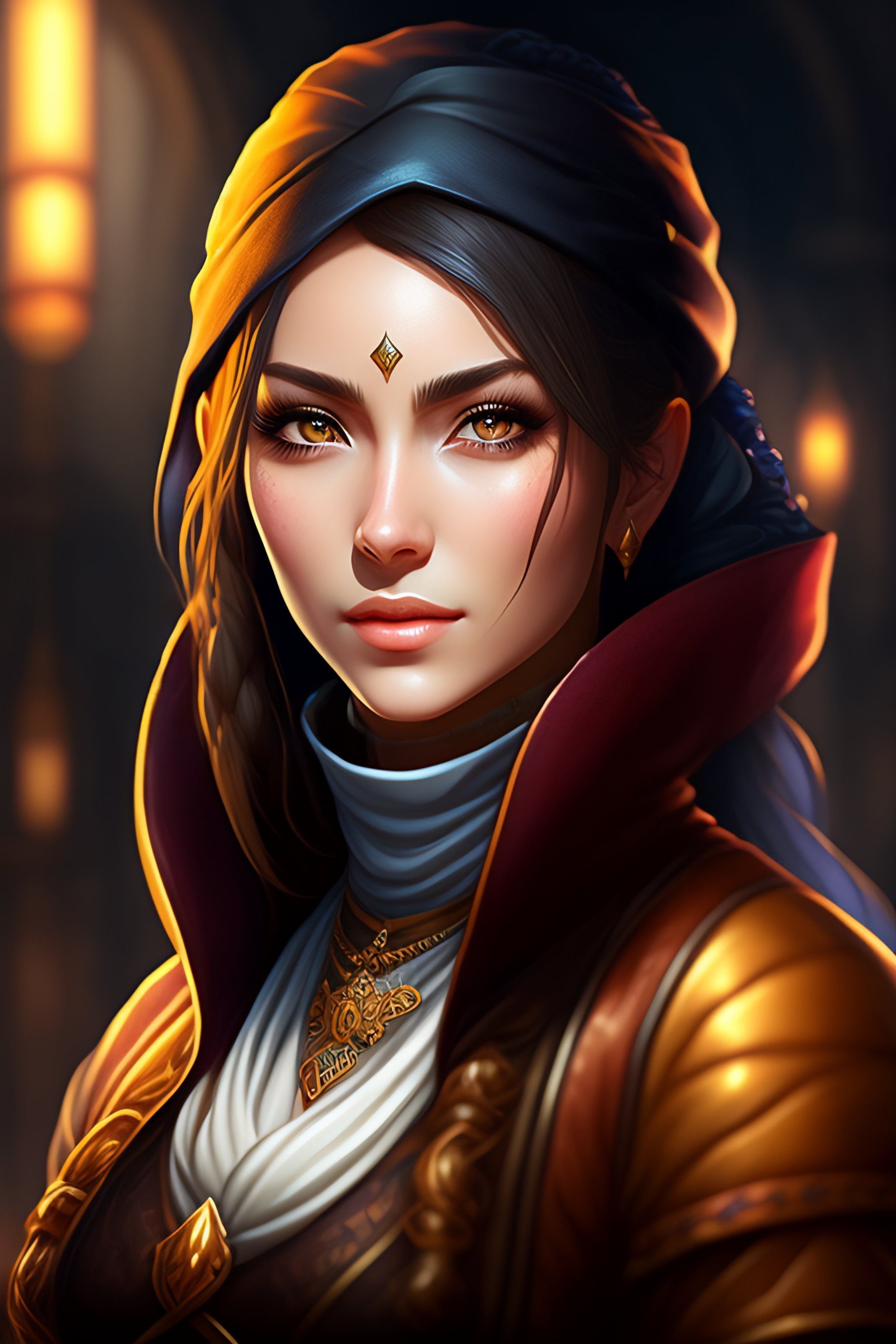Portrait merchant rpg female character design transparent background facescar gothic anime adventure role-playing game