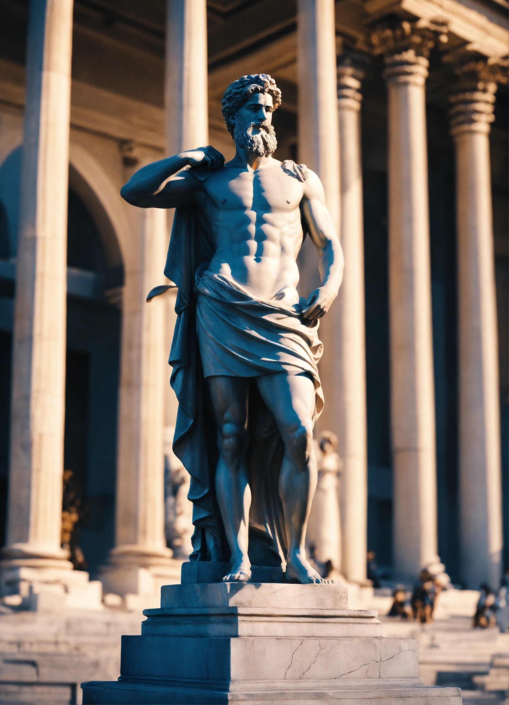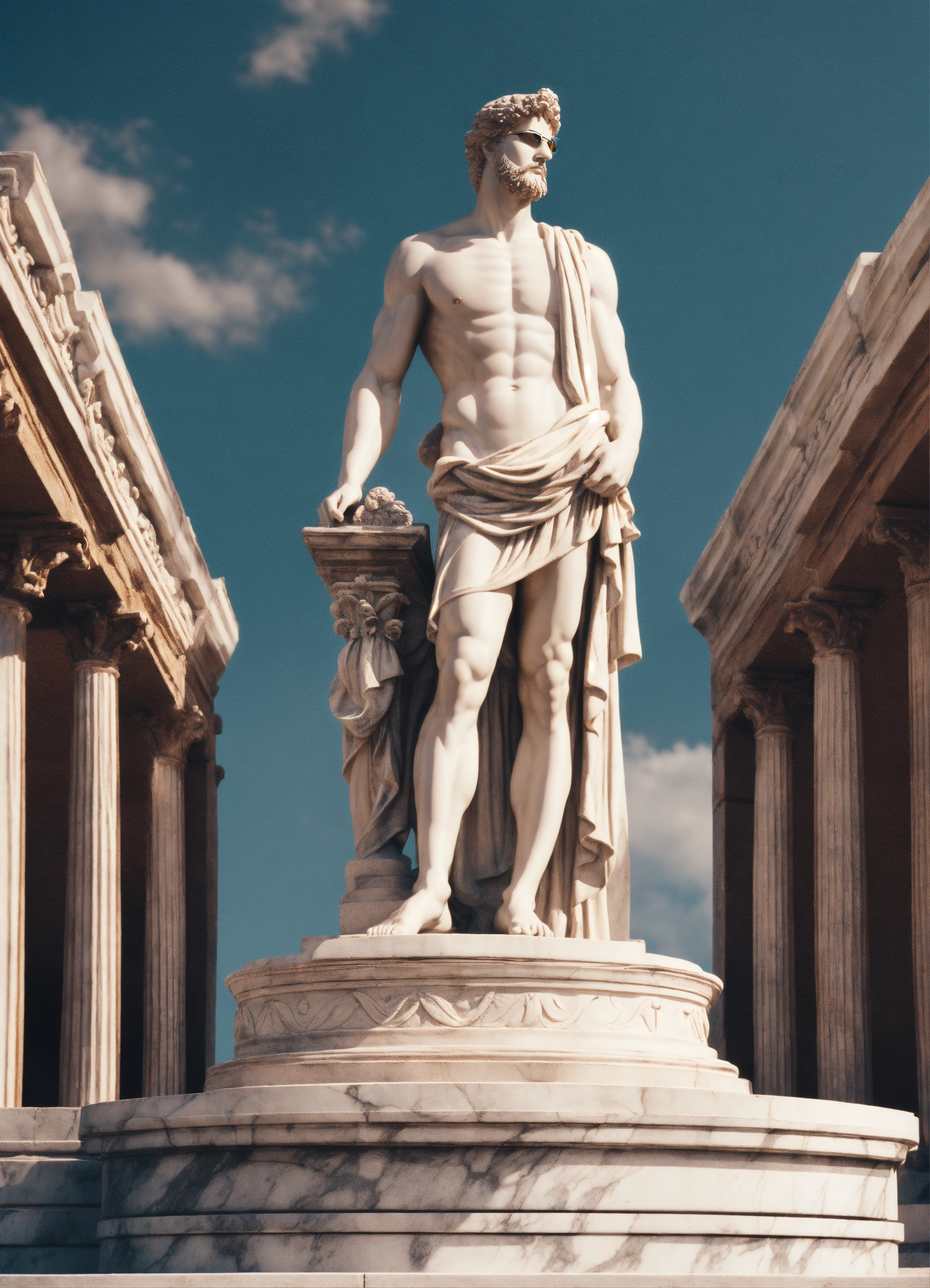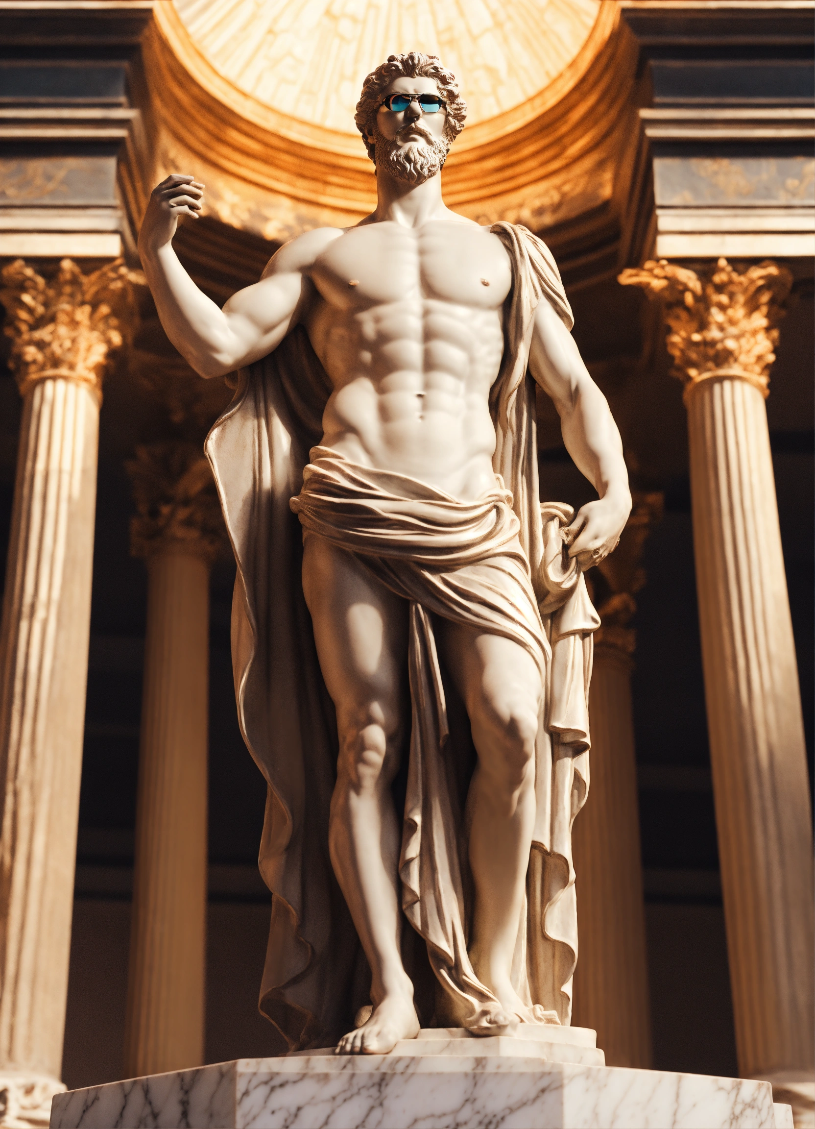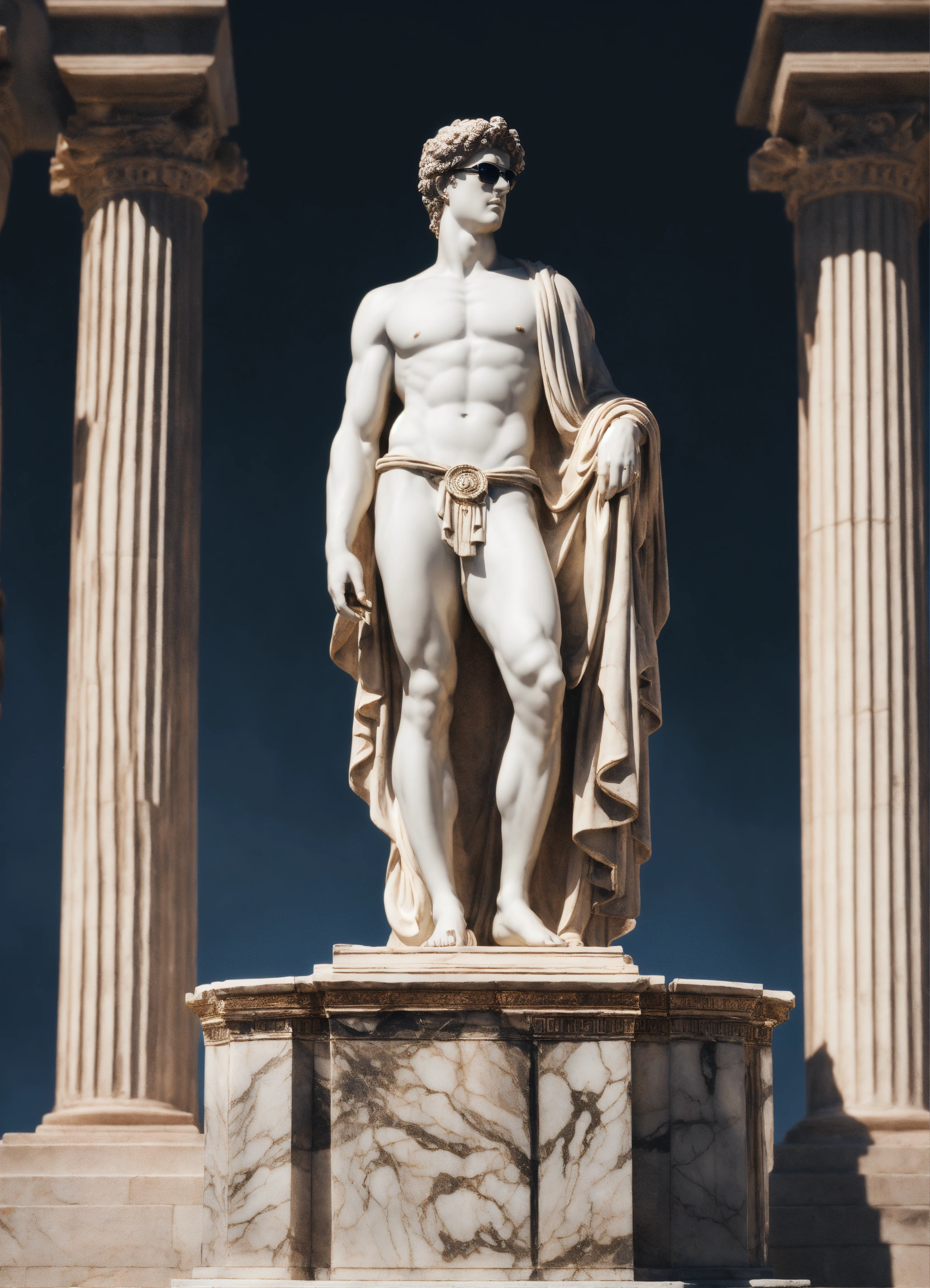 Statue of a greek god out of withe marbel wearing a black sunglasses having middel parting hiar standing on a small podium anime style 8k