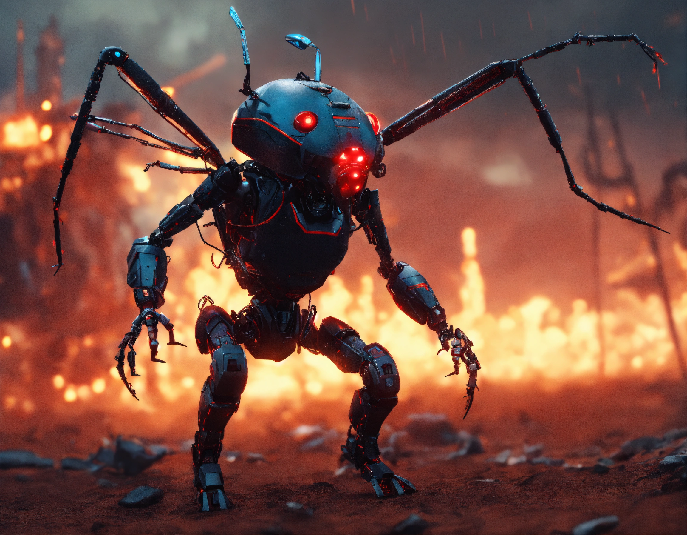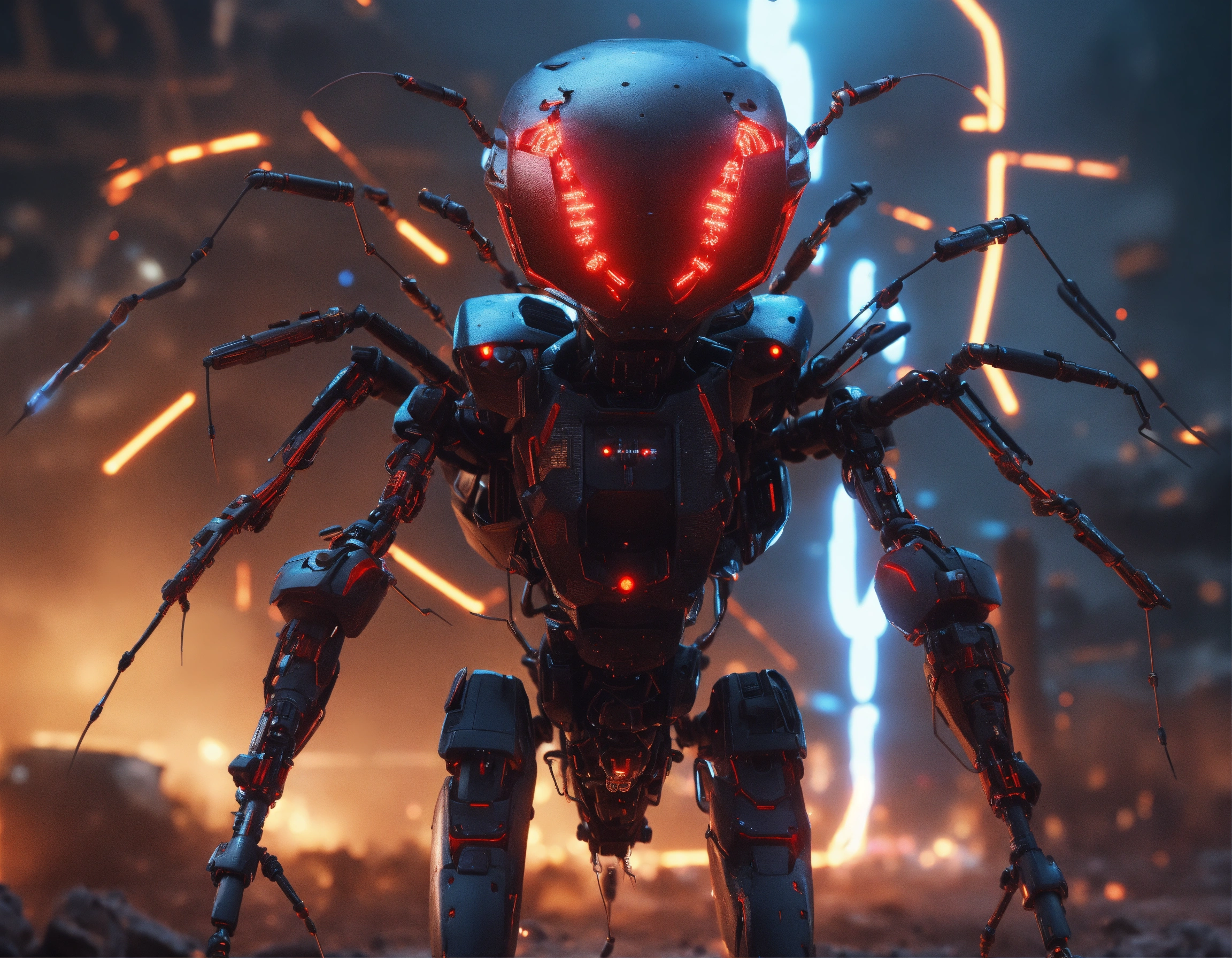 Zoom out scene of 4 leg 2 arm comical funny standing black ant faced humanoid with red glowing eyes, detailed circuitry, hi-tech armored humanoid body, he is sending digital electric electric lightning bolts with his antenna, attacking beings in a wasteland, realistic, 8k