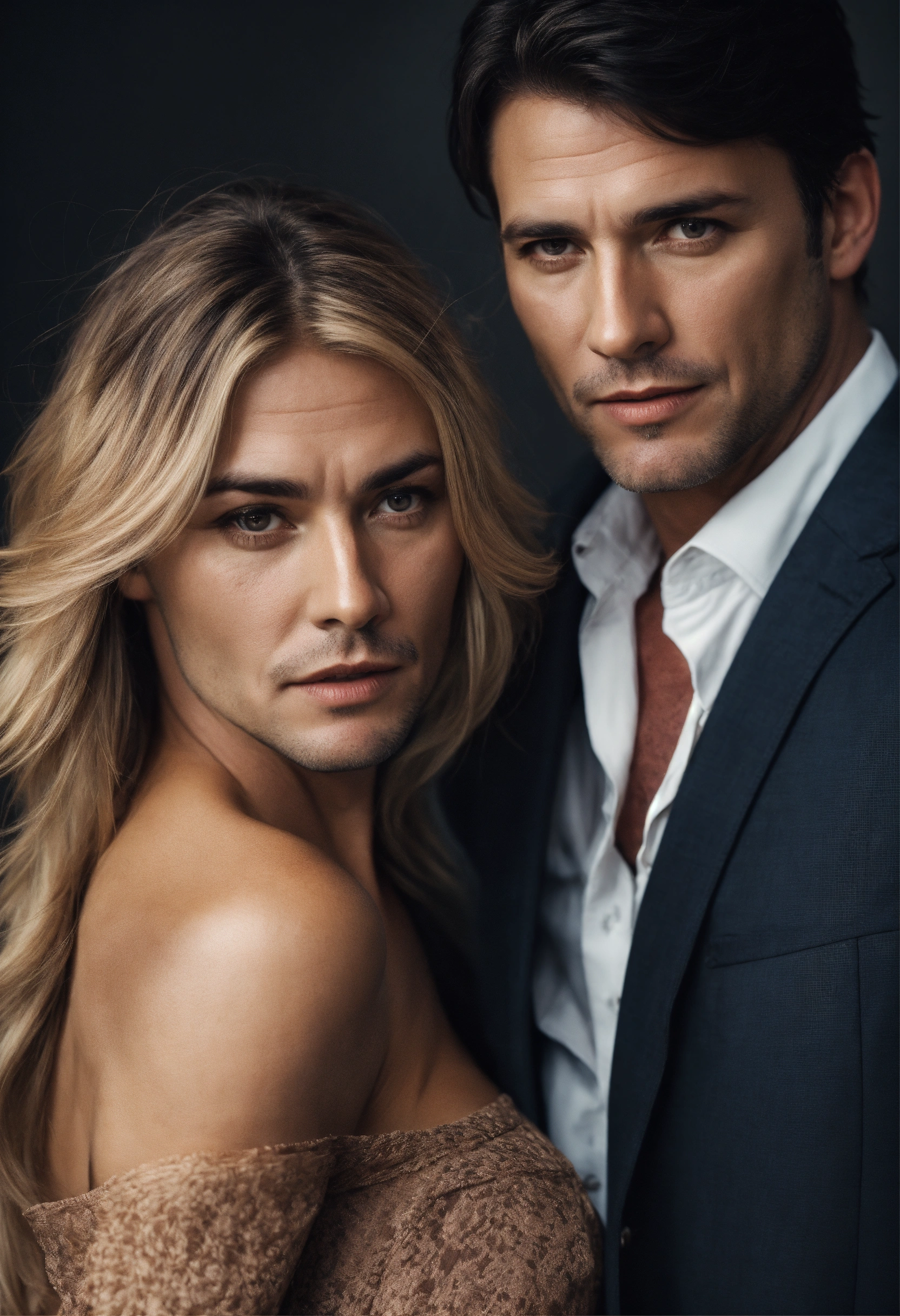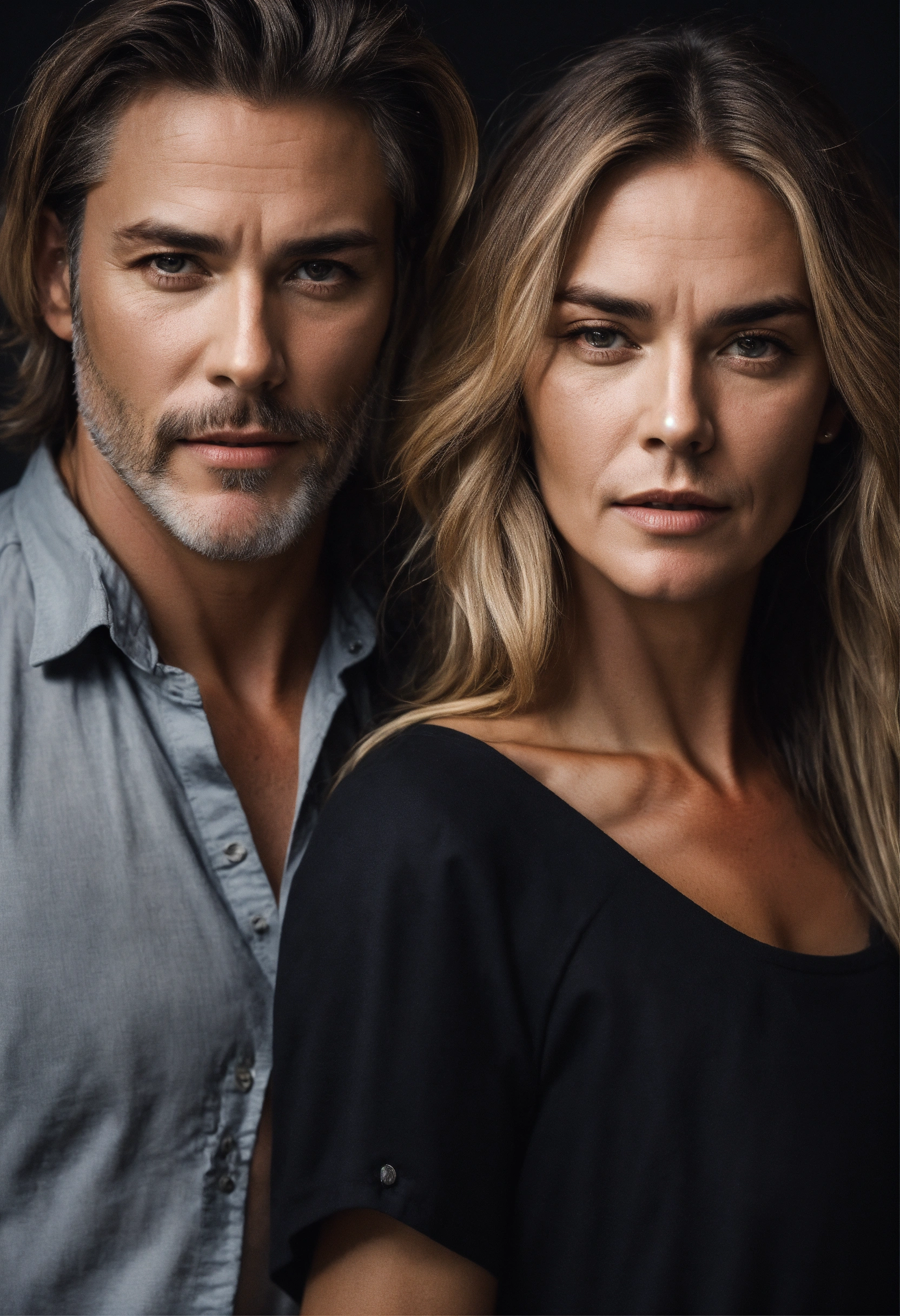 A middle aged brutal men with dark hair and very beautiful women with dark blonde hair