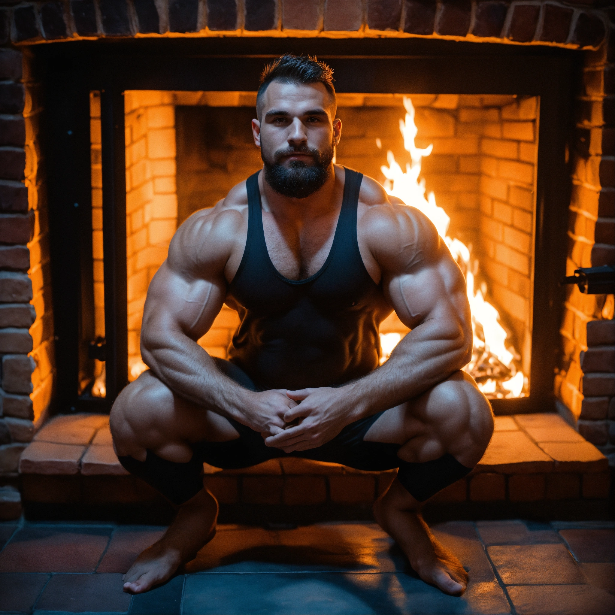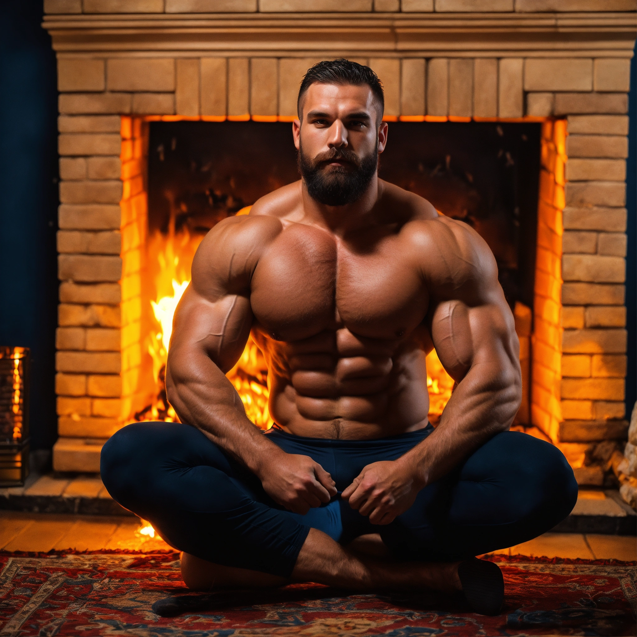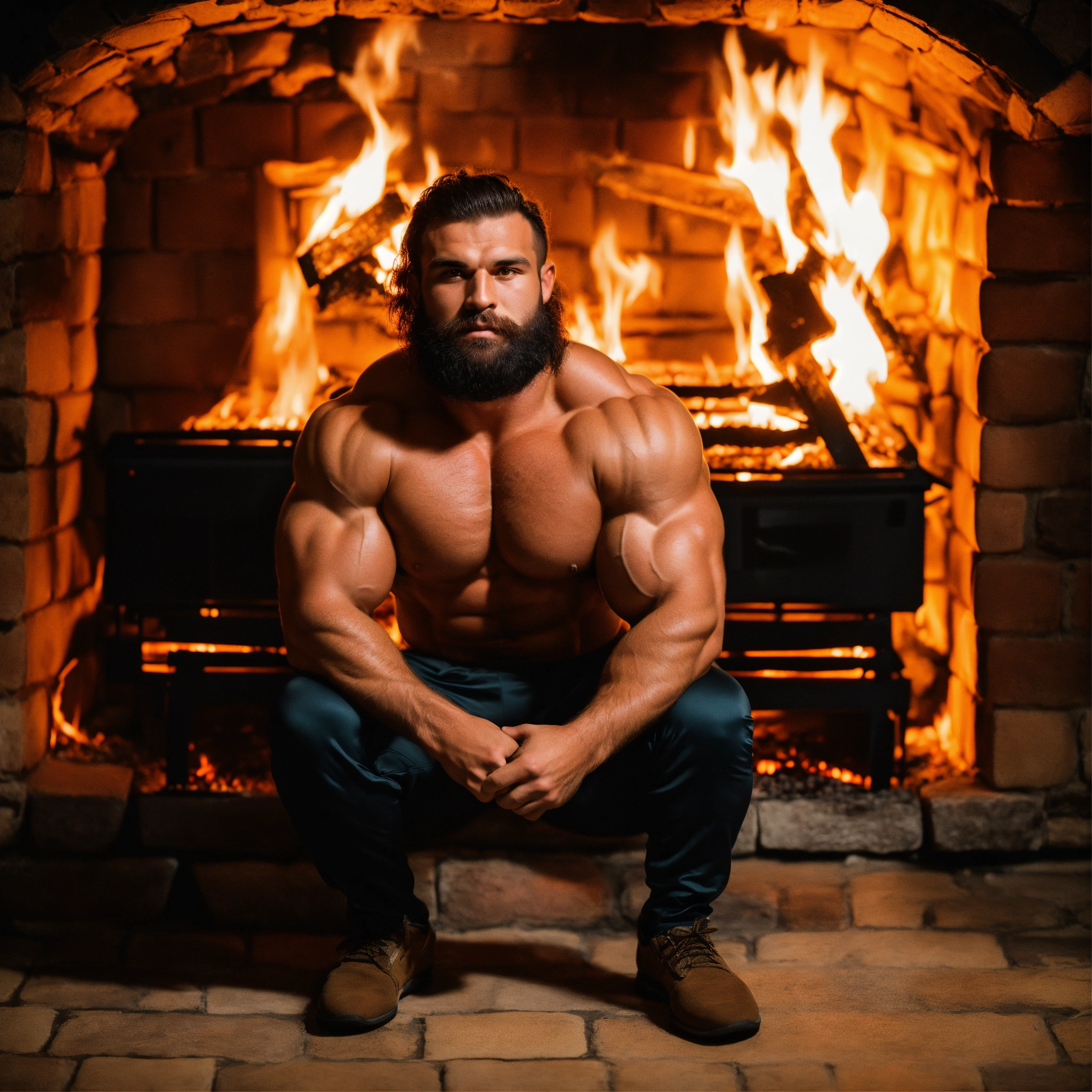 30-year-old hairy moldovan man with big muscles, big bodybuilder, body like a wrestler, sitting in front of a fireplace at midnight