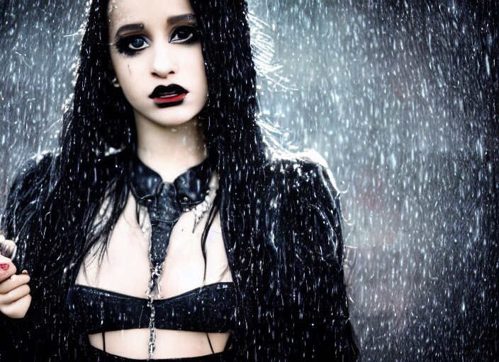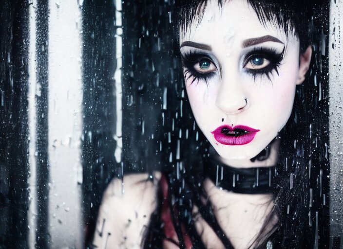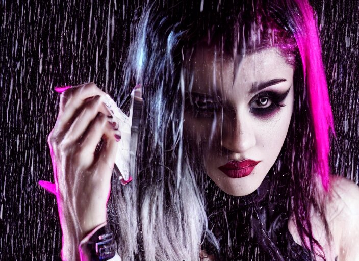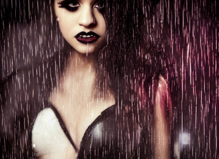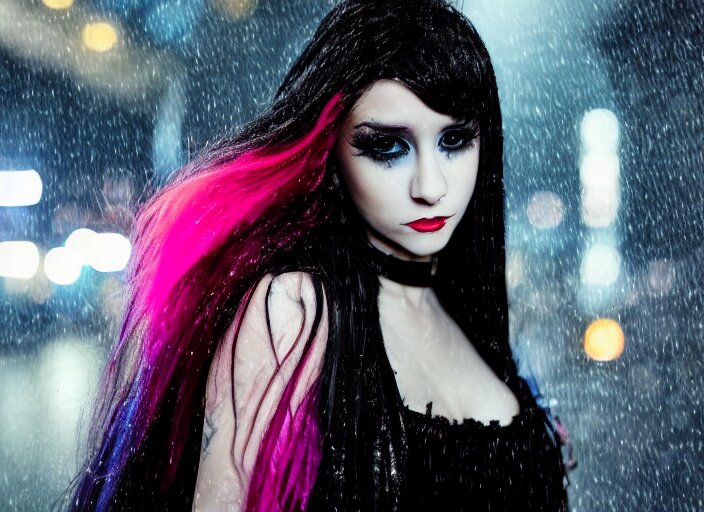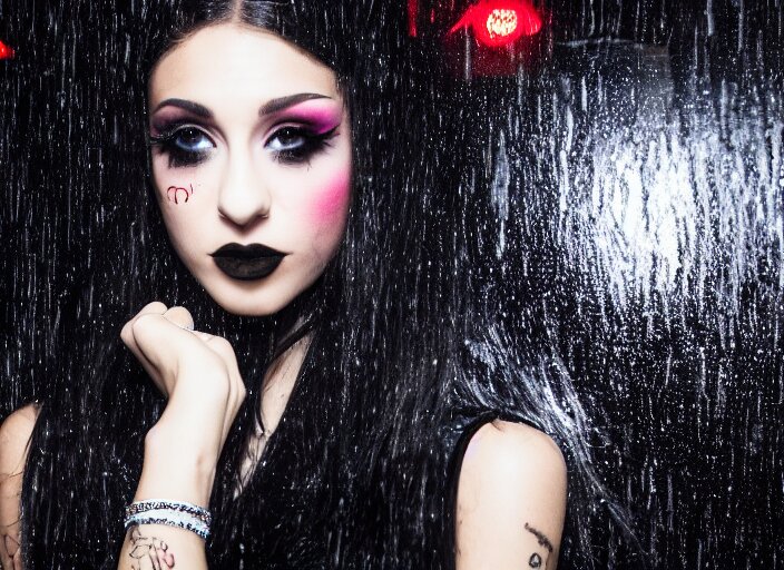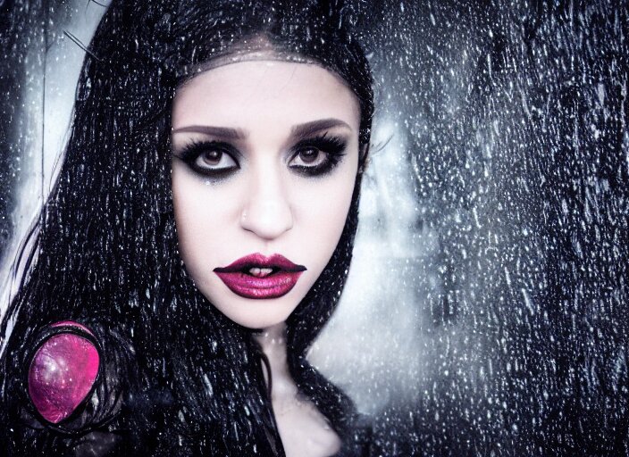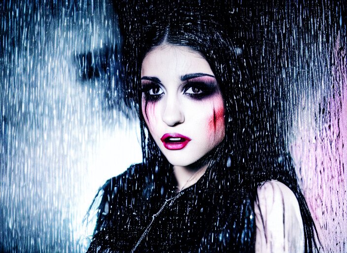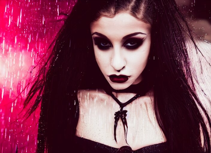 Closeup portrait of emo vampire goth ariana grande standing in the rain in a dark cyberpunk city, heavy make - up running down face, neon reflections in the puddles, portra 4 0 0 candid photograph portrait by annie leibovitz, 3 5 mm macro shot, f / 3 2, hyperrealistic, cinematic lighting, hd wallpaper, 8 k, 4 k