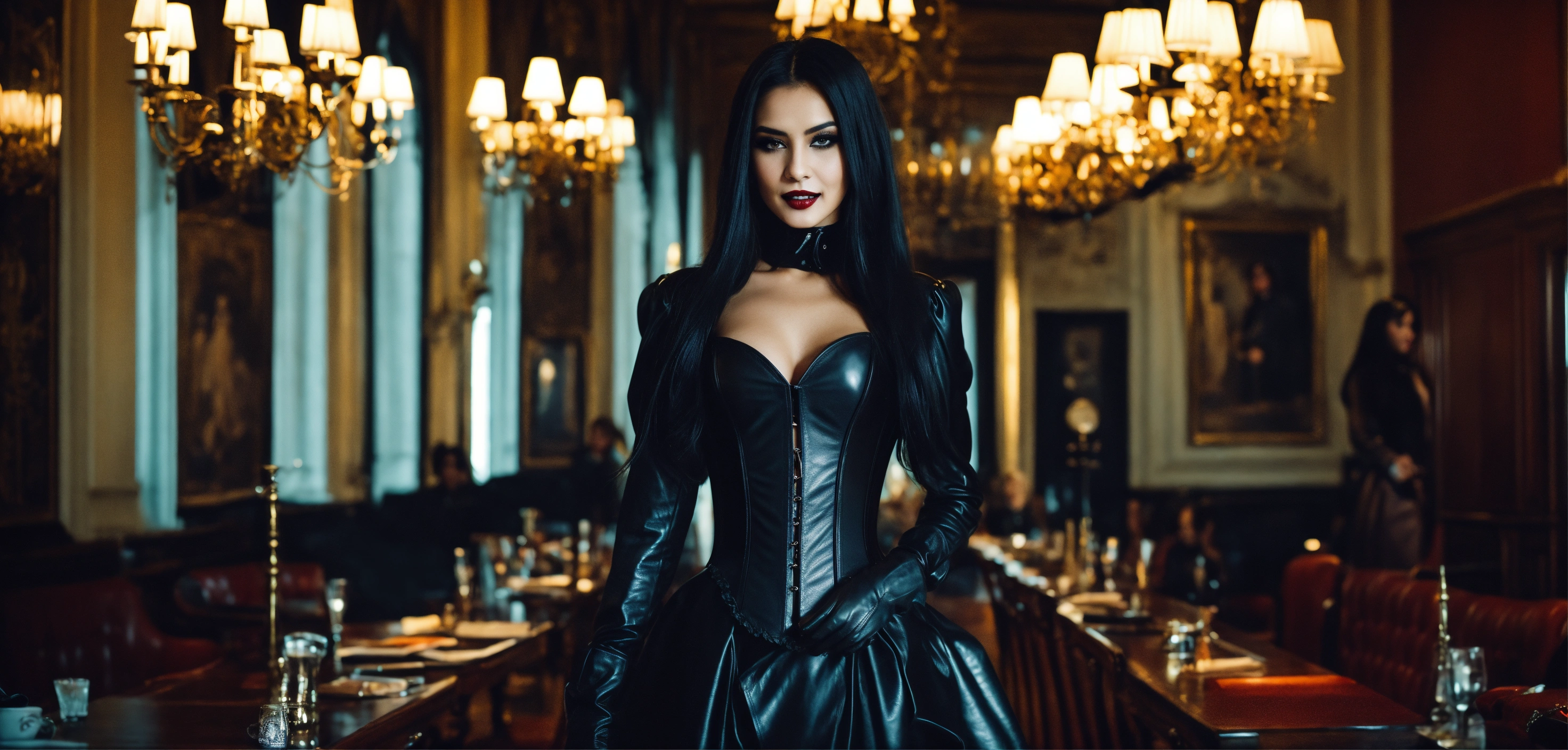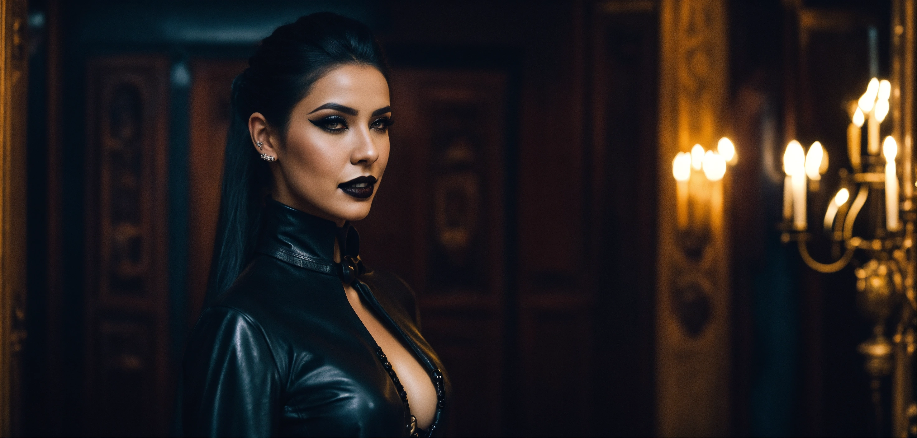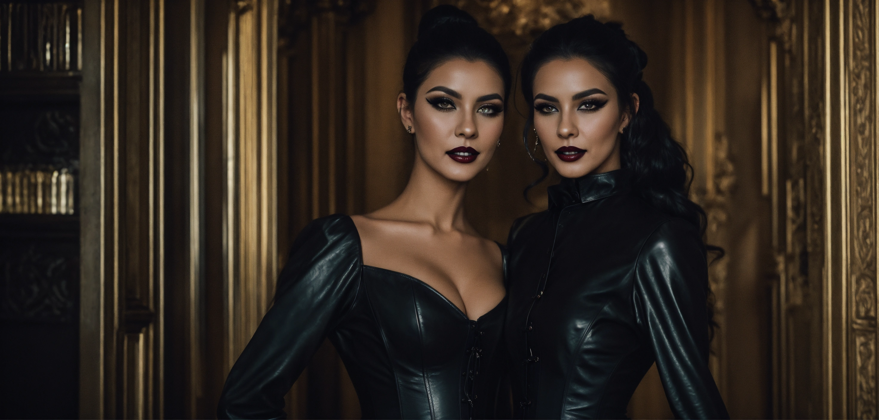 Cinematic look, two stunning arab seductress women fashion model, arrogant evil smile from above showing vampire teeth, black straight hair very high ponytail, black leather corset, long strict victorian governess wide black long leather shirt dress with long big puff sleeves and big buttons, mansion hall at night haze, white office shirt collar, leather gloves, eyeliner makeup, black leather boots, underworld vampire movie style