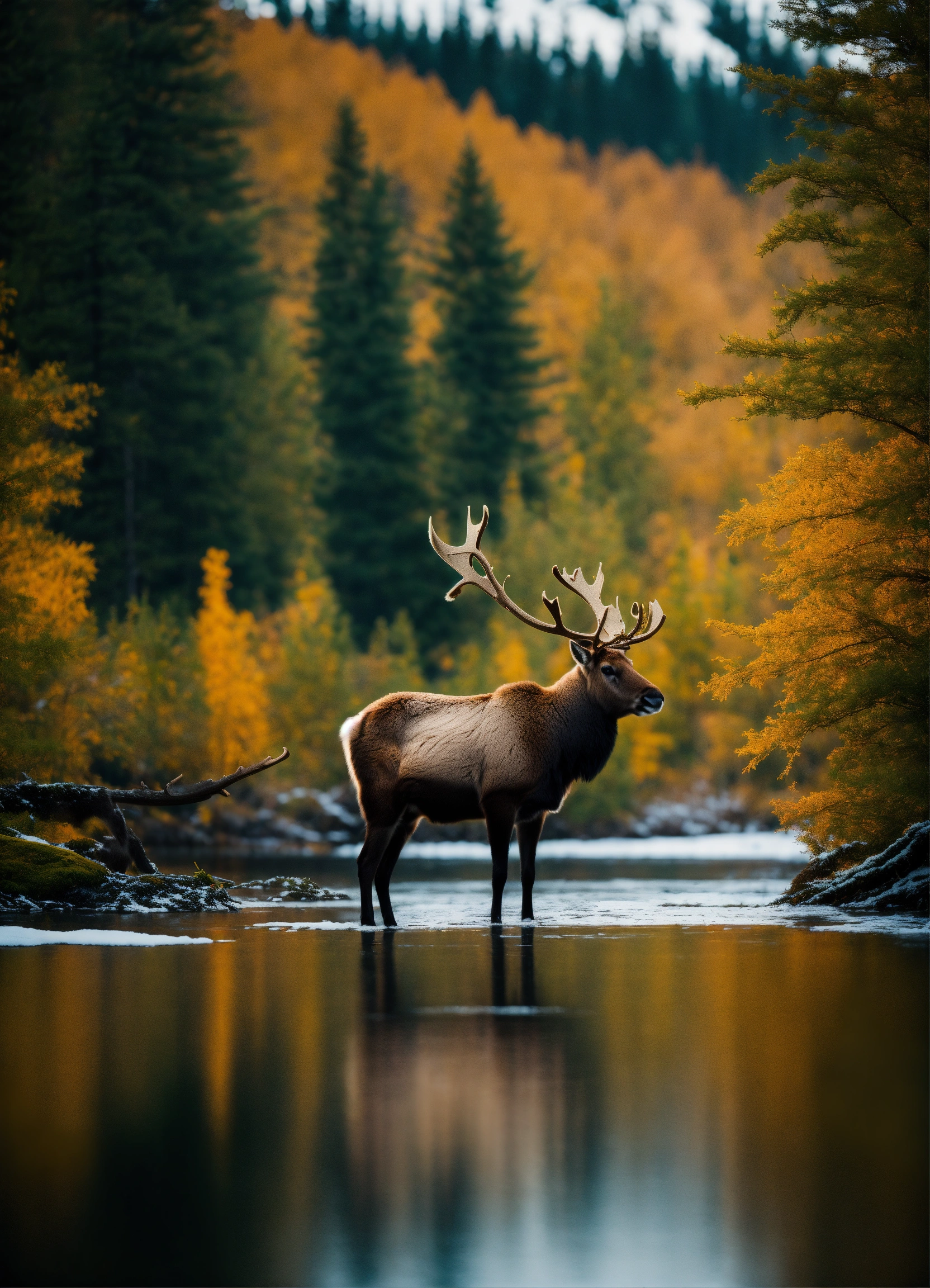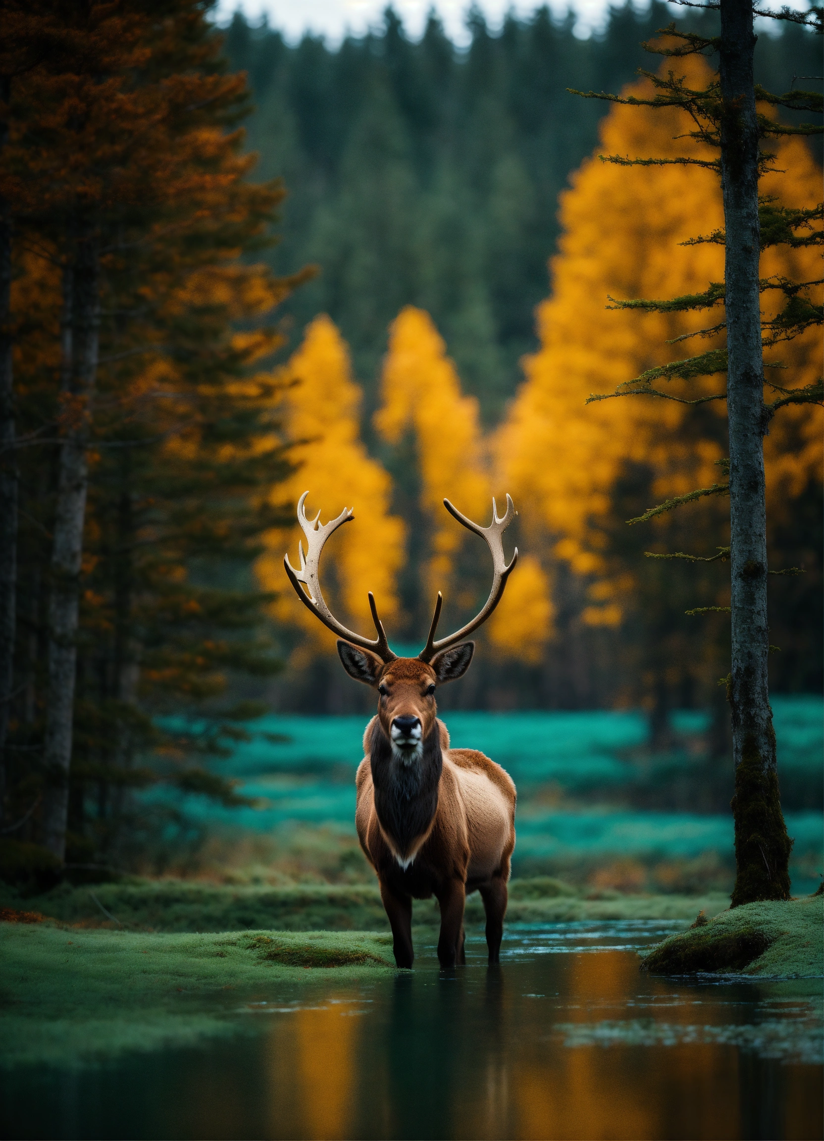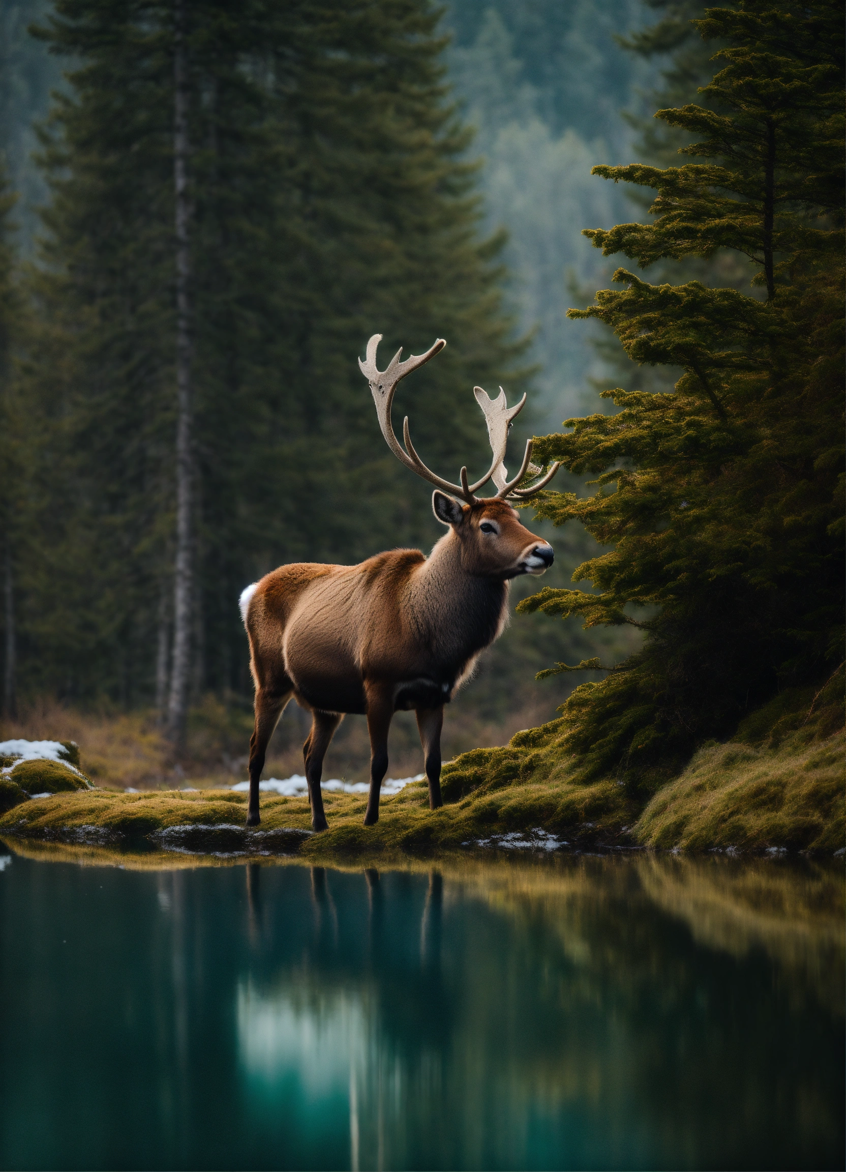 Minimal, cinematic, a reindeer among the trees, forest lake, moss, cold weather, dark teal and amber, telephoto shot perfect clarity photorealistic high definition