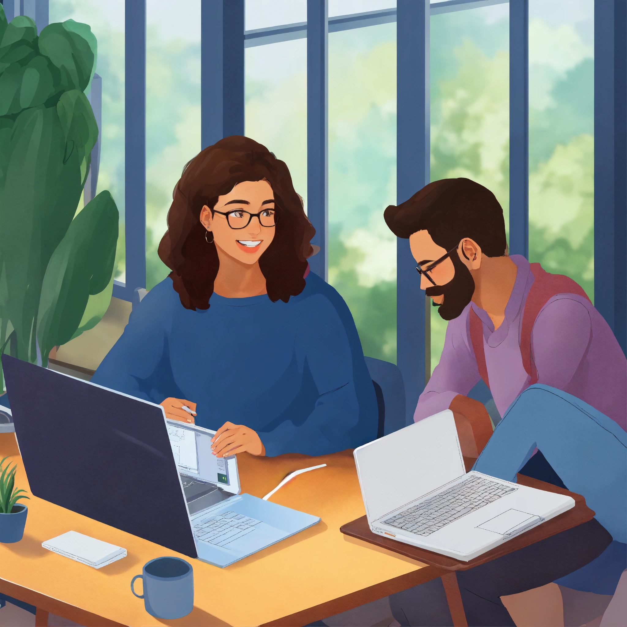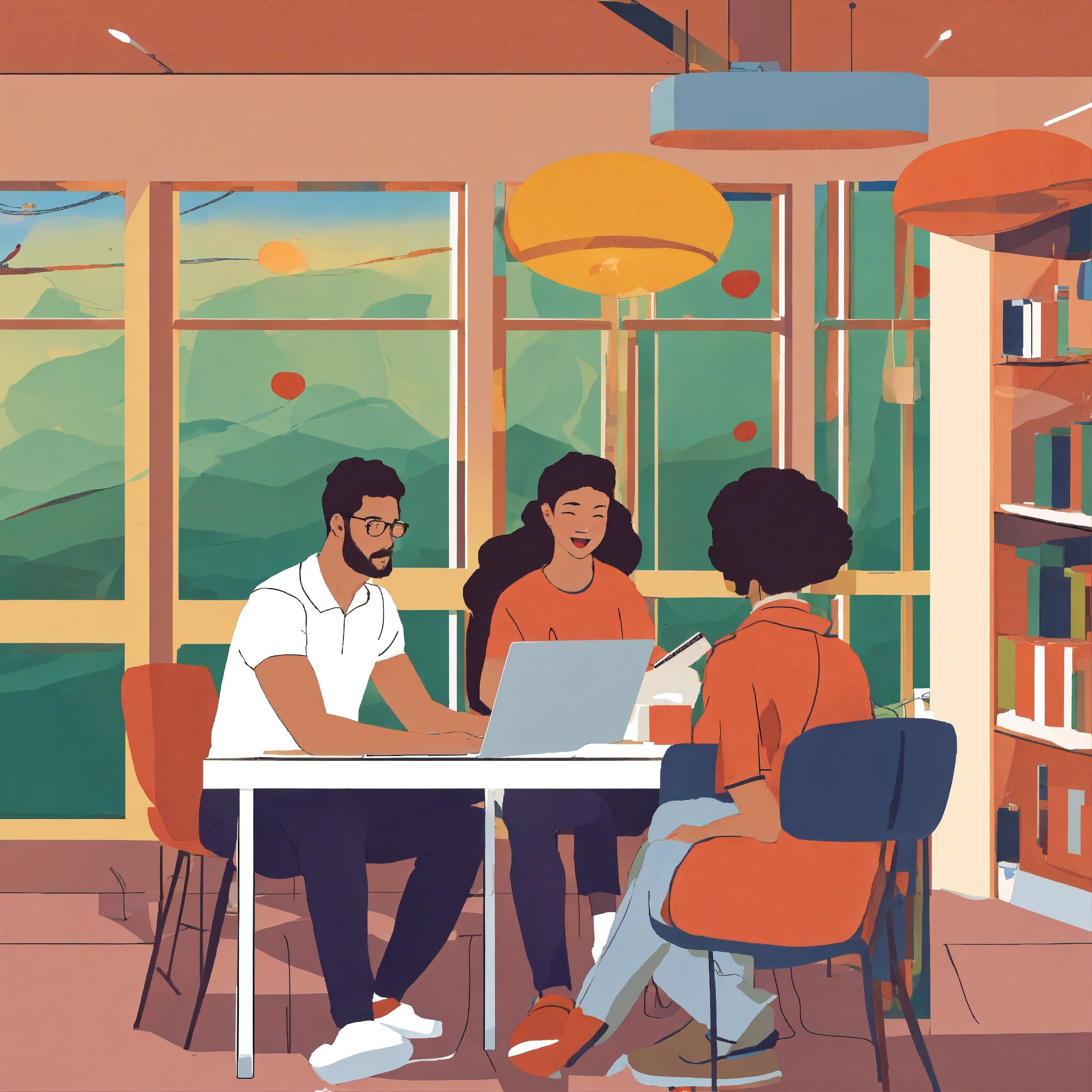 A college student and 2 adults with a computer people sitting at a table
