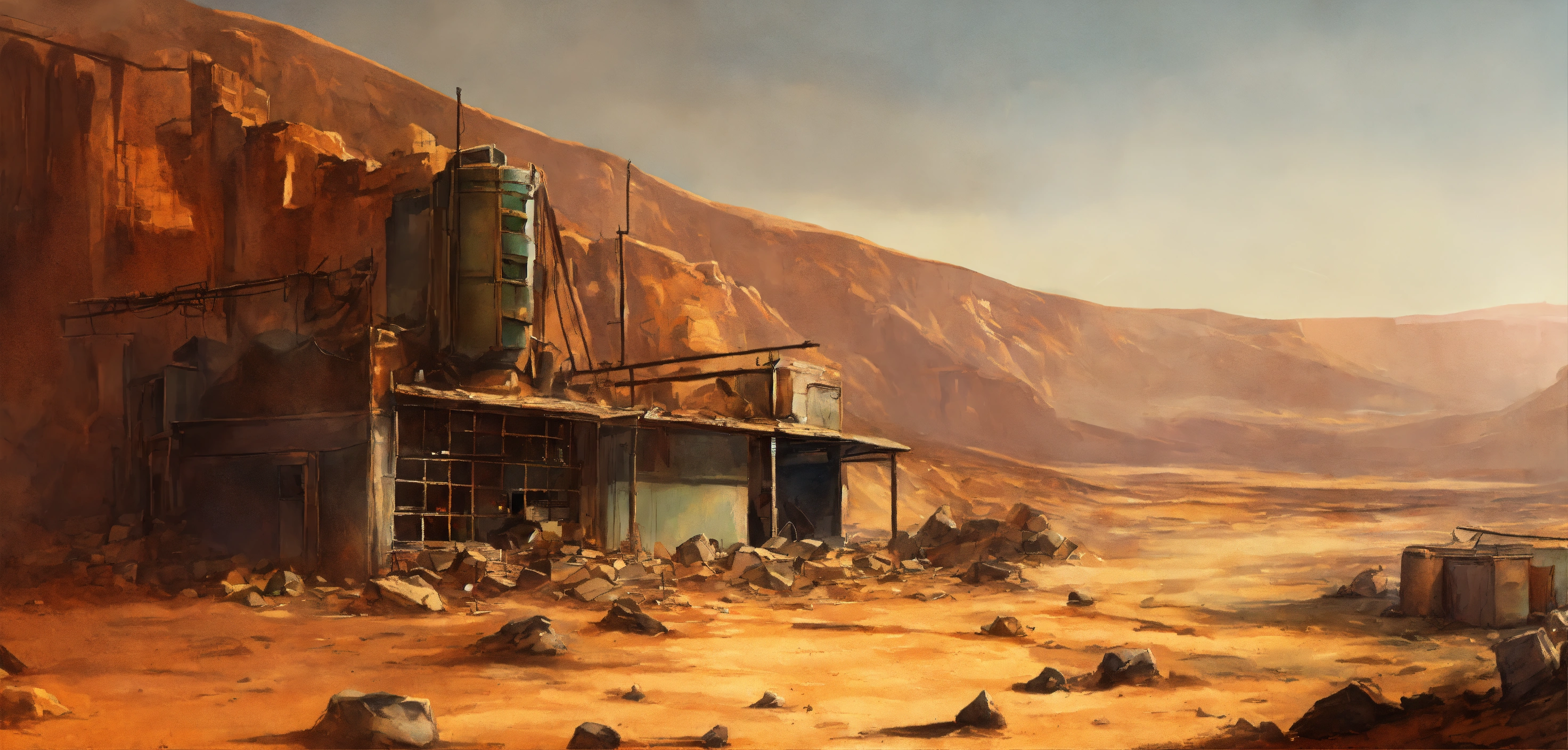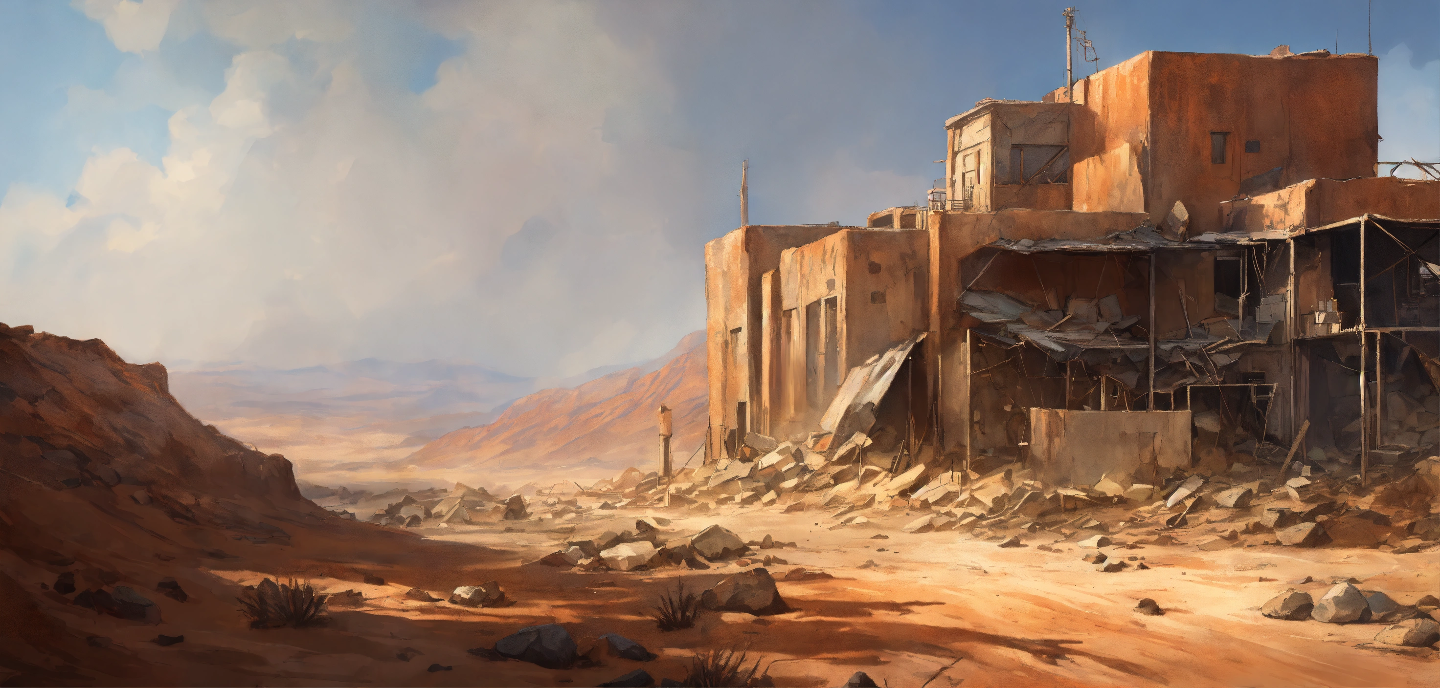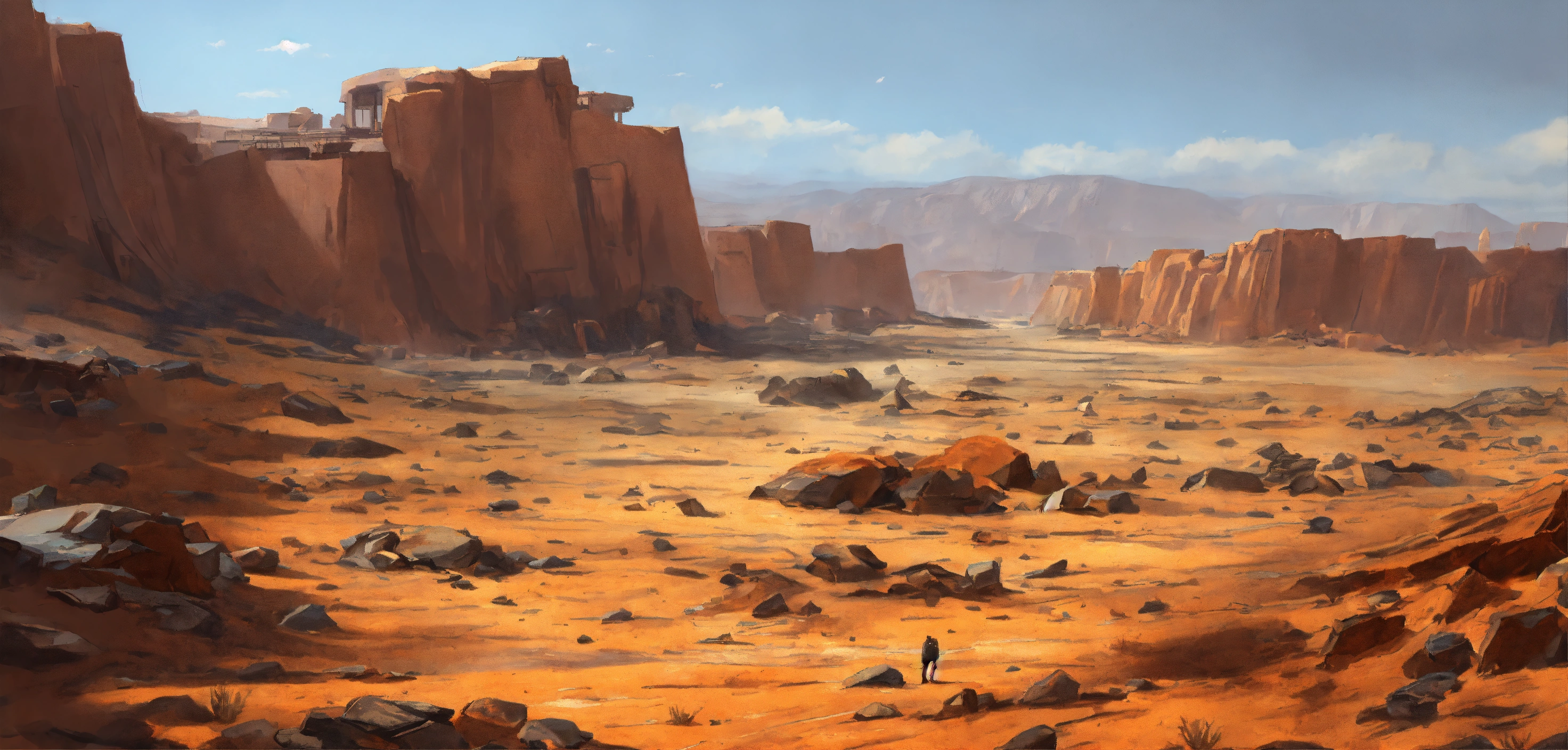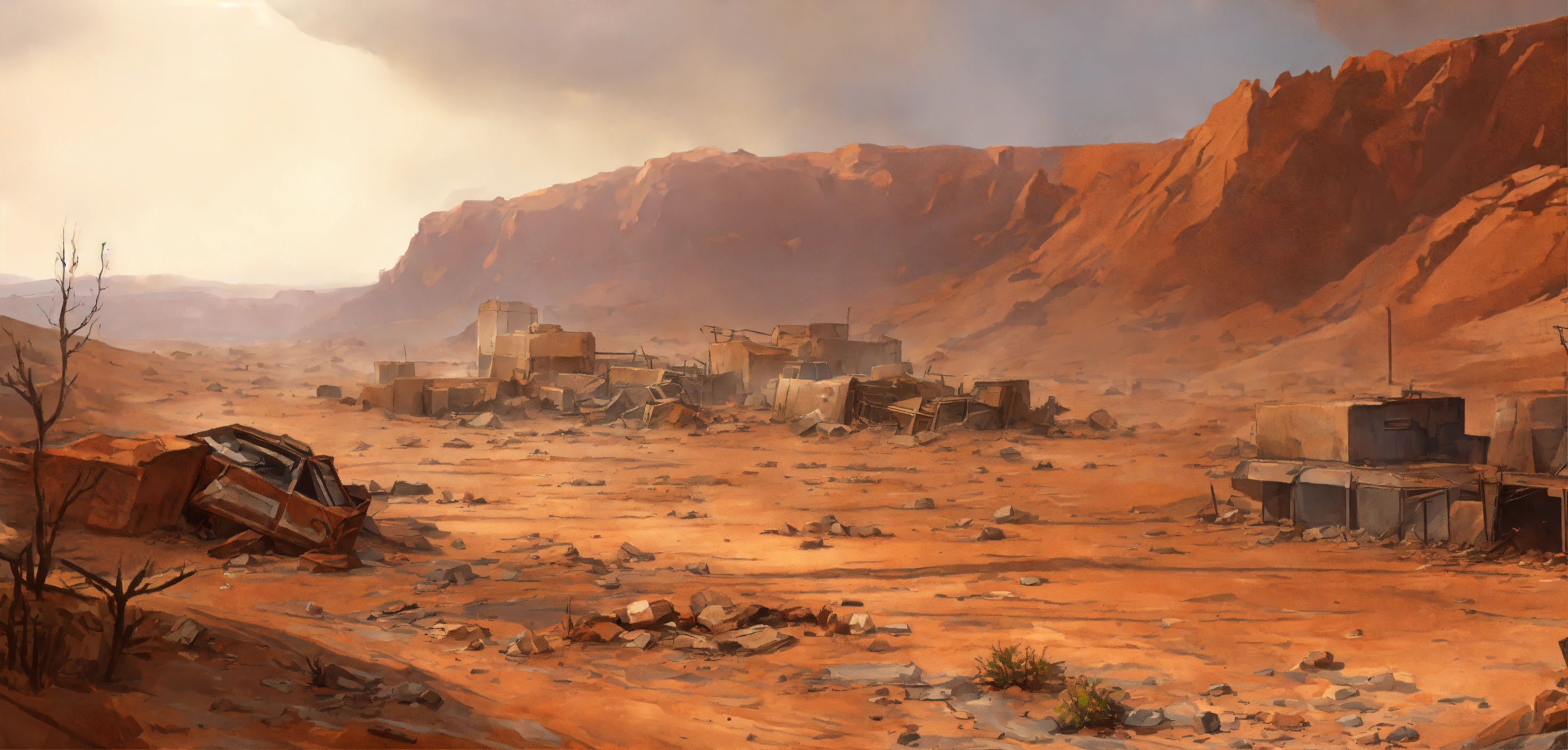 Conept art digital realistic painting, post apocalyptic, wasteland, terracotta earth, barren, rocks, concrete chunks, desert