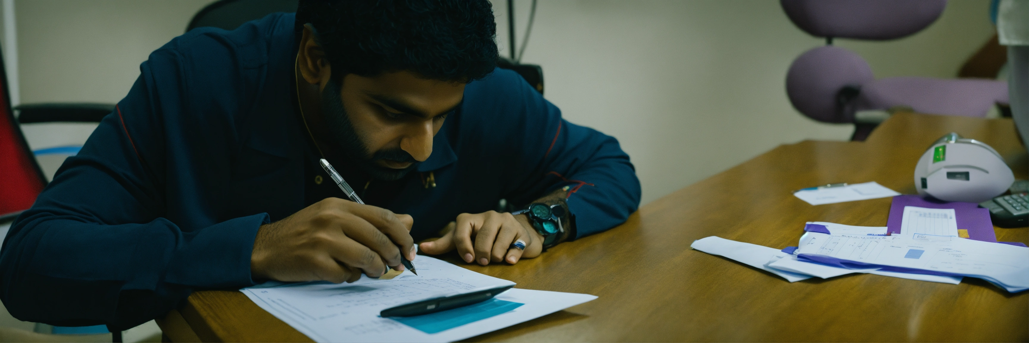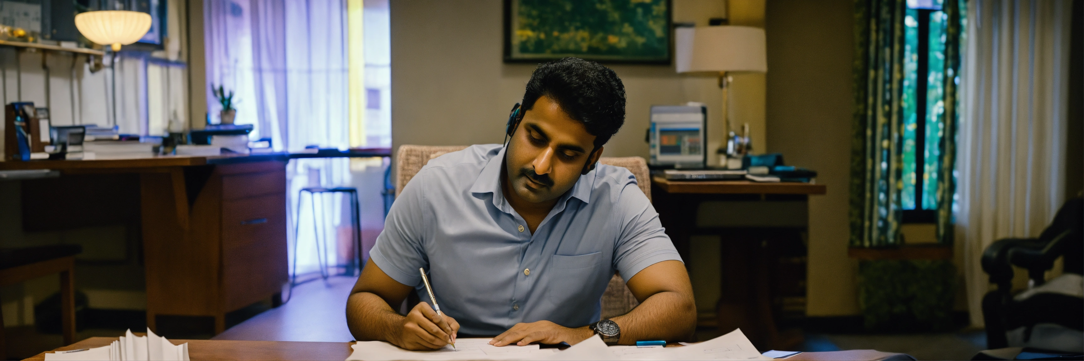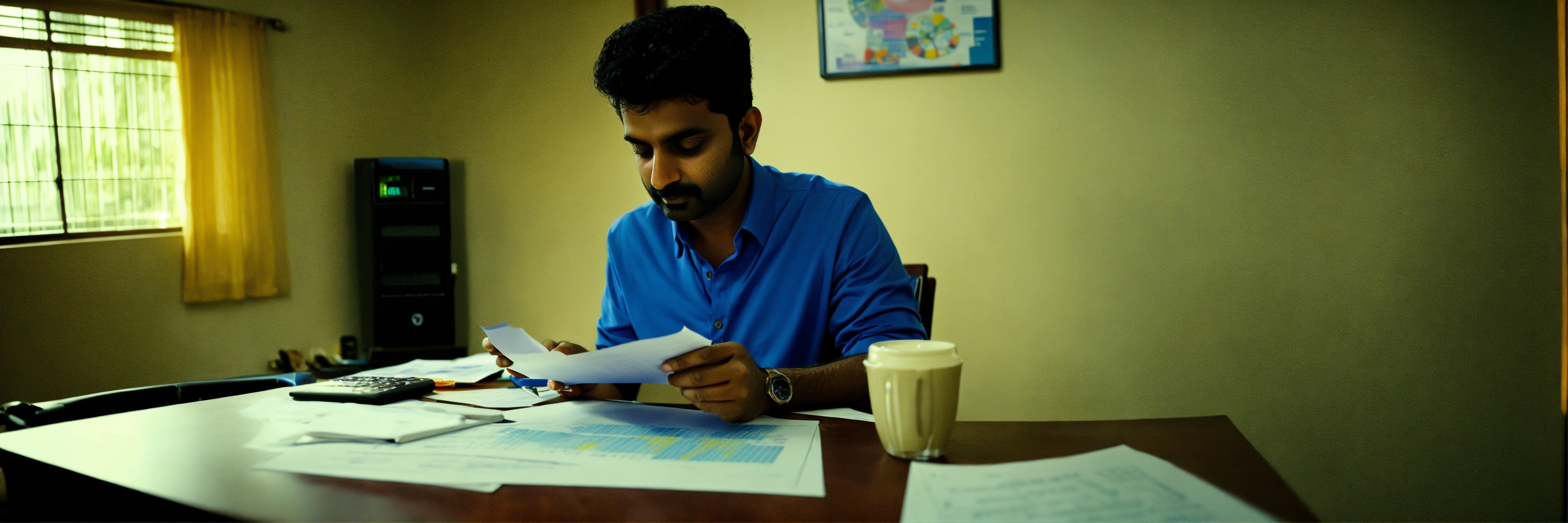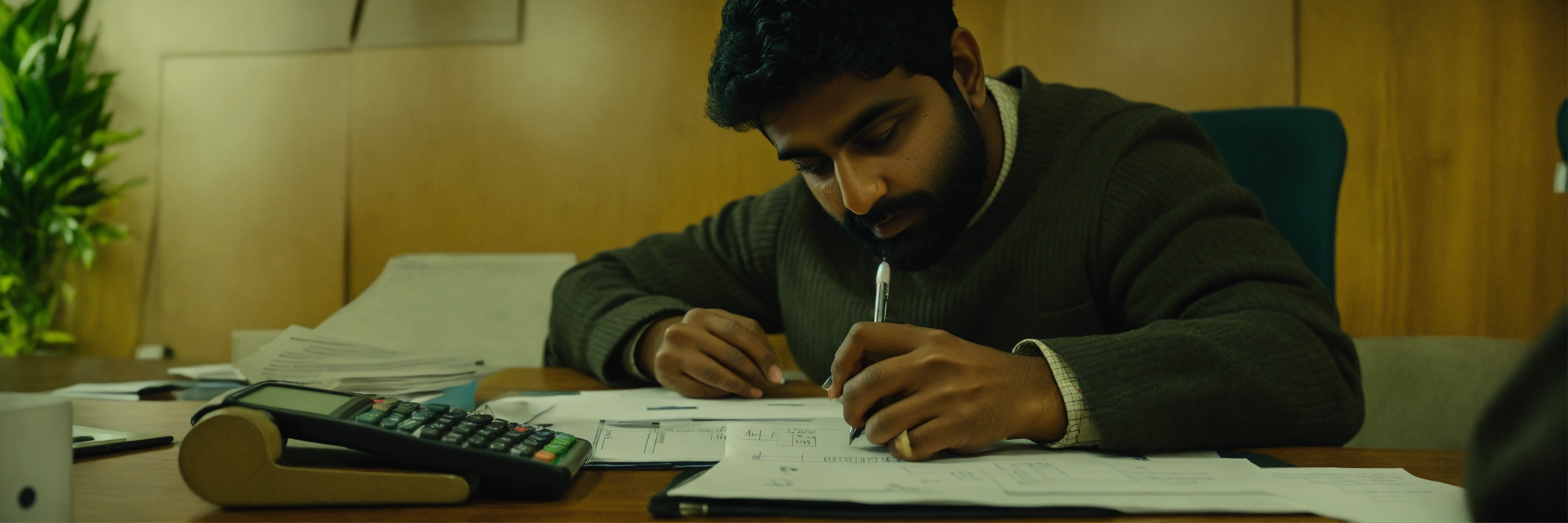 Ravi creating a financial plan, with a piece of paper and a calculator on the table, showing determination in his eyes.