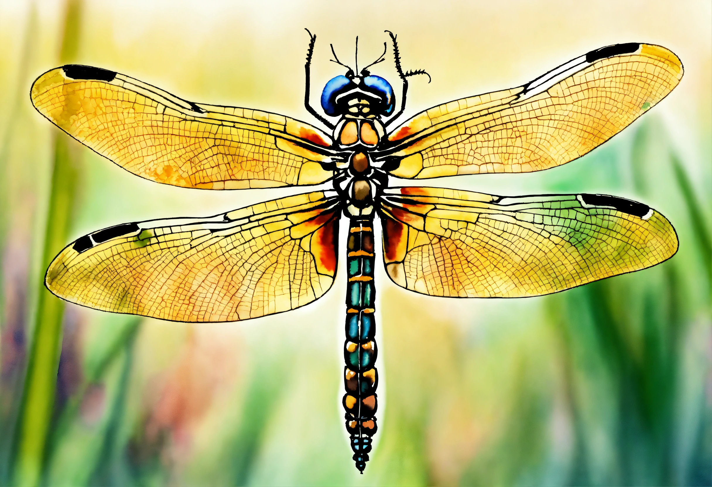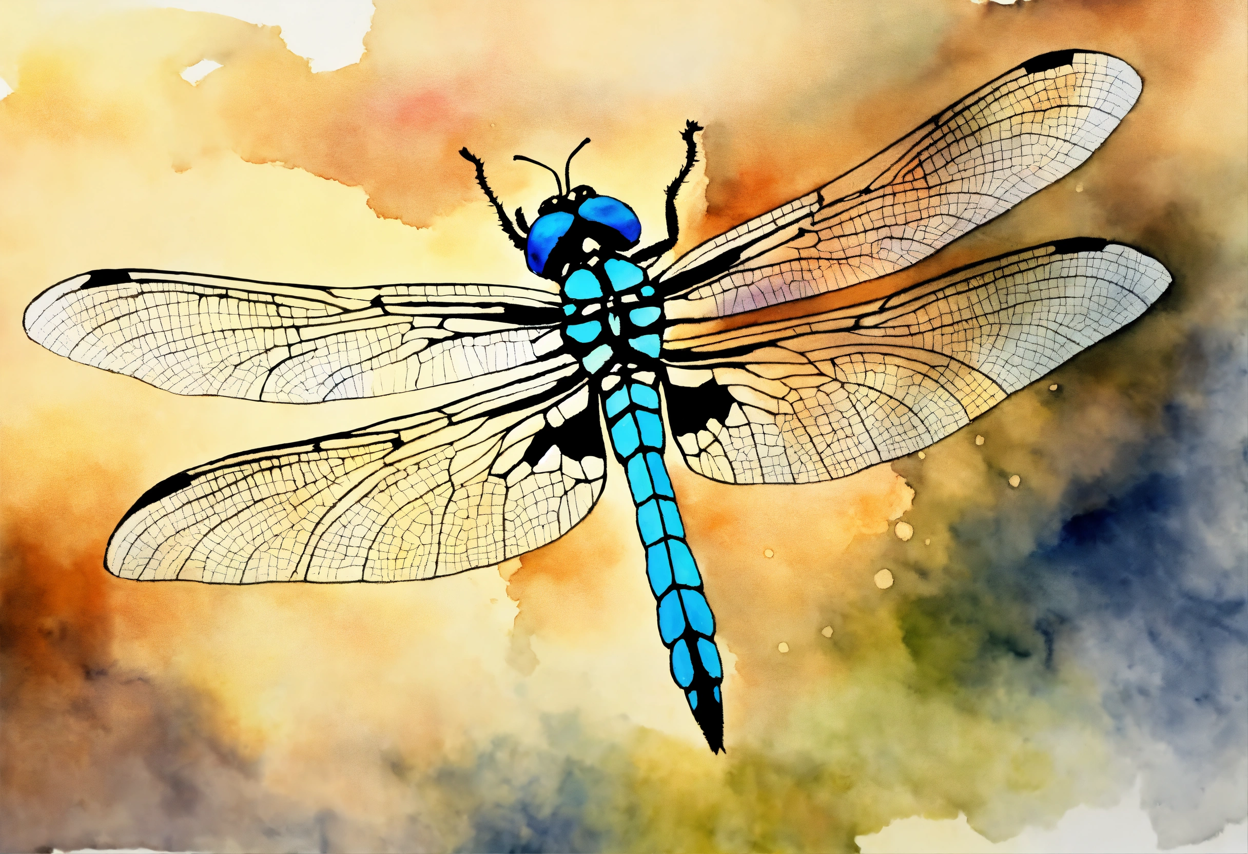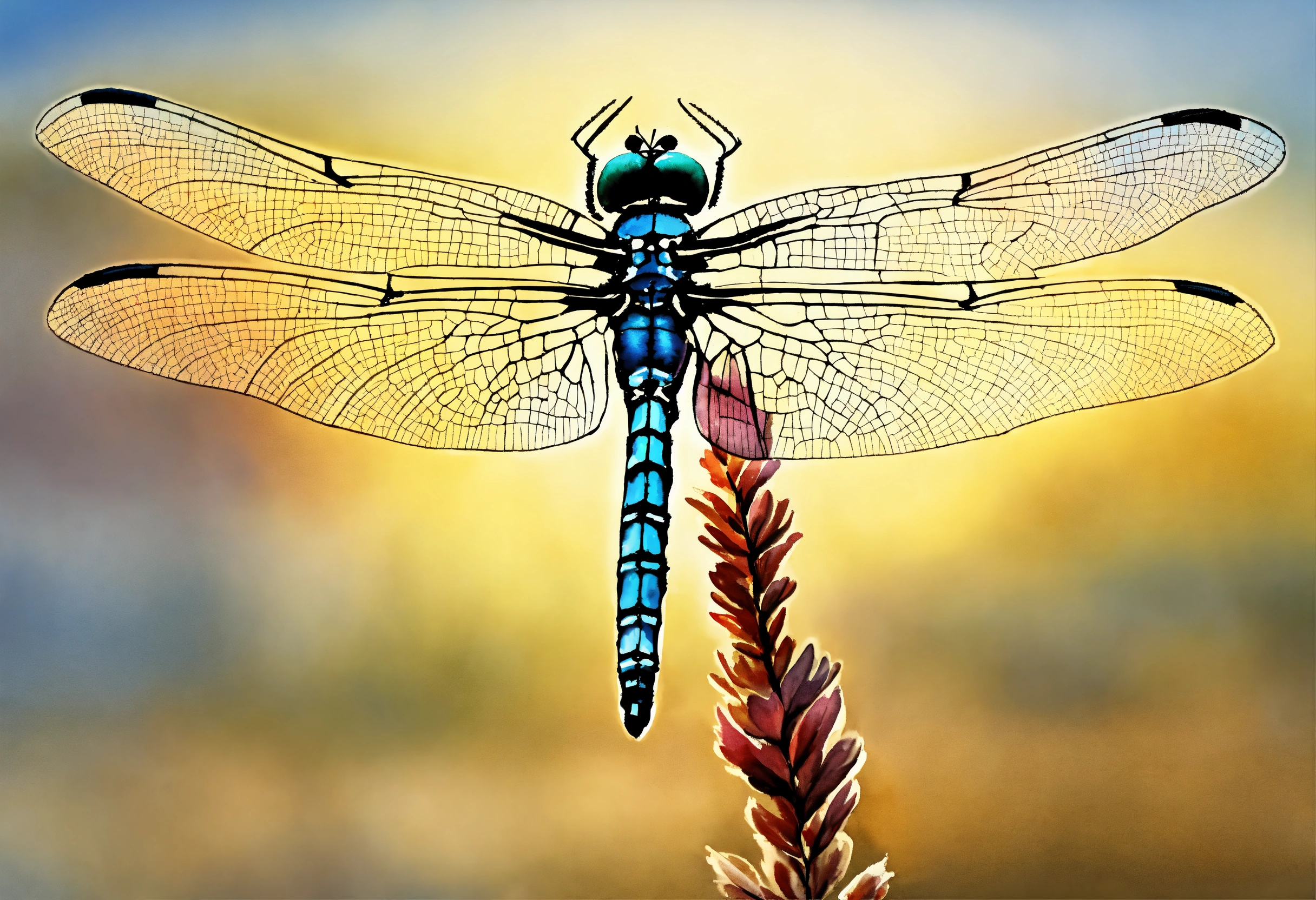 Watercolour painting, beautiful dragonfly on a white background, warm light, intricate and detailed, 8k, ultra-detailed, sharp focus