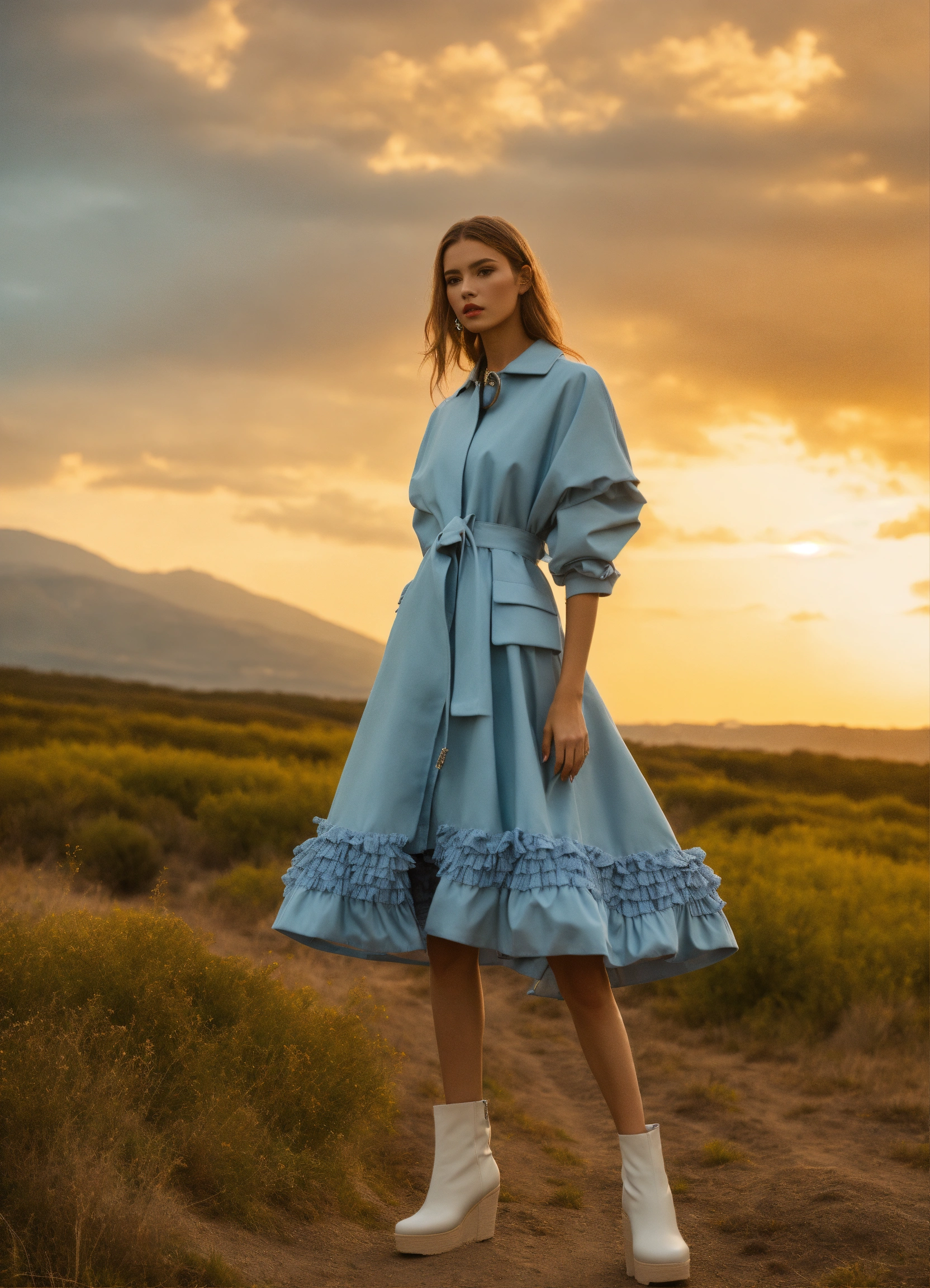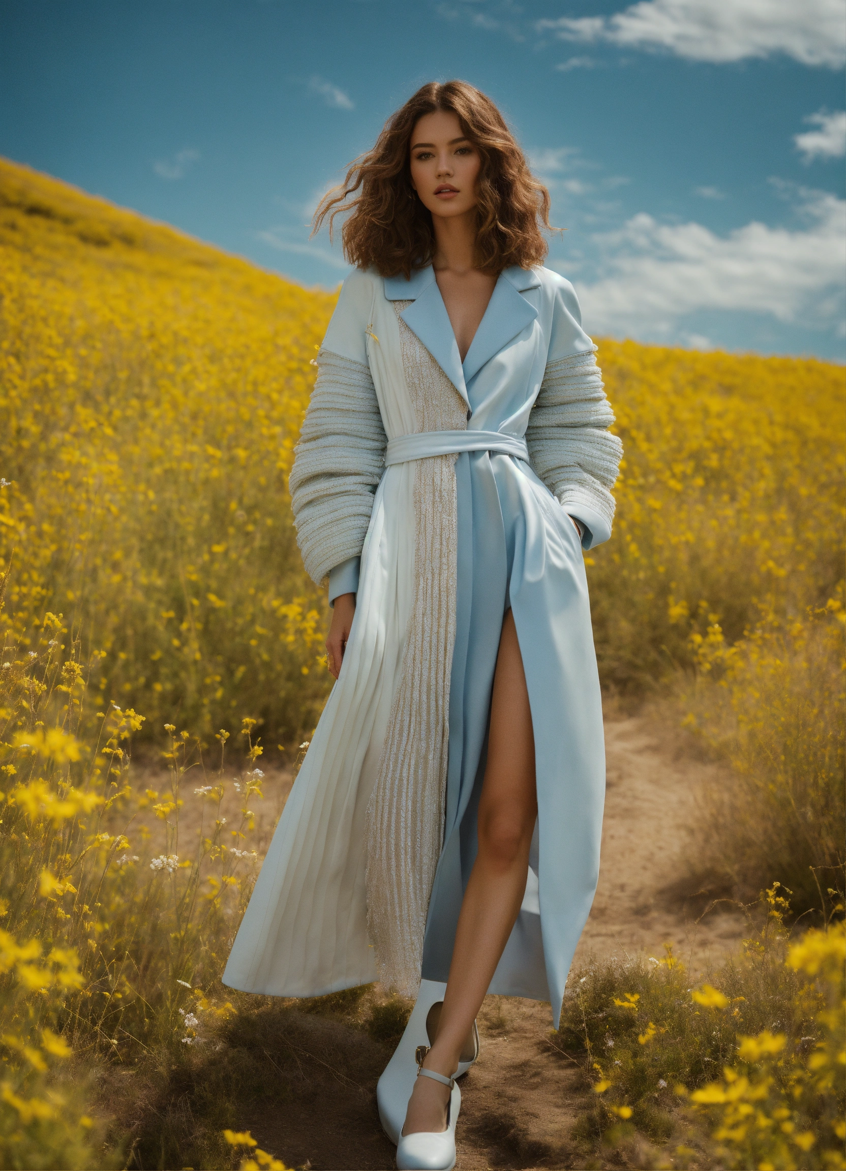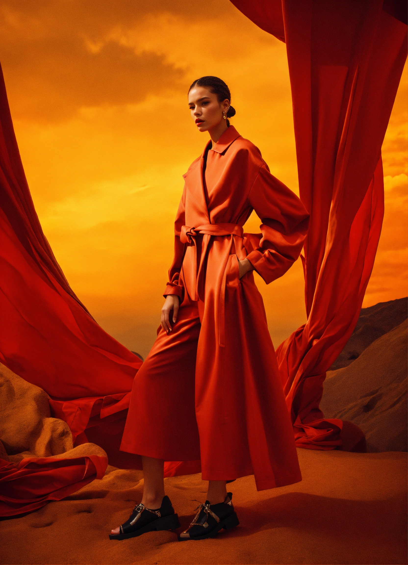 Ultra hd! editorial, fashion summer wrapped over casual coat collection, smocking, multiple fabrics, female models, structured outfit, platform, iso 400, surrealistic, 8k, full frame, landscape