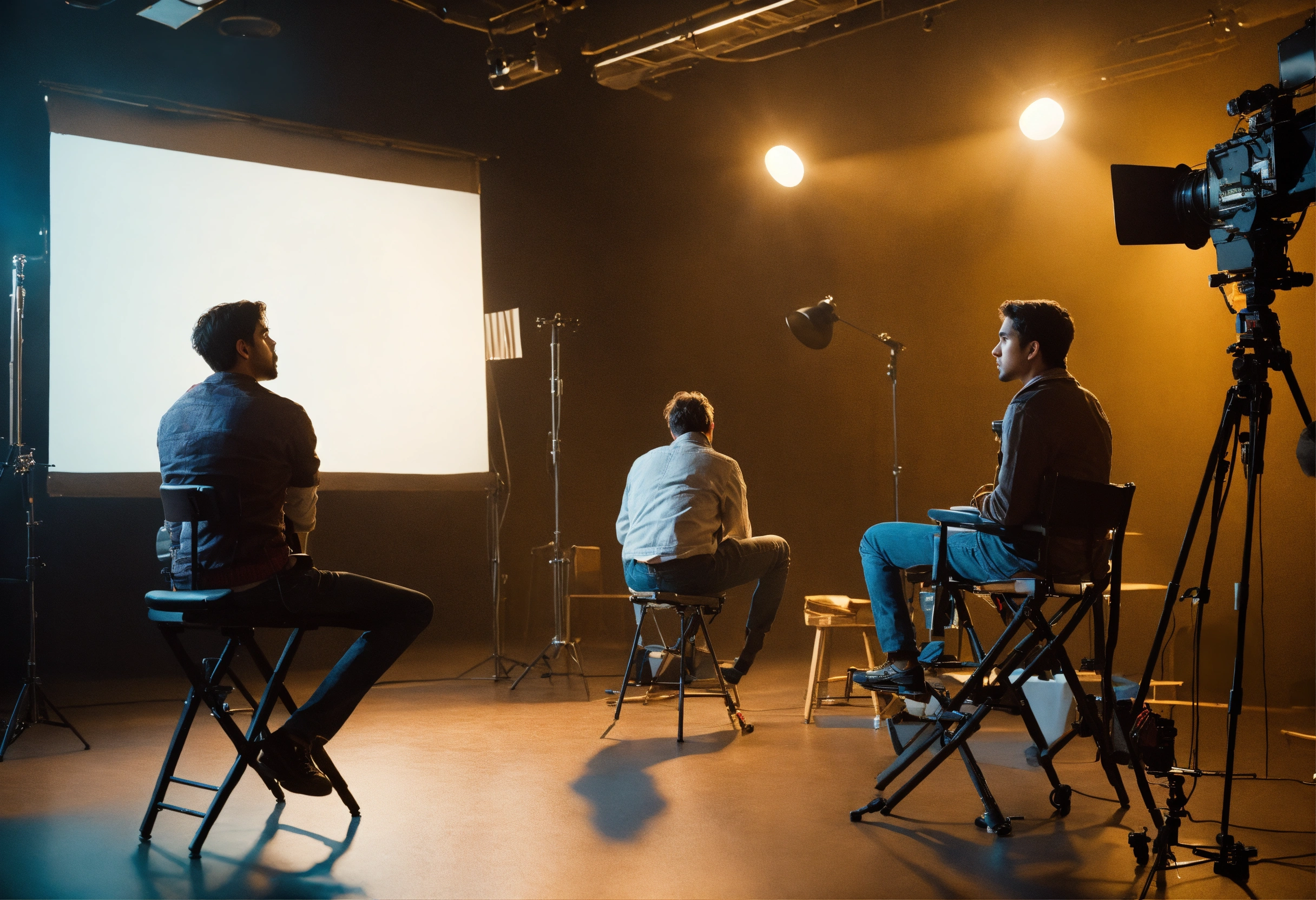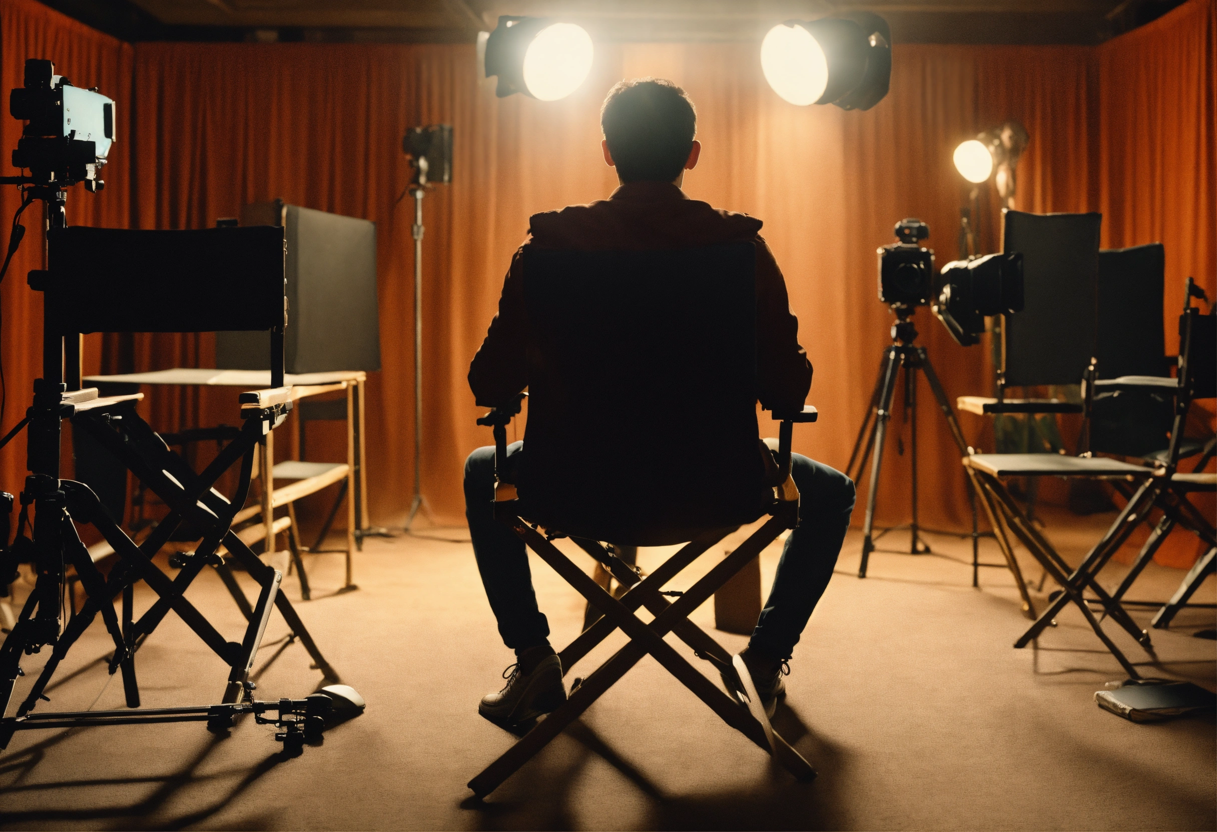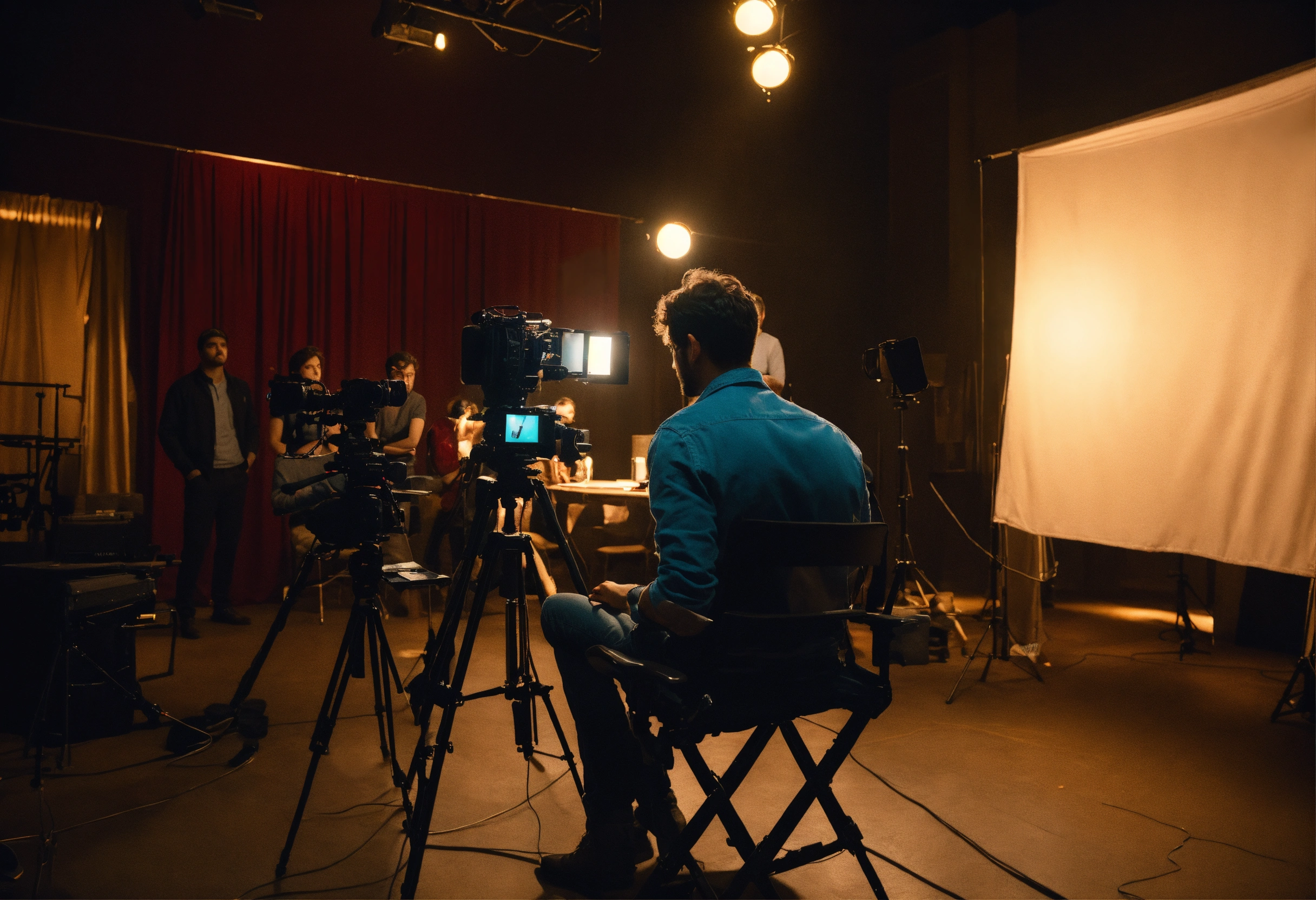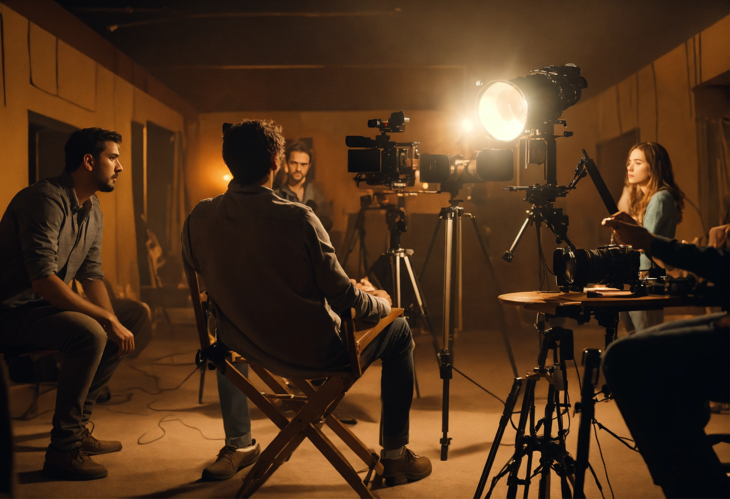The process of directing a film. a young film director in the director's chair looks towards the set where the actors are playing their roles. the director can be seen from the back. there are 3 actors on the set and the director is sitting in a chair and directing the actors. realistic. a clear correct focus. full frame. 3d, 4k, soft light directed at the actors, complex details, depth of field, beautiful lighting. details.