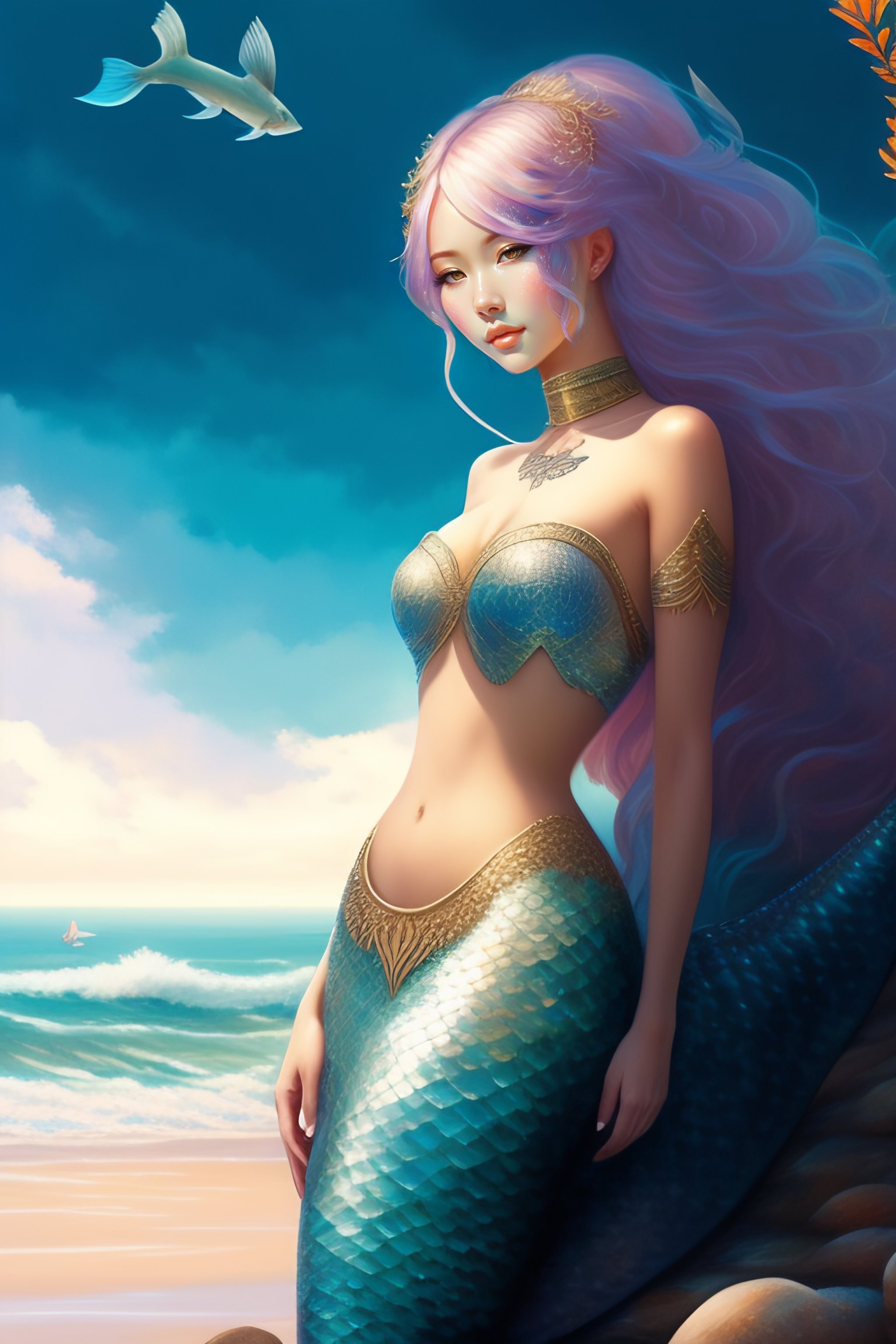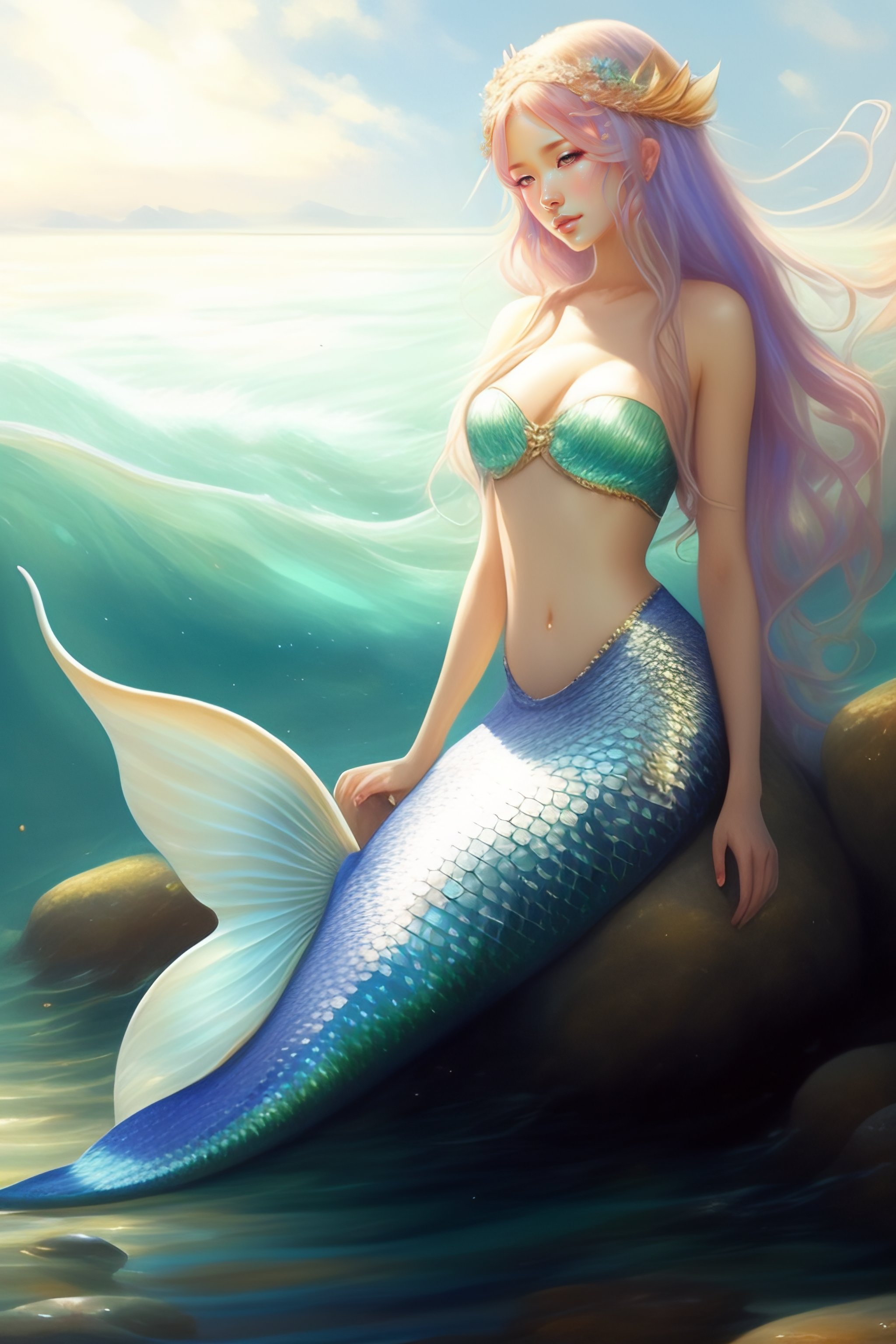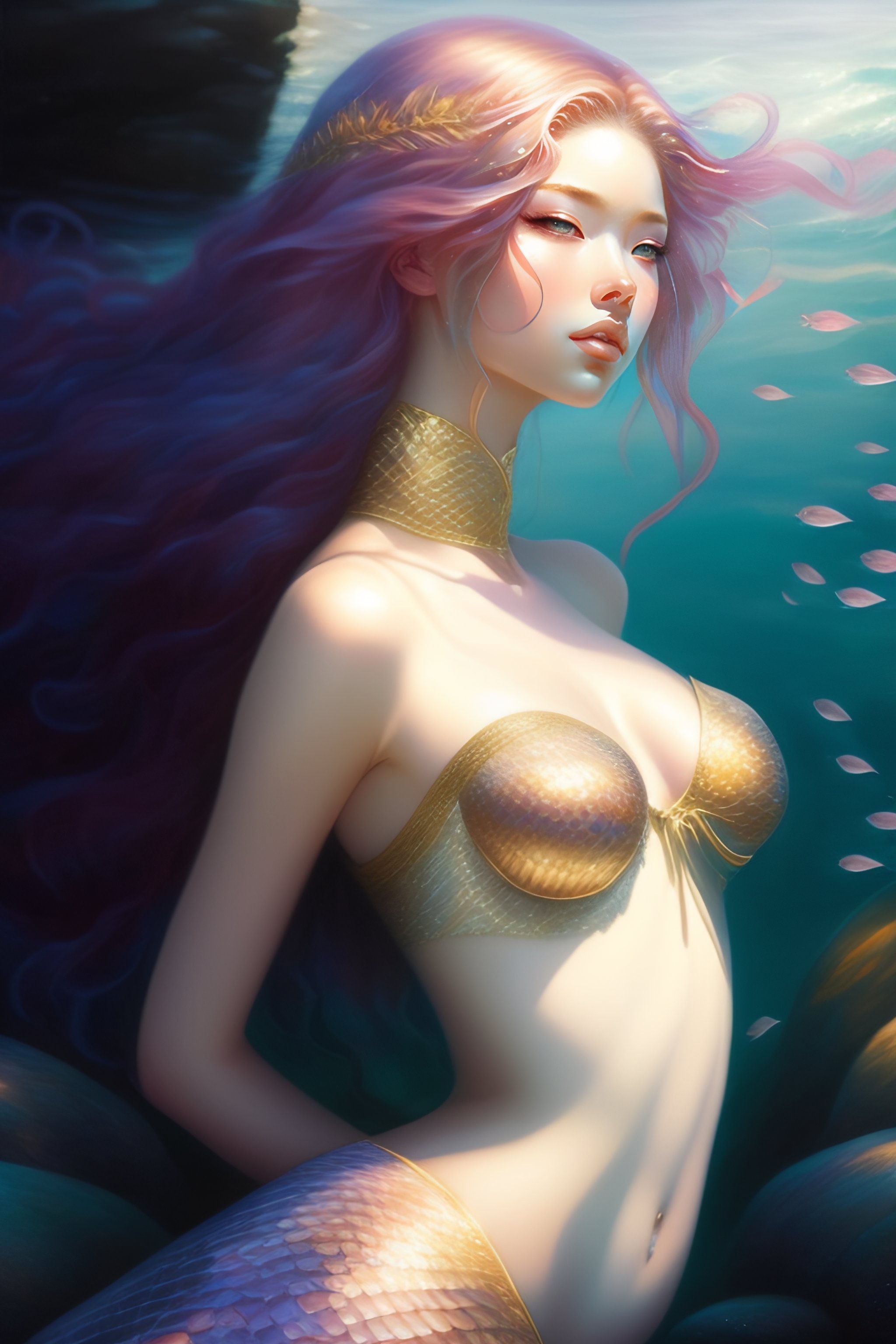 Mermaid wearing a mermaid tail costume with clam shell top, full body shot, strong impressionism paint style, 1.618, intricate, elaborate, strong expressiveness and emotionality, cinematic lighting, visual clarity, art by krenz cushart, by relseiy, by miho hirano, anime