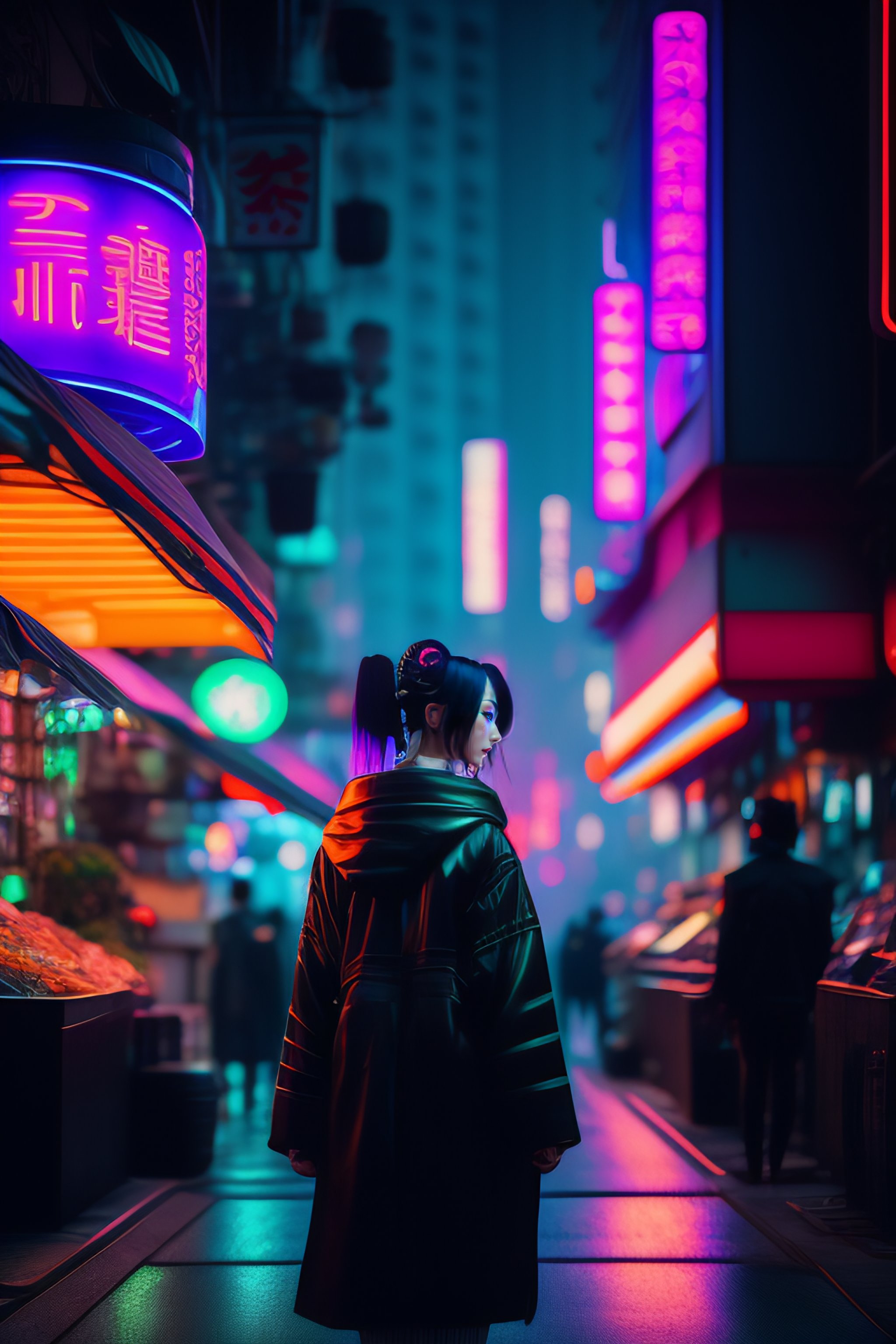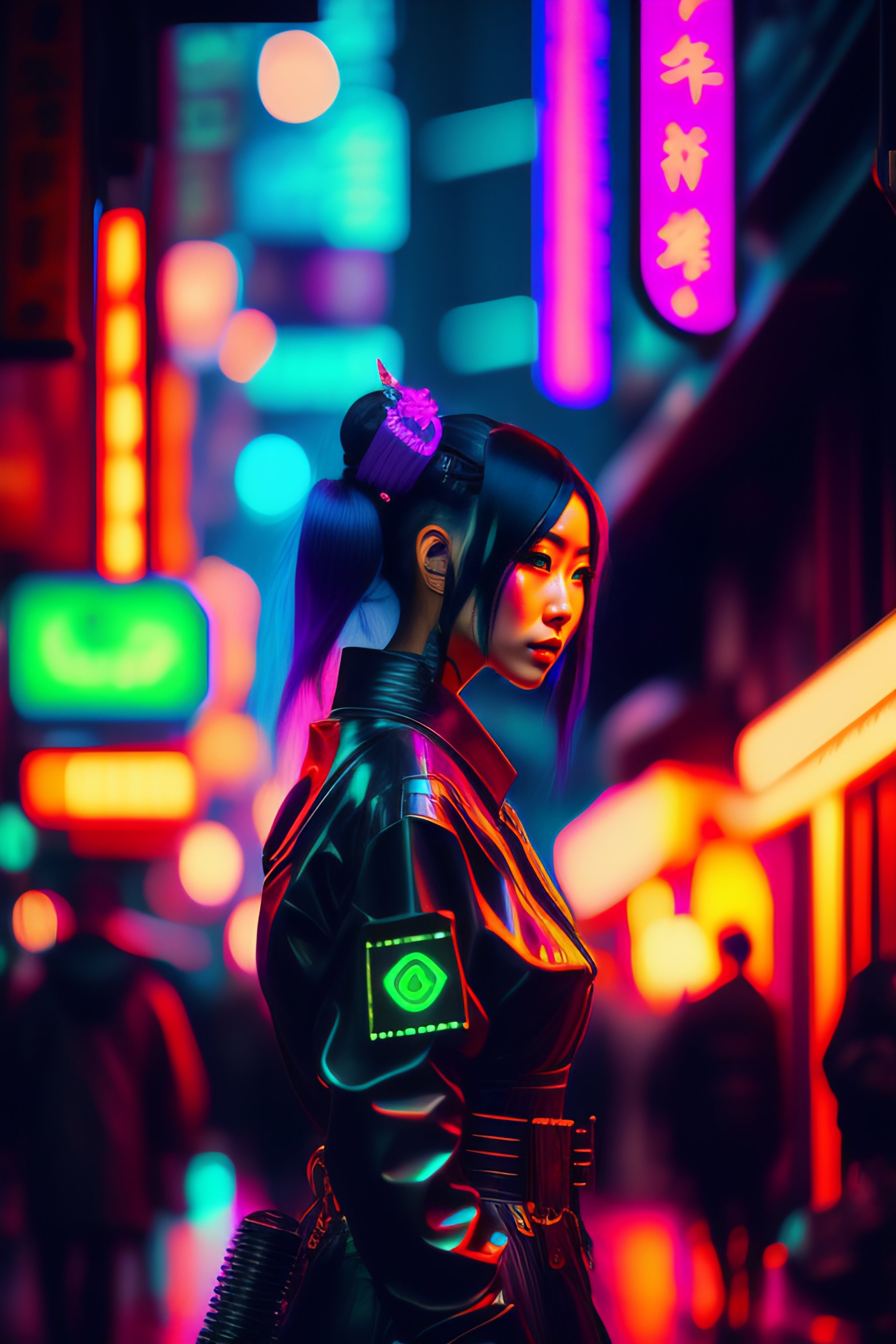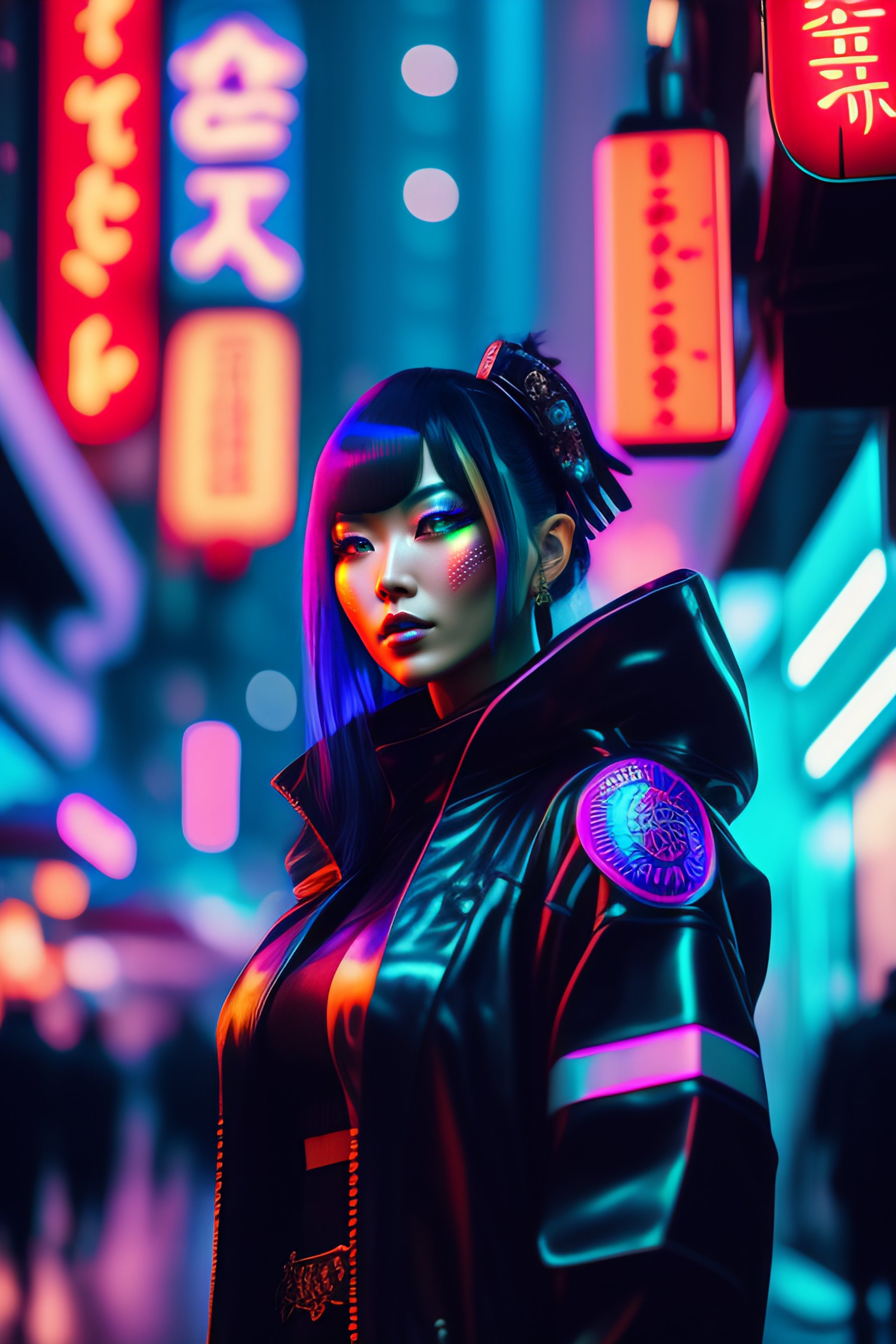 Full body, cyber goth geisha in a tokyo street, pretty face, beautiful eyes, anime, portrait, dark aesthetic, neon sunset background, concept art, digital art, anime art, unreal engine, greg rutkowski, loish, rhads, beeple, makoto shinkai, haruyo morita and lois van baarle, ilya kuvshinov, cyberpunk black tokyo market, indoor in the style of blade runner, stands illuminated by greens neon lights, crowded with cyborgs photorealistic, 3 5 mm, grainy ruined film, dark color scheme, ray tracing, unreal engine, 4 k