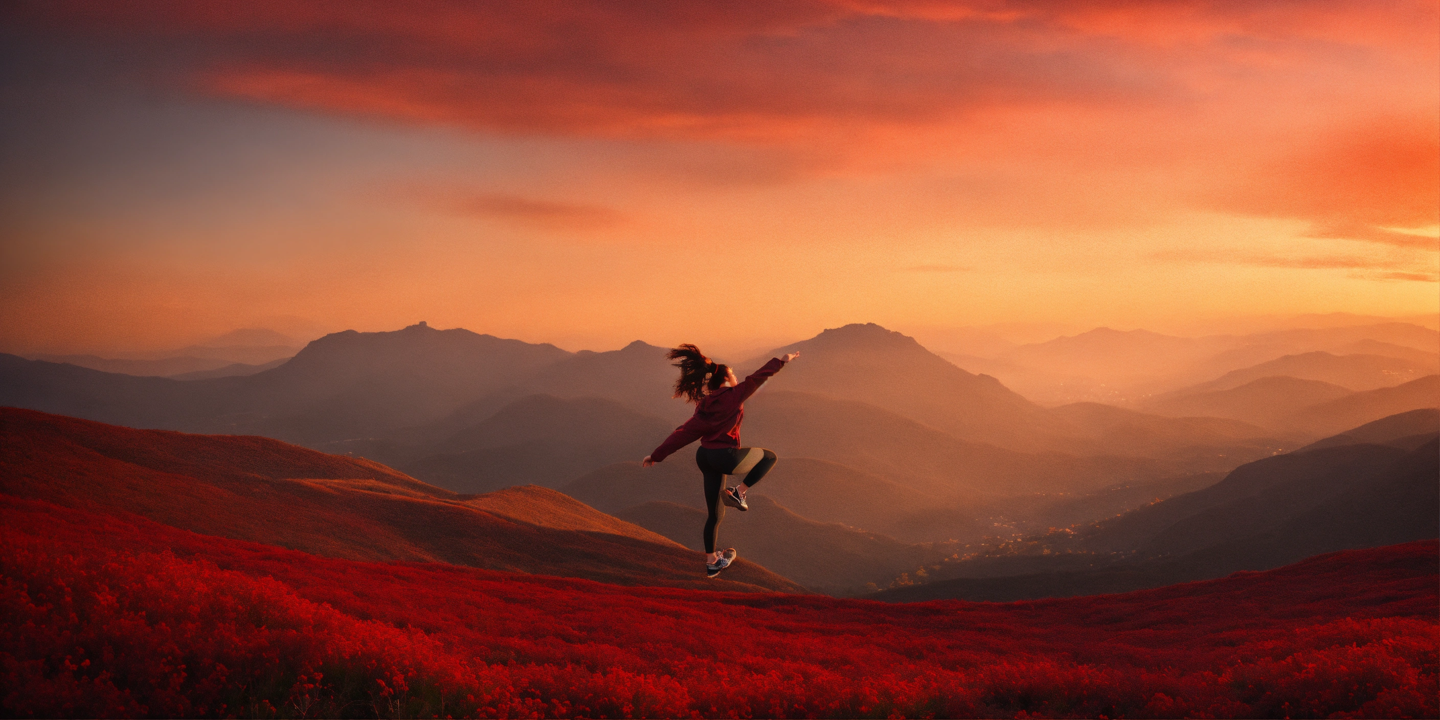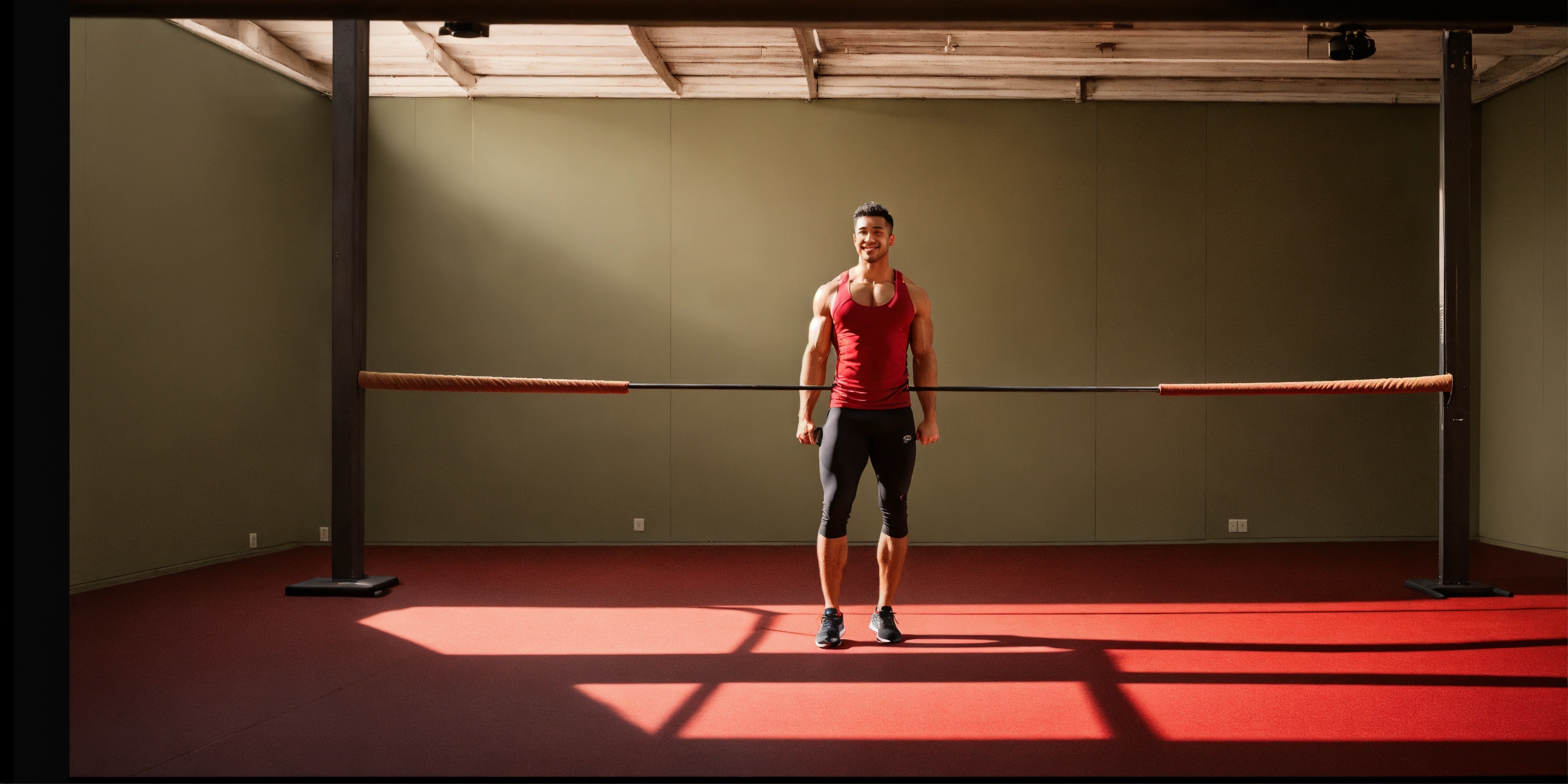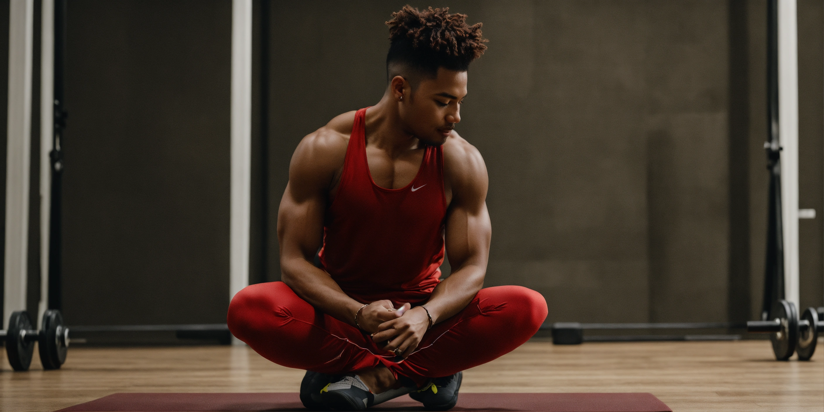 A person who has achieved a noticeable yet sustainable transformation in their body and mindset. they should be elegantly dressed for a workout and doing calisthenics, set against a minimalistic backdrop infused with warm tones that harmonize beautifully with deep, rich shades of dark red and grays. the focus should be on the individual's well-being, happiness, and personal growth, emphasizing a balanced and joyful lifestyle
