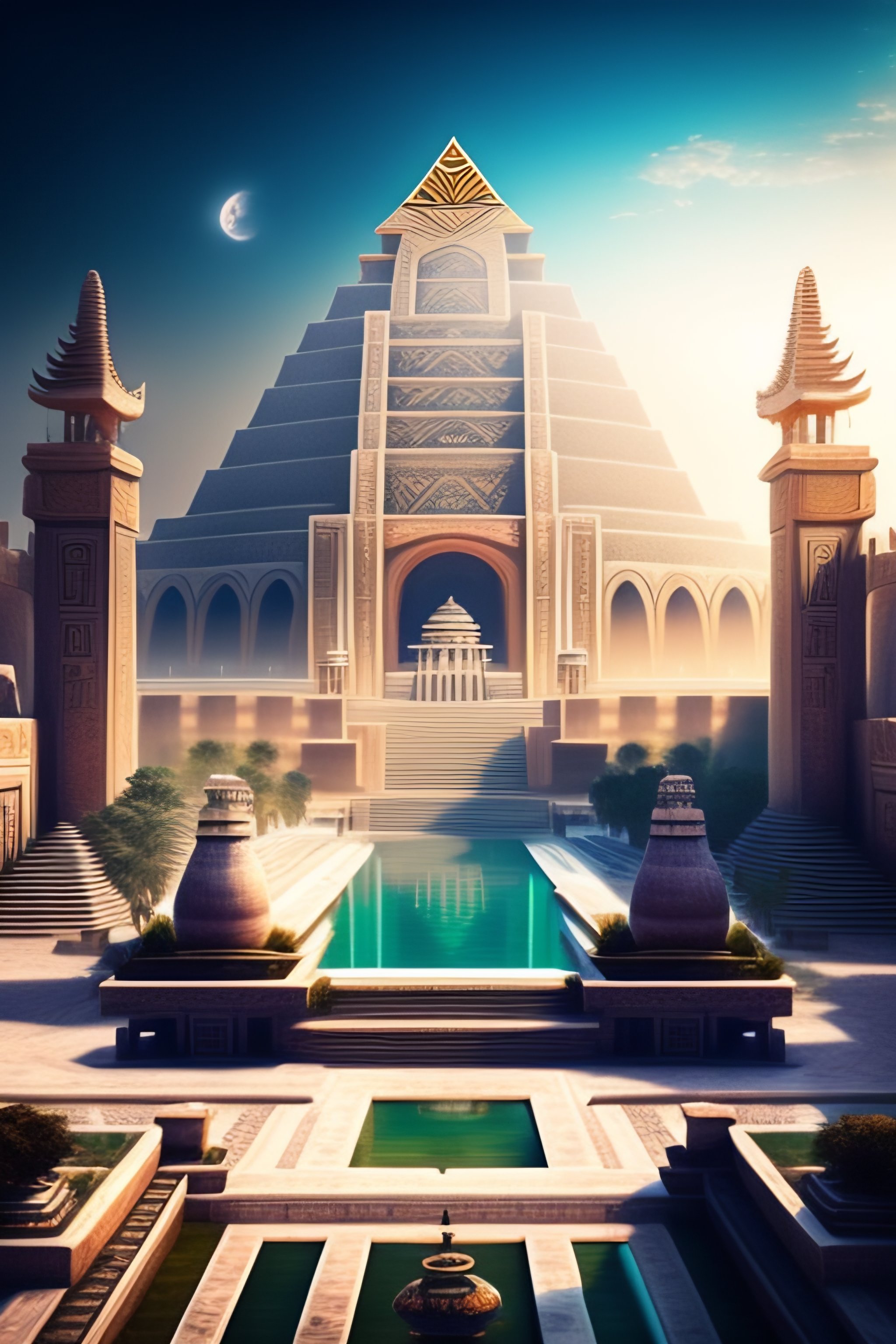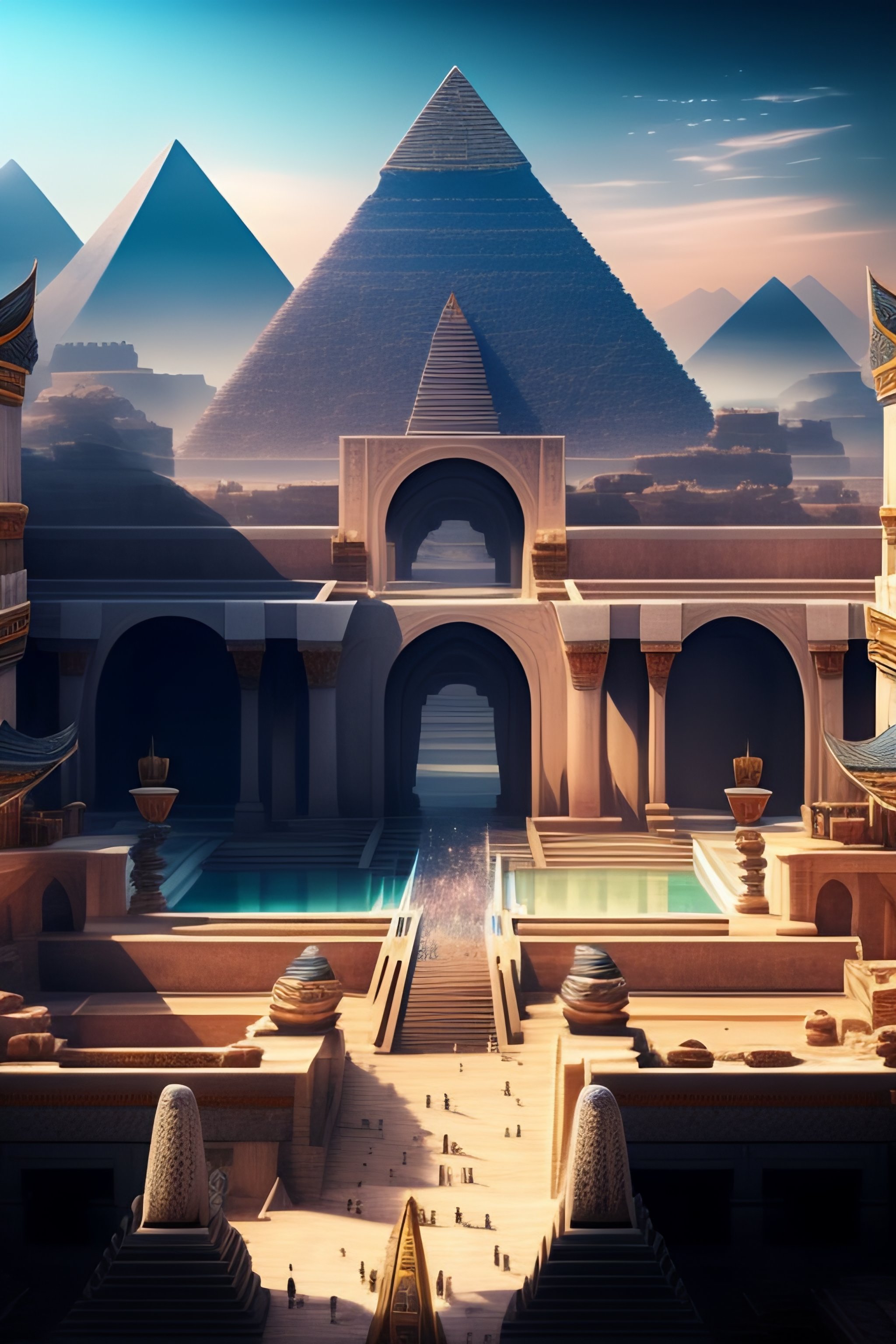 A white glowing magical pyramid in the center of an ancient fantasy roman egyptian chinese city with many statues of large women with wings and a colosseum and fountains and gardens and obelisks and the city is surrounded by water