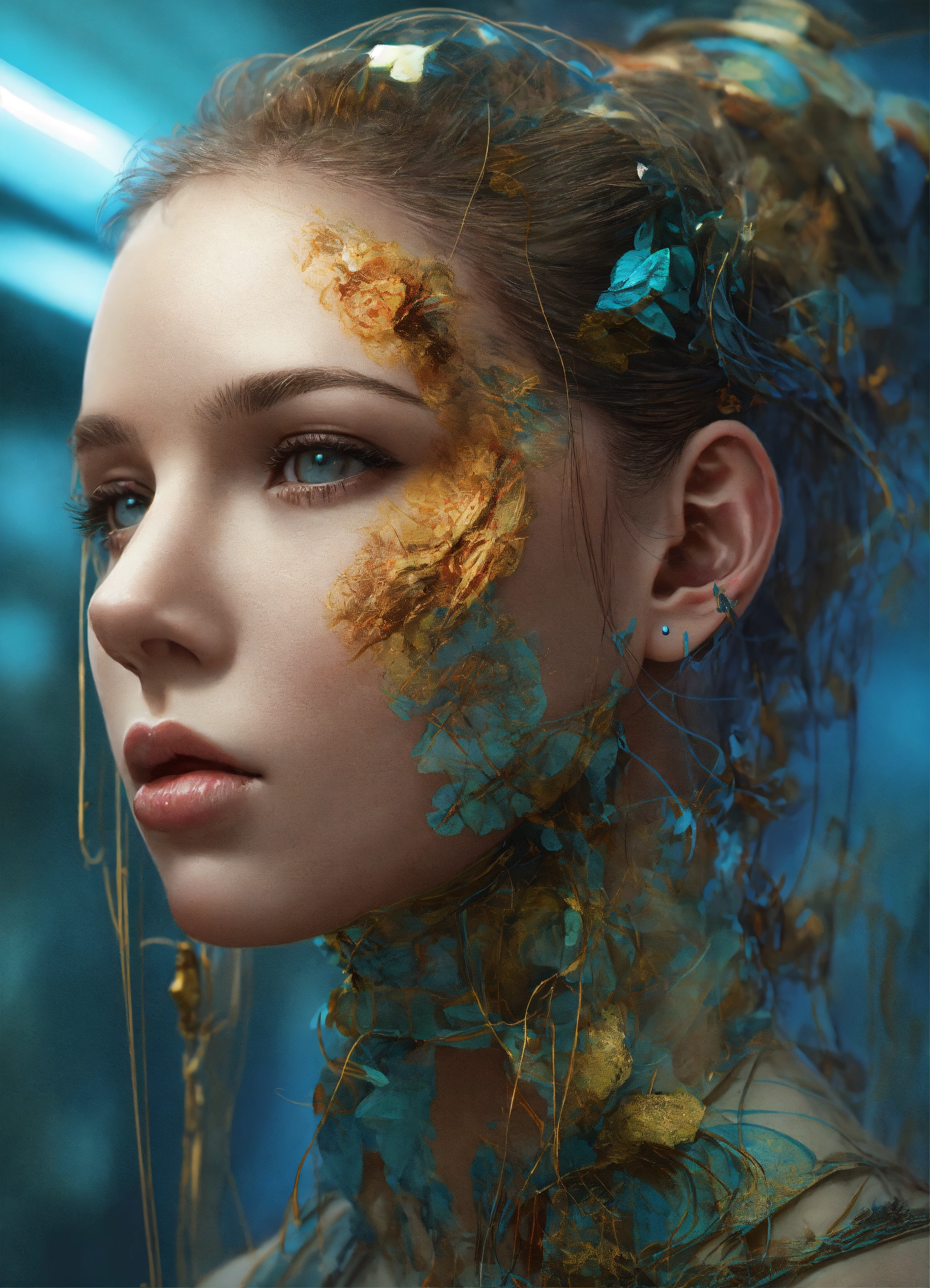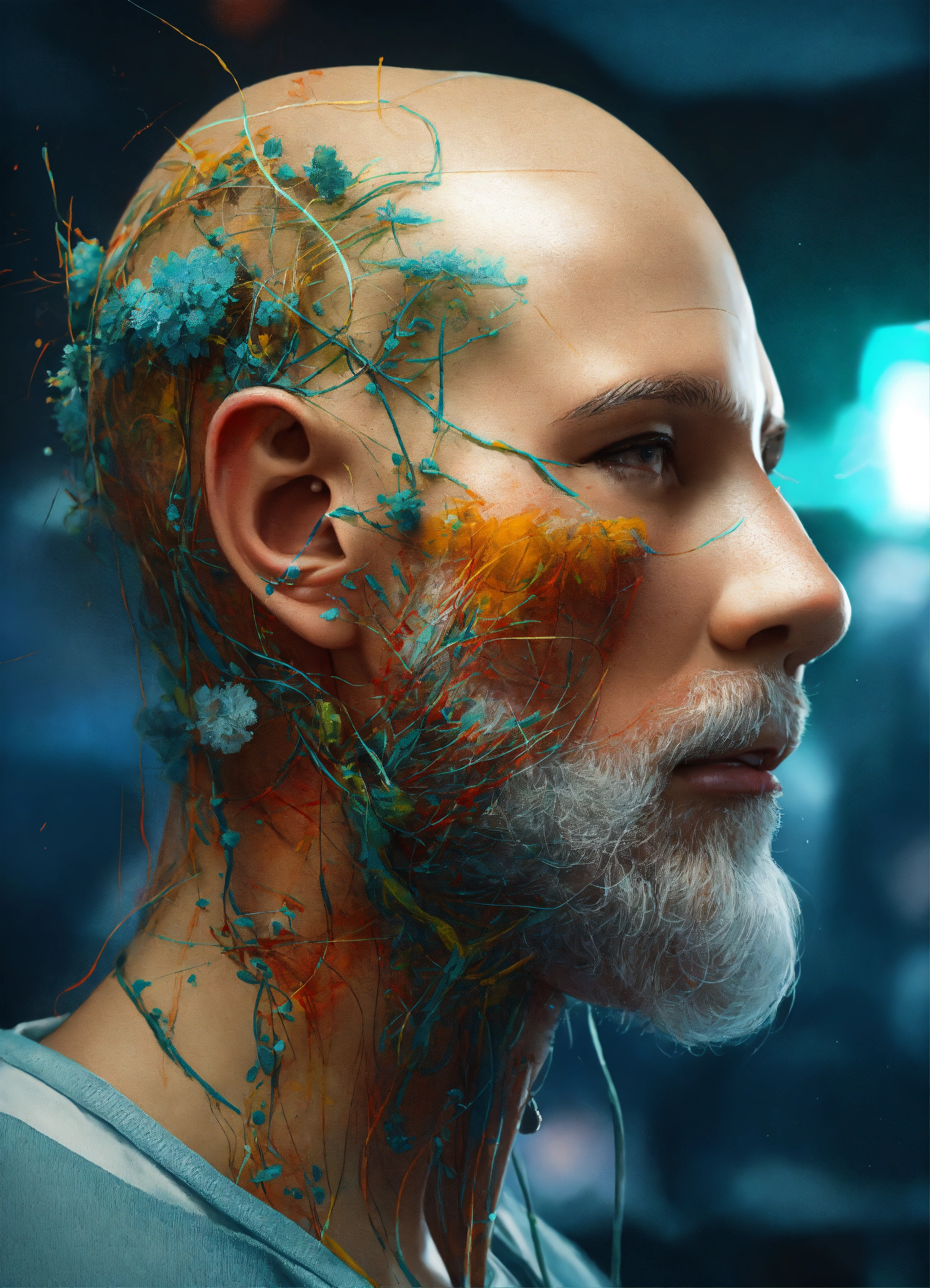 Professionelles porträt einer außerirdischen rasse, tätowierter mann, großer kopf, form des kopfes mit 3d-knochenwucherungen unter der haut auf dem kopf, normales gesicht, ganzkörper-seitenansicht, meer und wolken im hintergrund, meer ist ozeanblau, das männchen hat eine natürliche farbe, abstrakte schönheit, nähert sich der perfektion, zart gesicht, dynamisch, mondlicht, sehr detailliert, digitale malerei, artstation, konzeptkunst, glatt, scharfer fokus, illustration, kunst von carne griffiths und wadim kashin