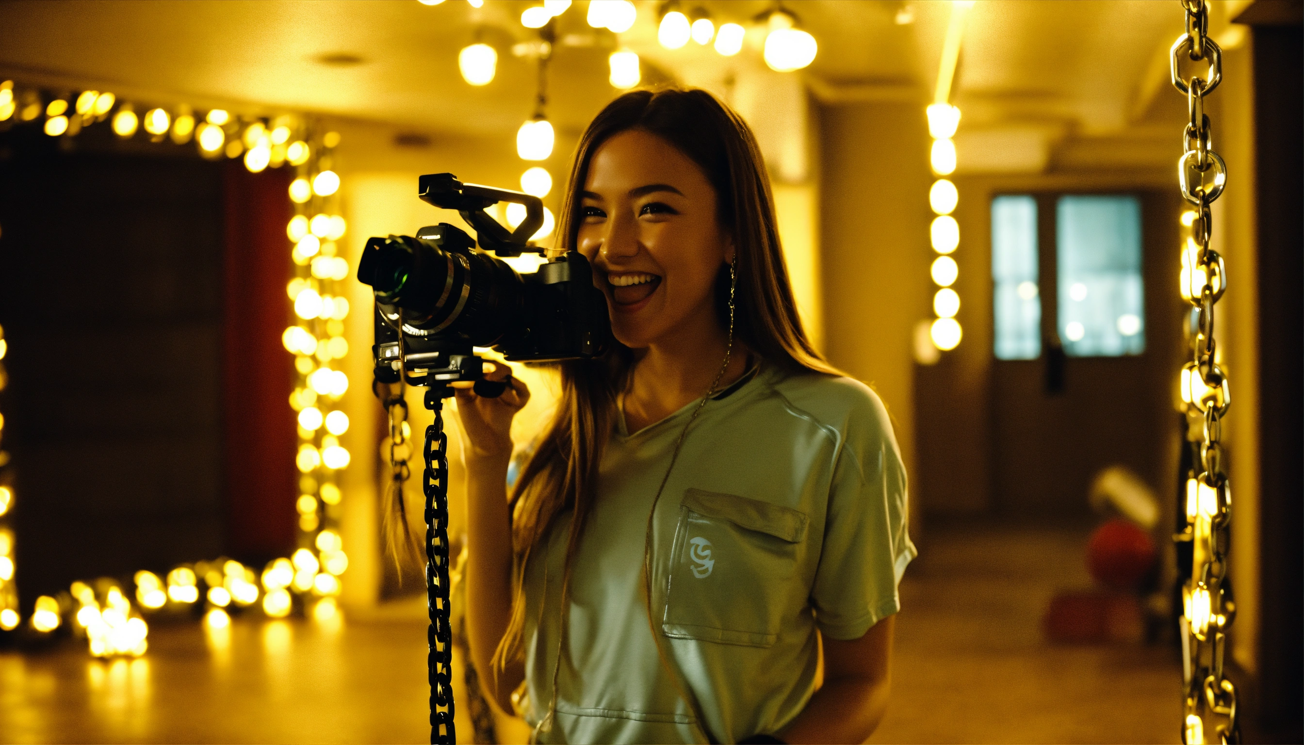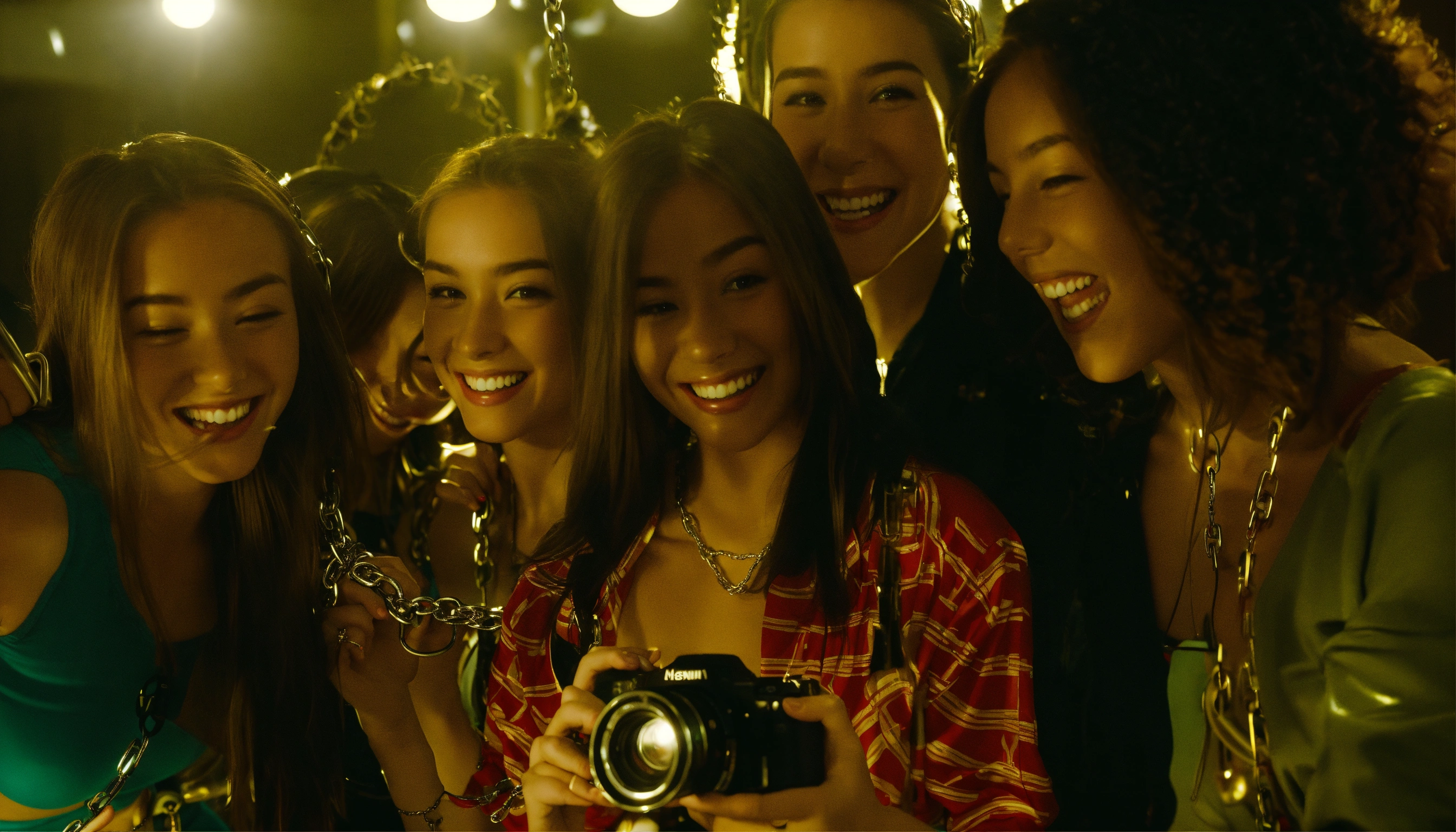 Group of mischievous college students, female, university residence basement, shiny gym clothes, smiling, laughing, holding cameras, video cameras, taking photos, cameras, spotlights, film shoot, photo shoot, holding chrome chains, low angle shot, looking down at us, bright lighting