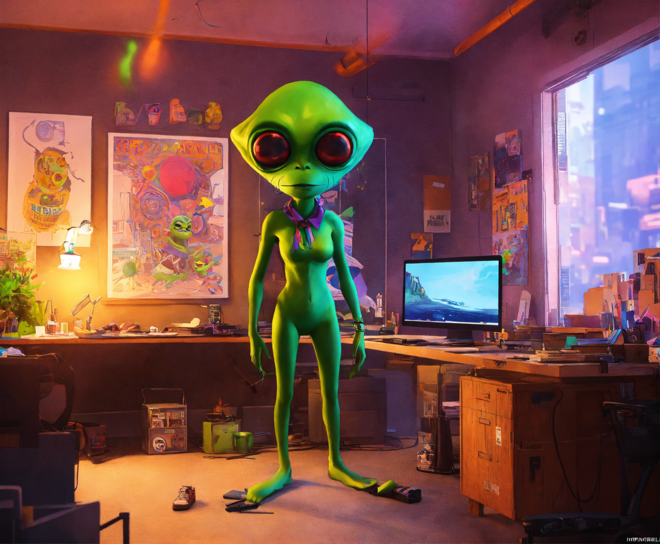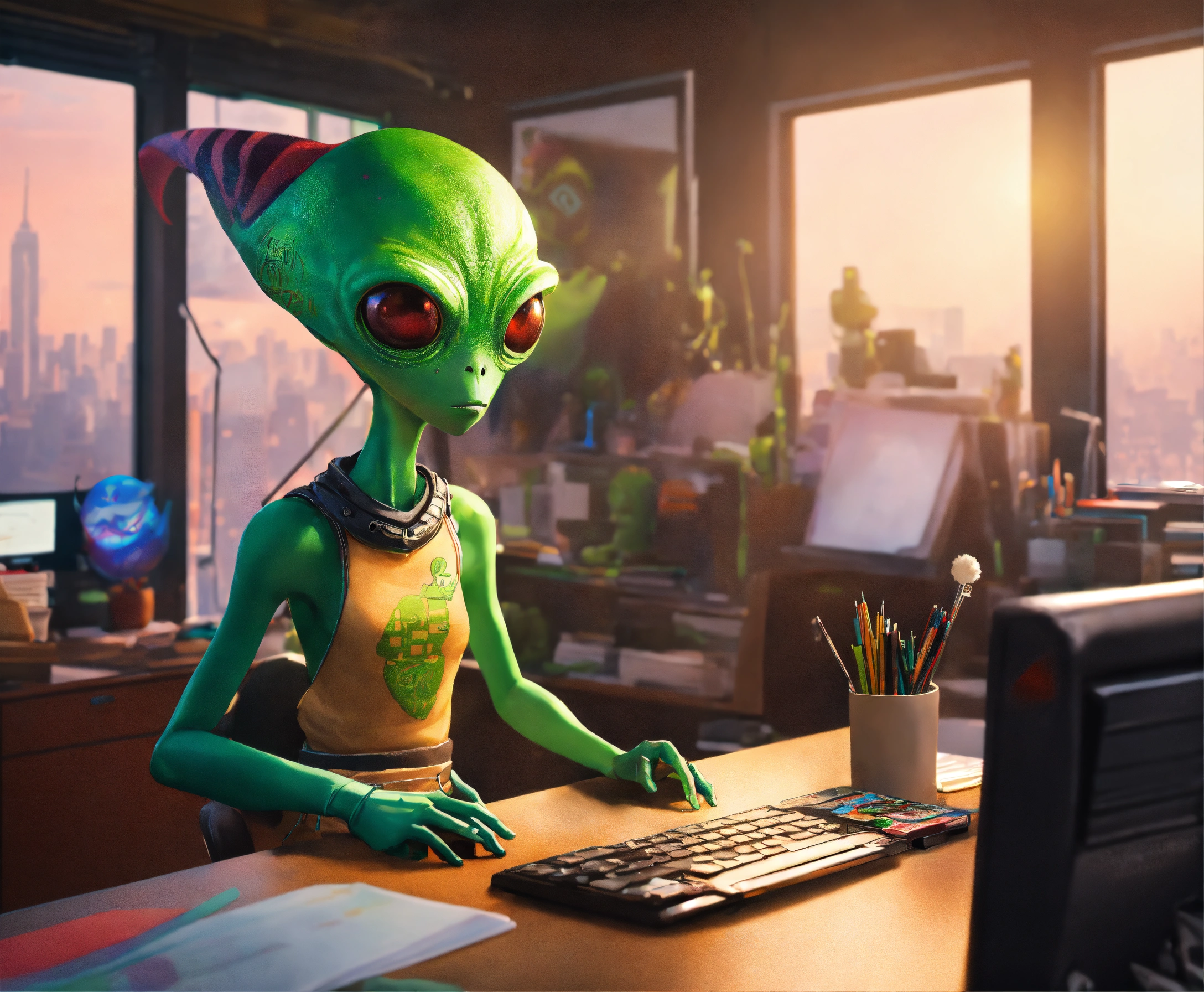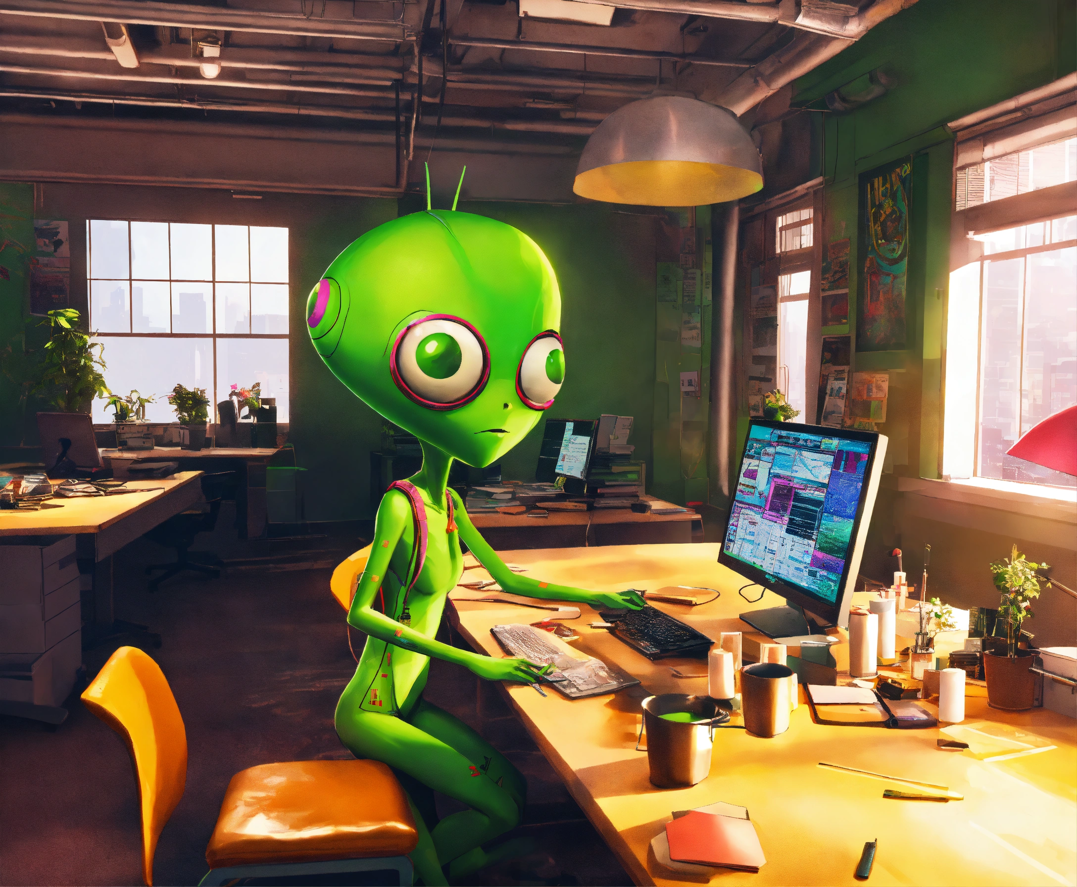 Orion, a green alien standing up in a mundane office with, adhd, trippy, corporate, hippy, hipster, millennial girl, eccentric style, artist, co-workers, nyc, punk visual art, gorillaz, tank girl, unreal engine, orion is the only alien in the corporate office