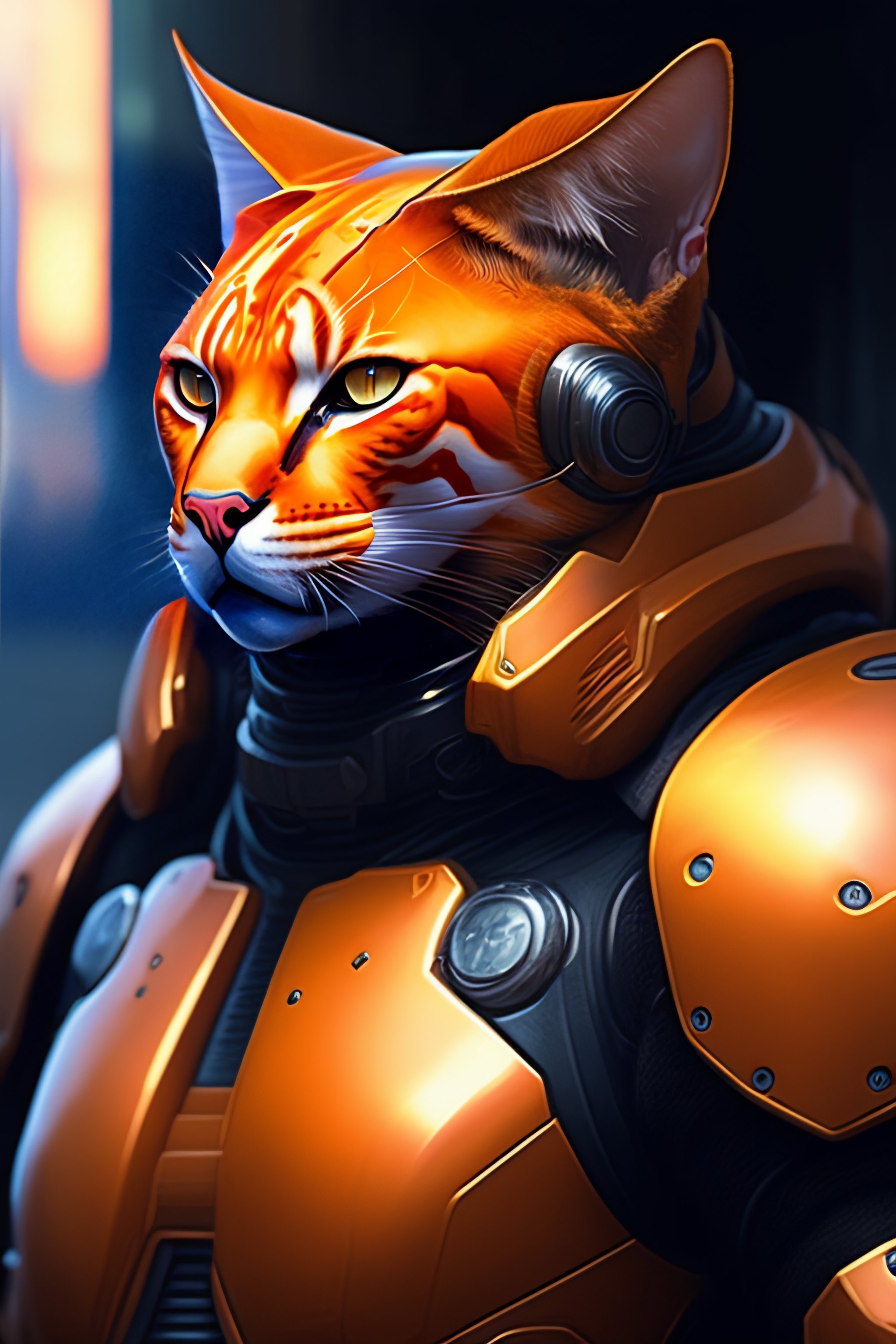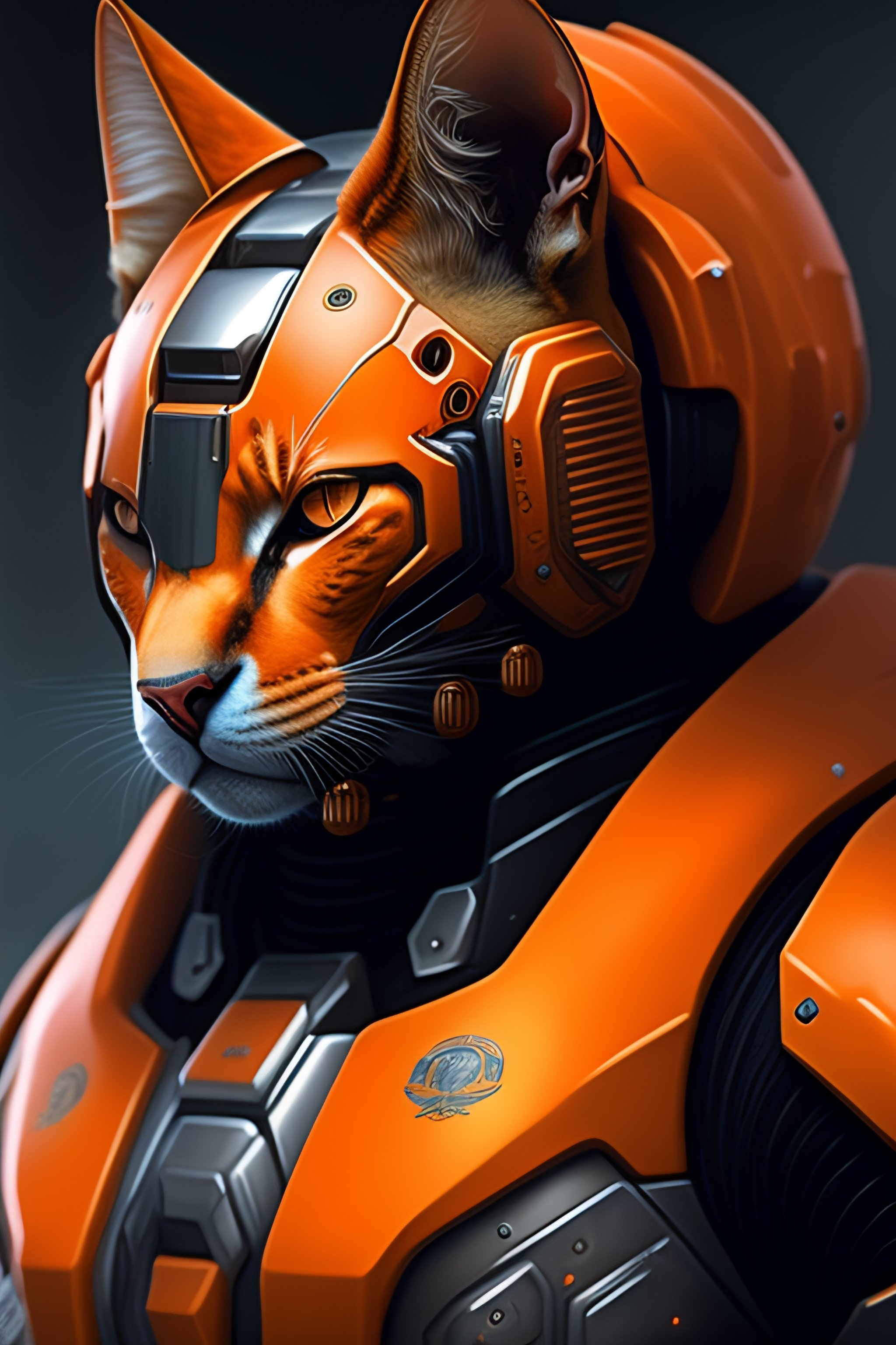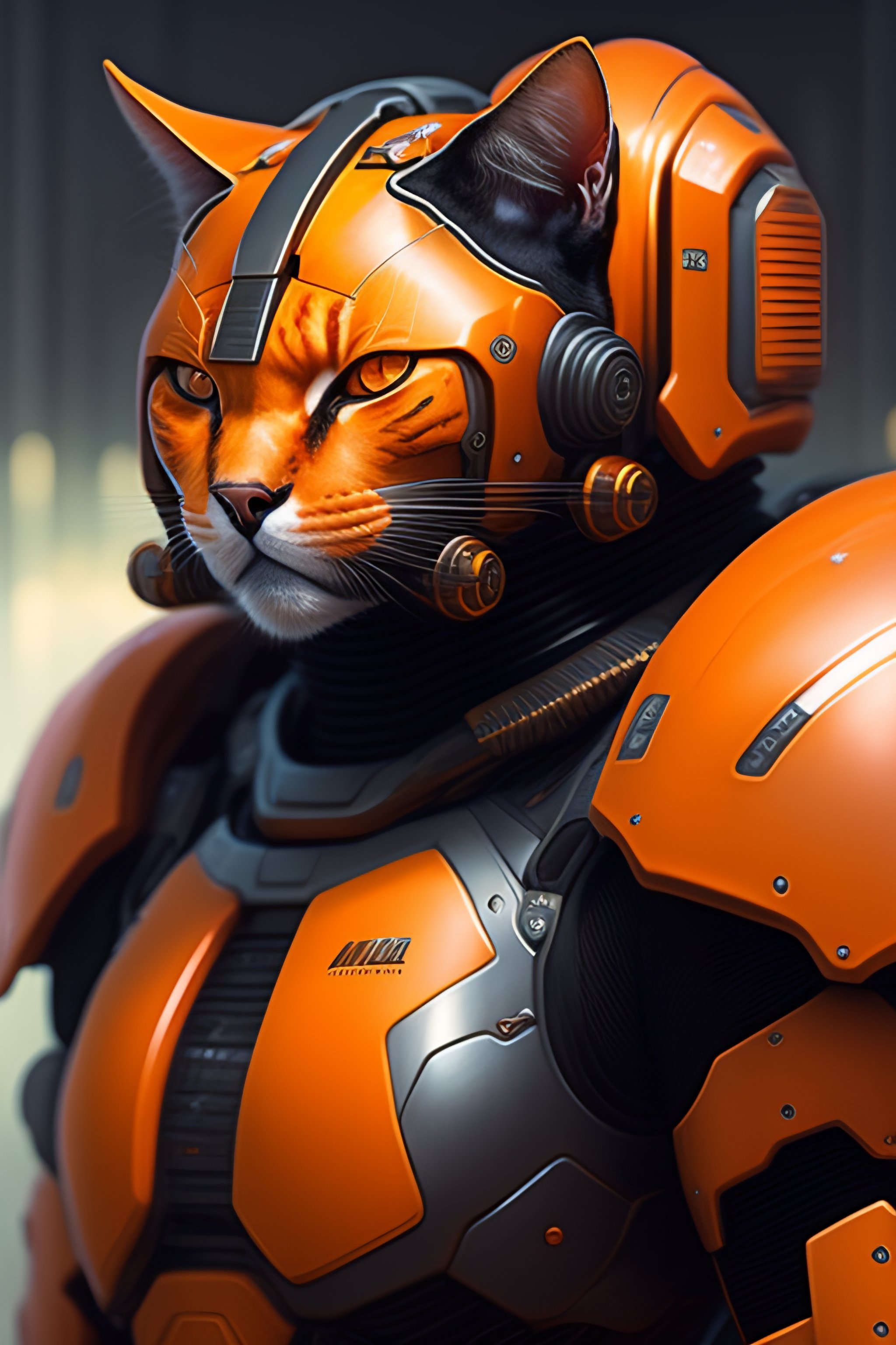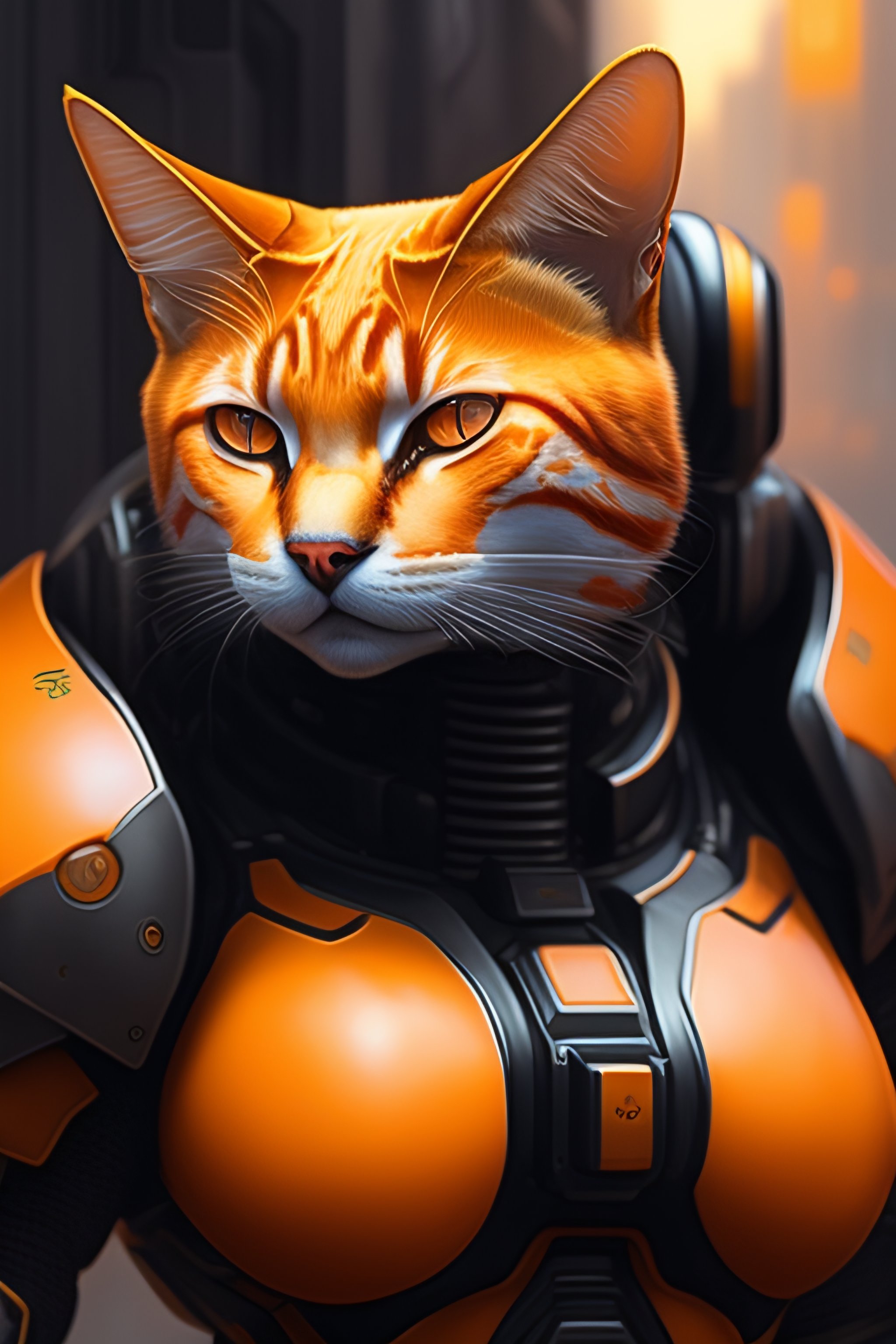 Orange cat with while chest as the doomslayer, realistic scifi cyberpunk power armor robot, closeup portrait art by donato giancola and greg rutkowski, vintage retro scifi, realistic face, digital art, trending on artstation, symmetry