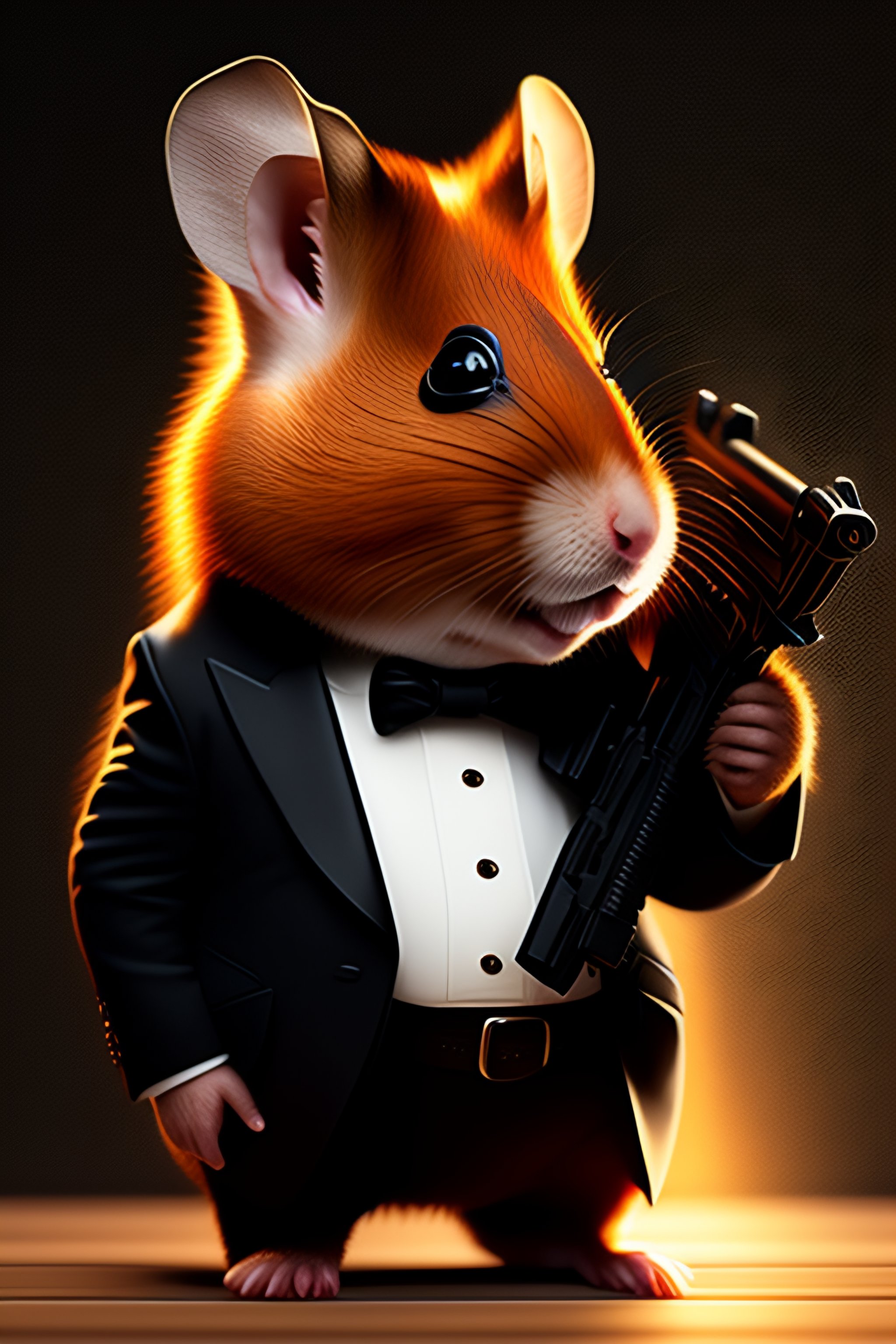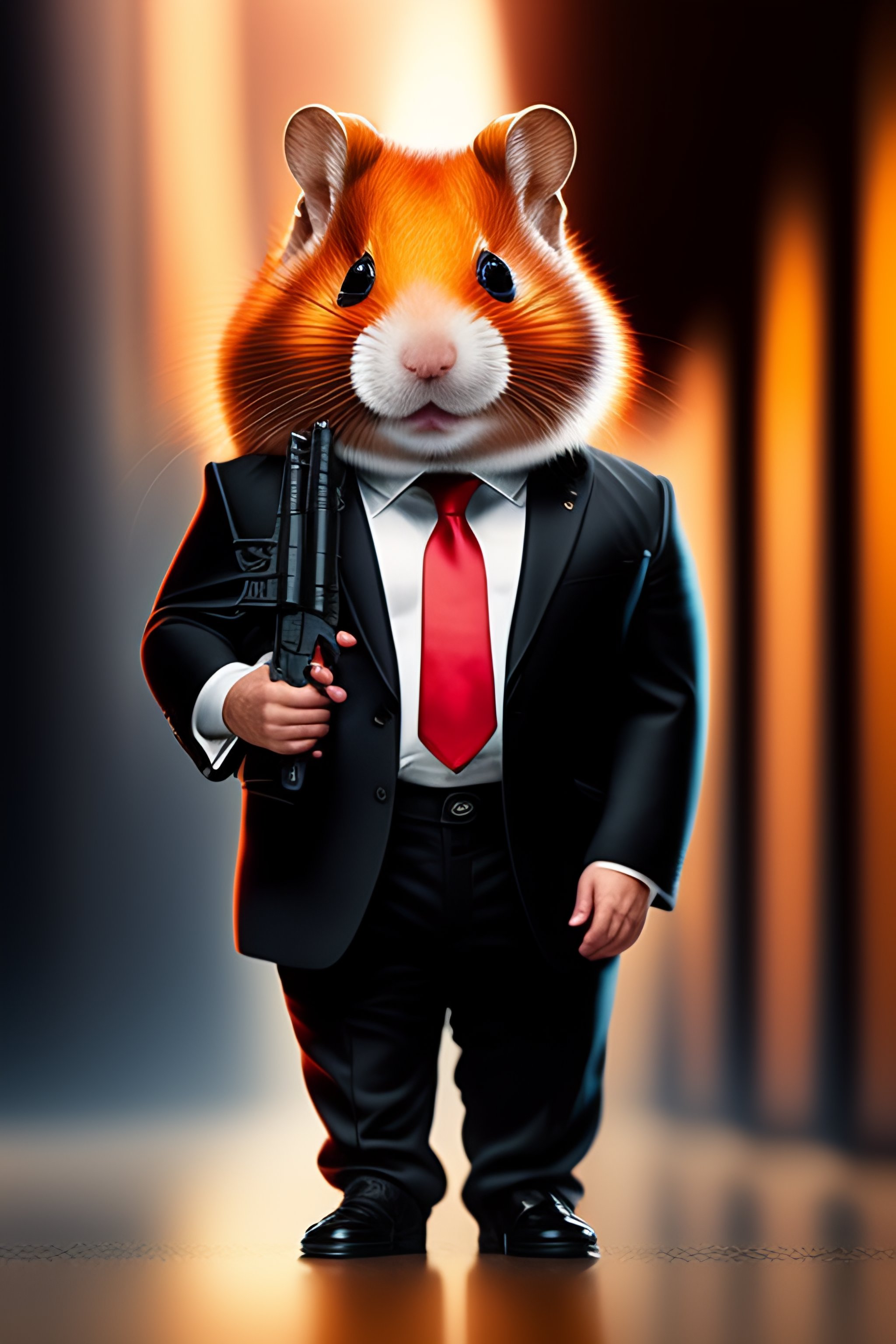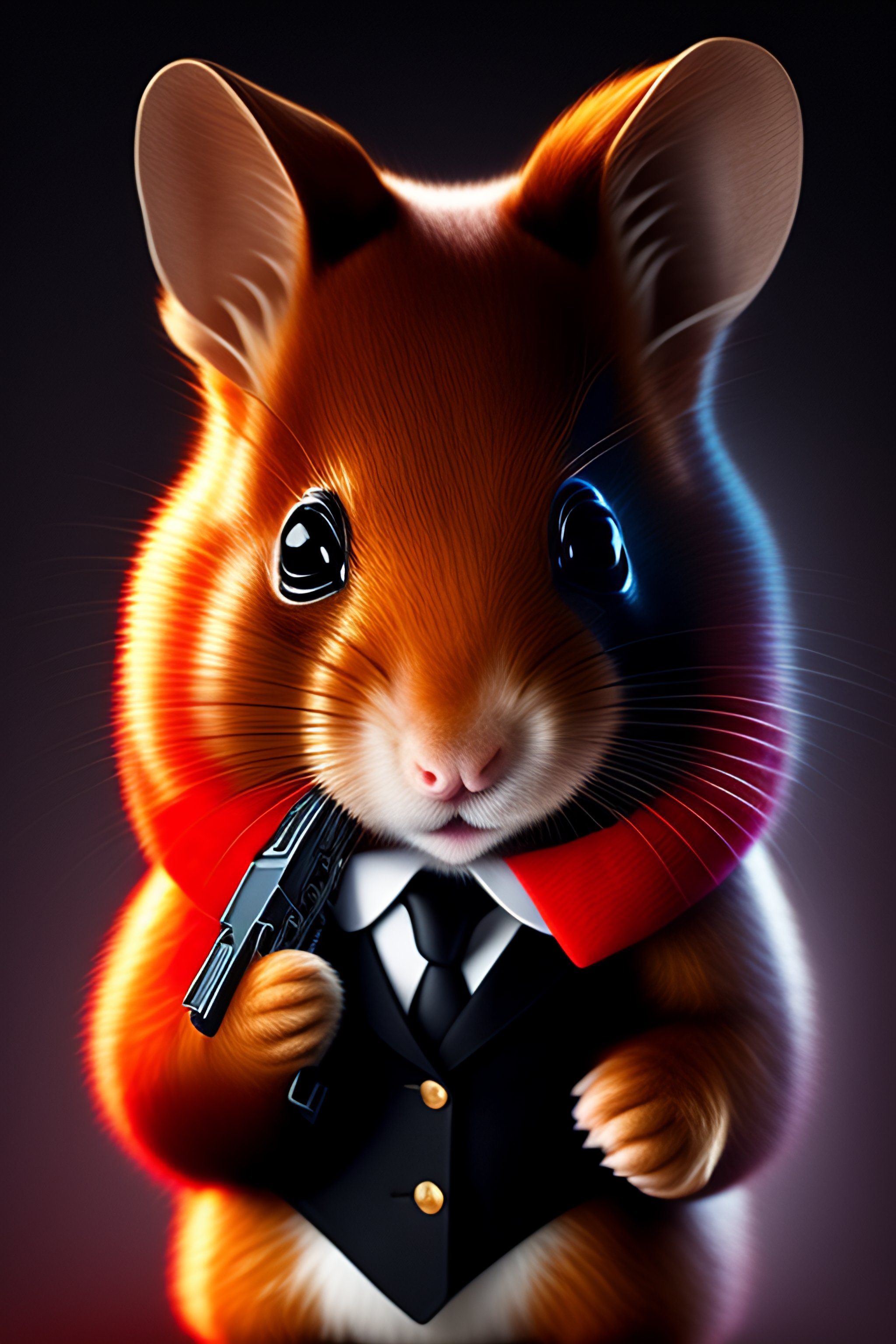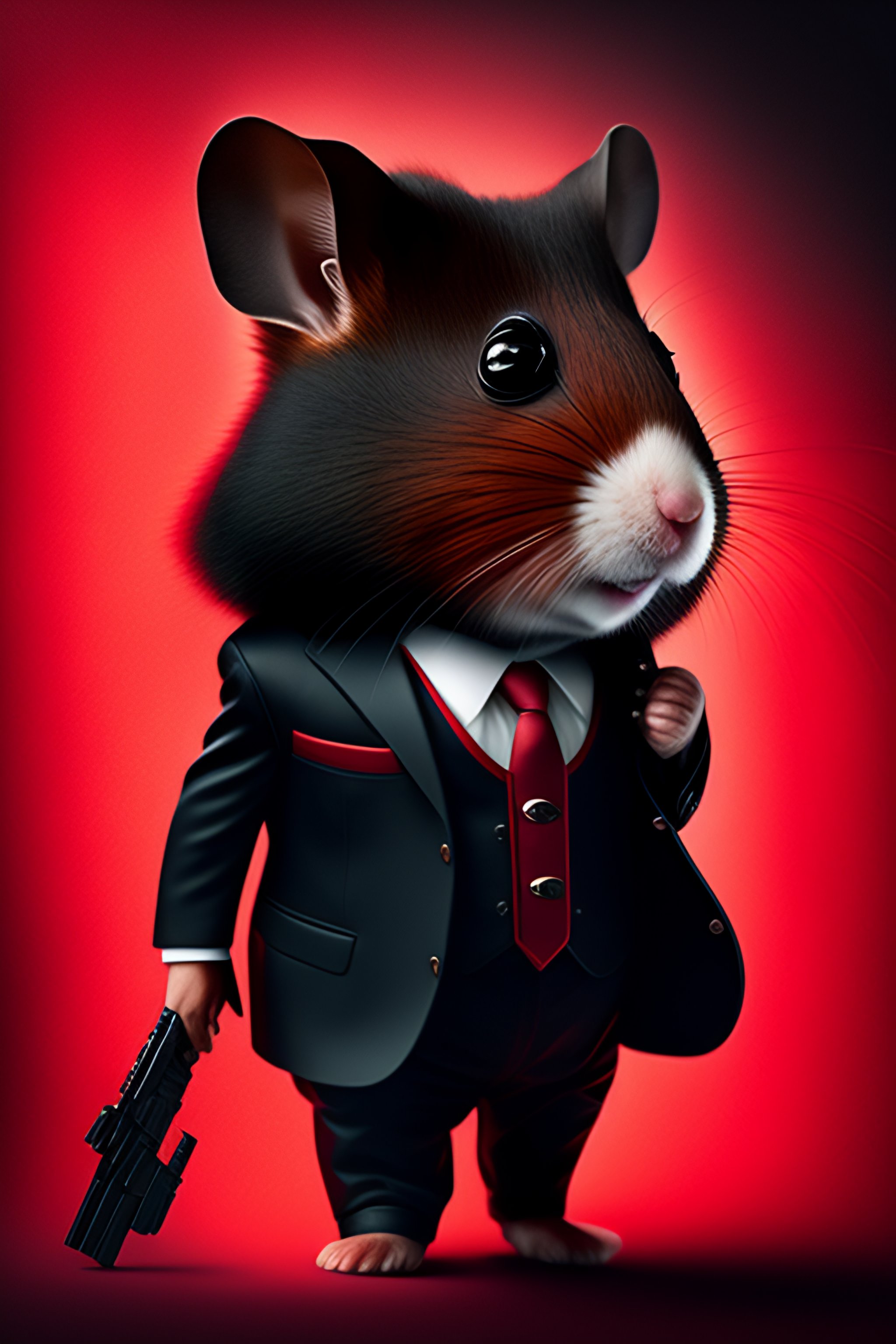 Anthropomorphic red hamster in a bodyguard black suit with gun