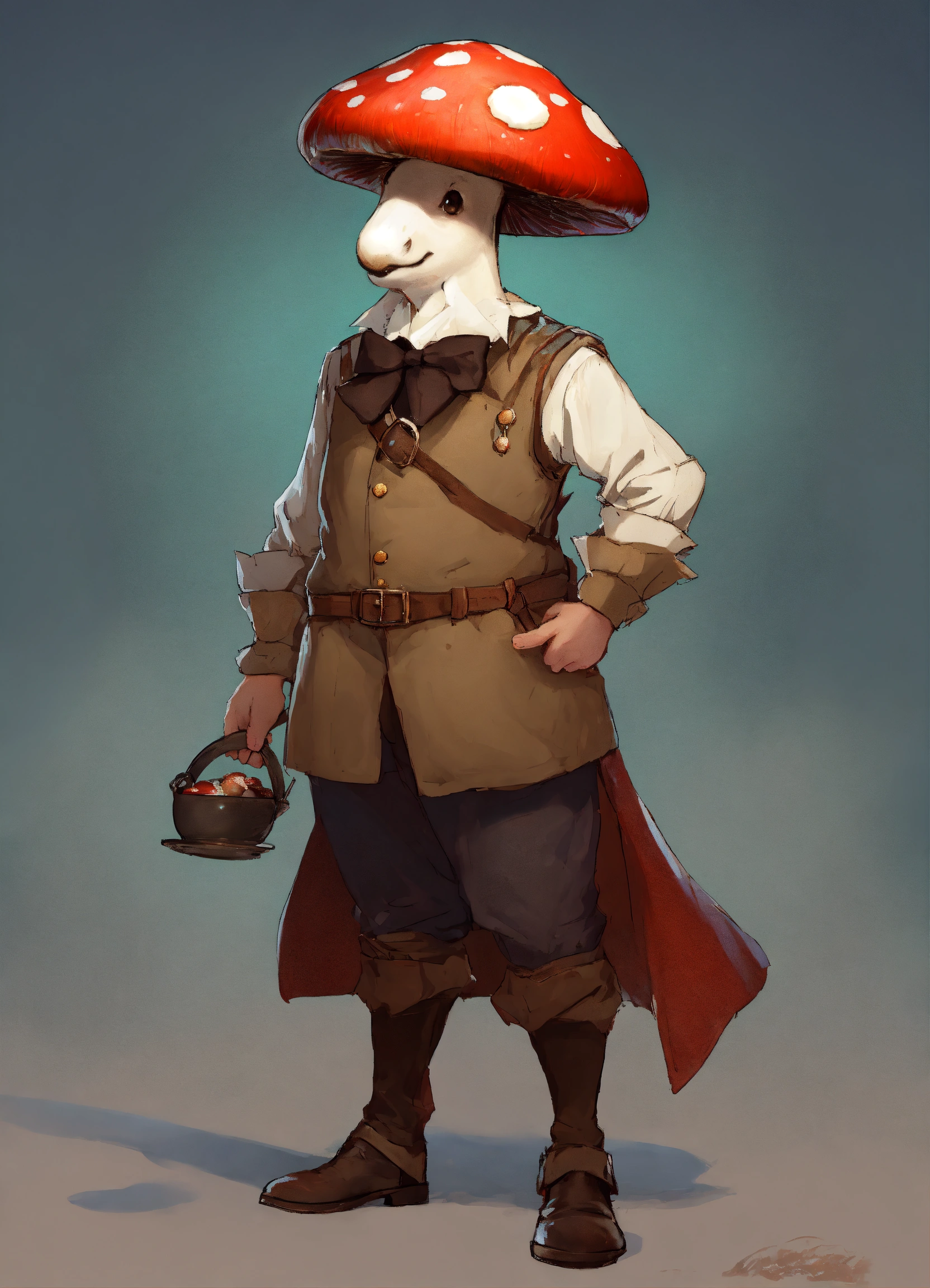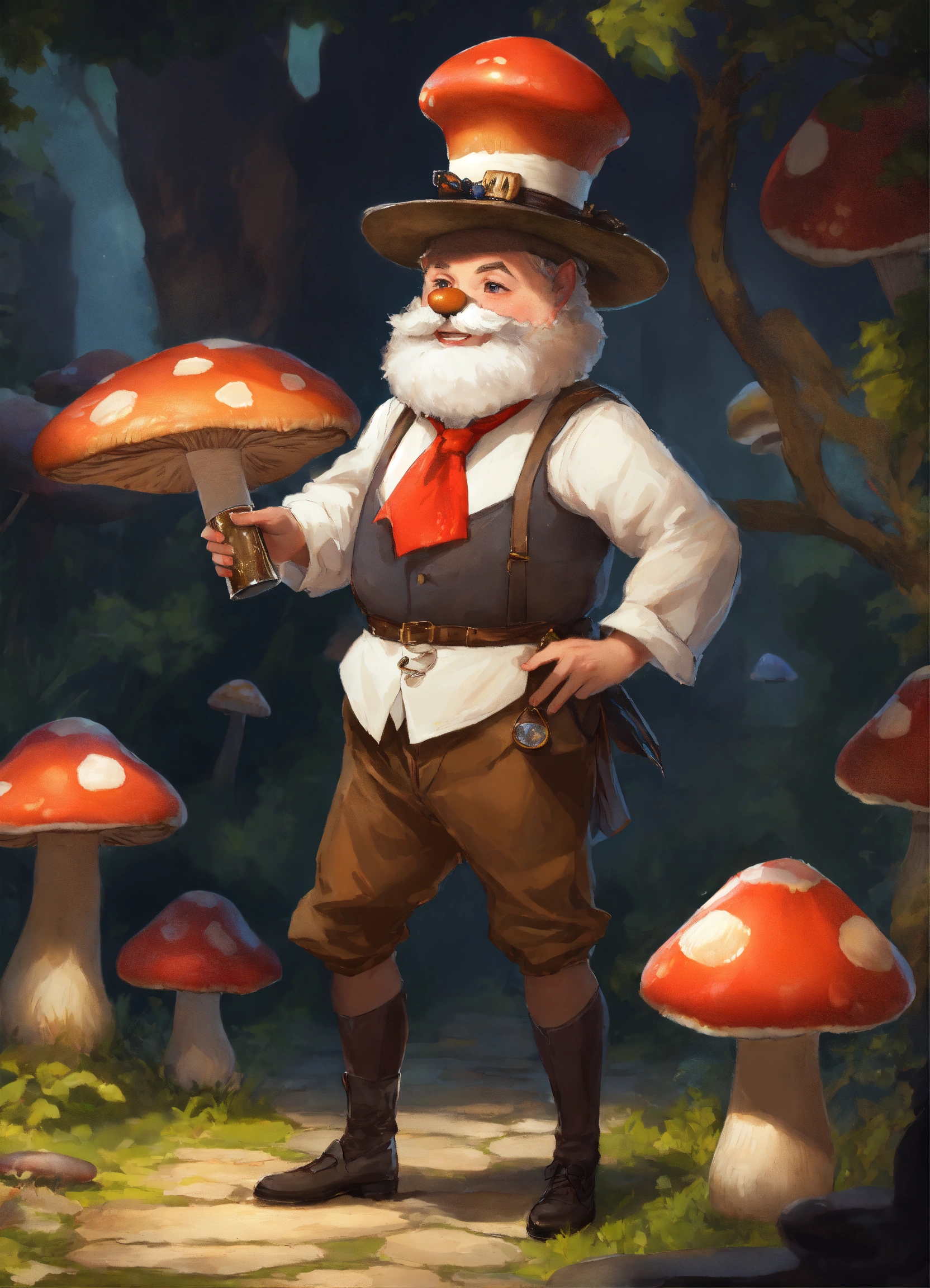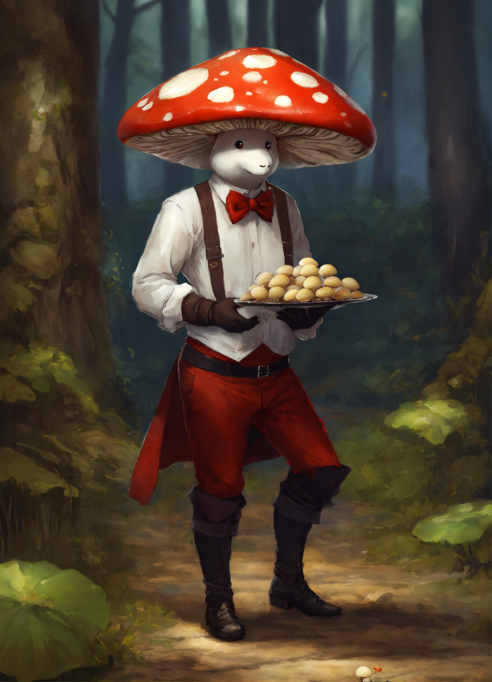 Mushroom man wearing a waiter outfit that speaks french