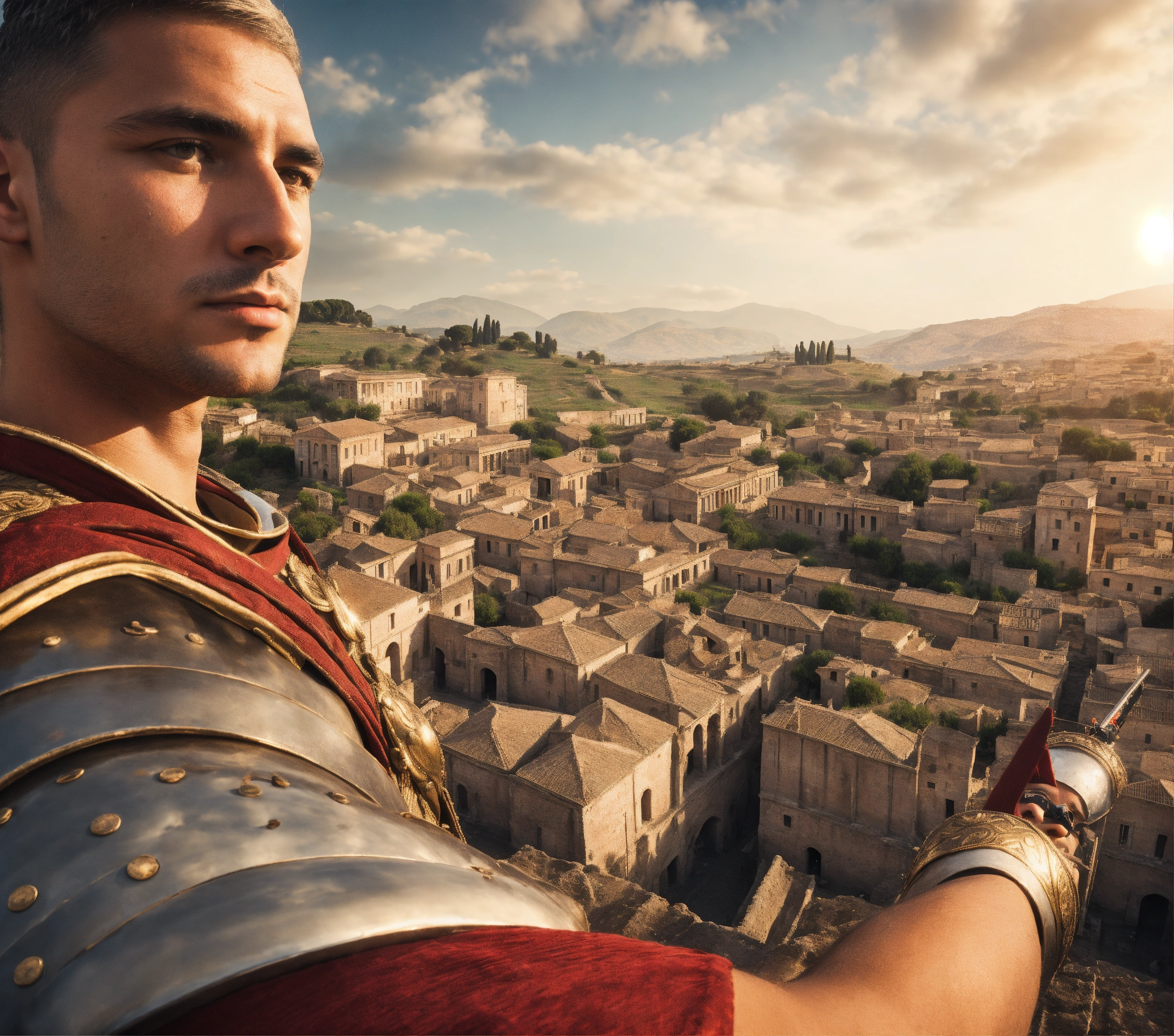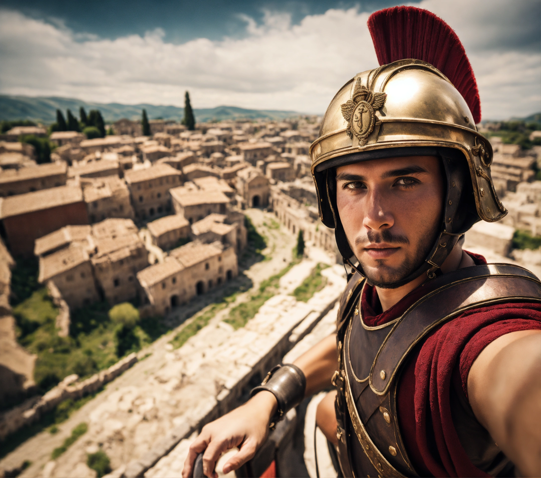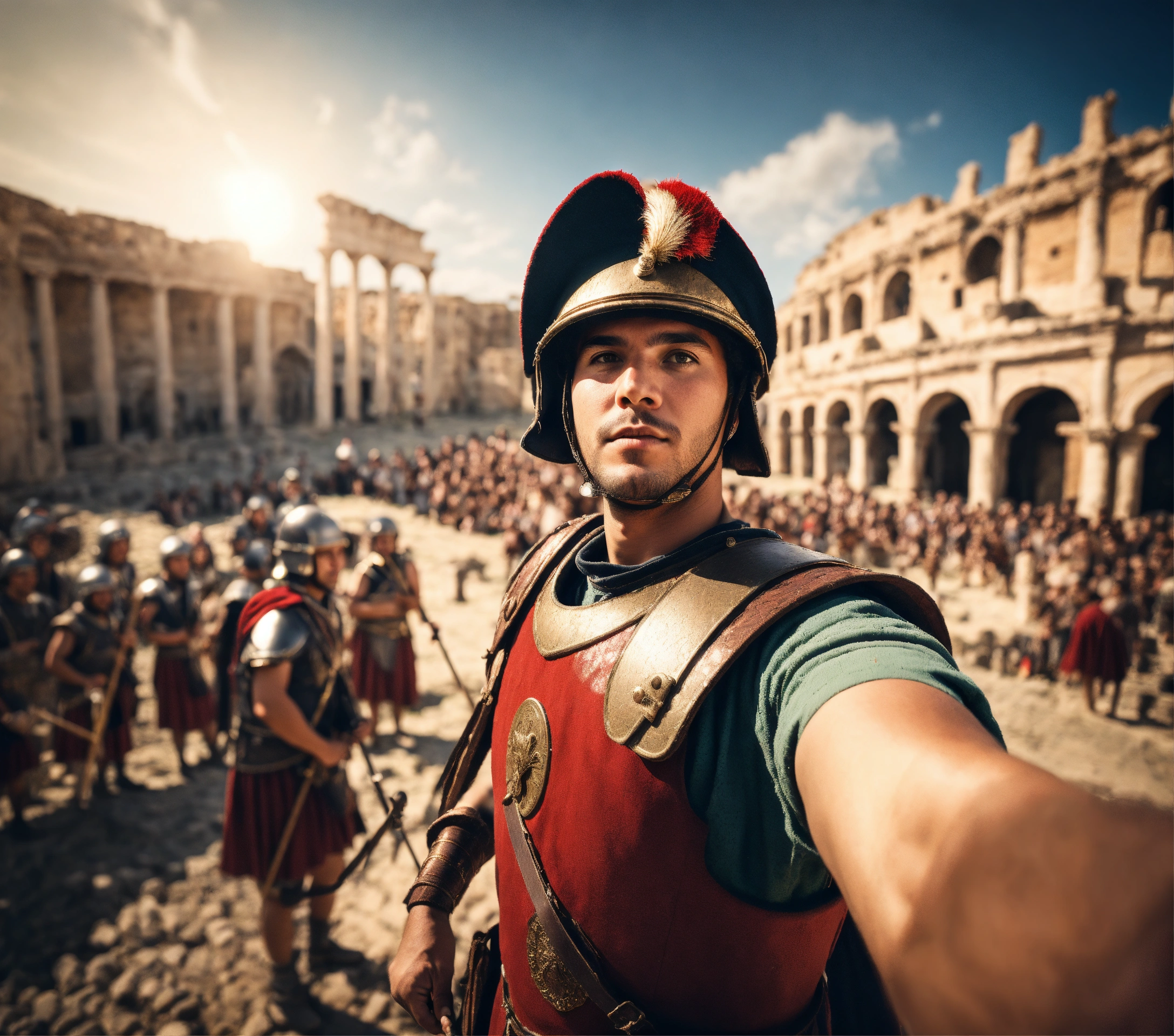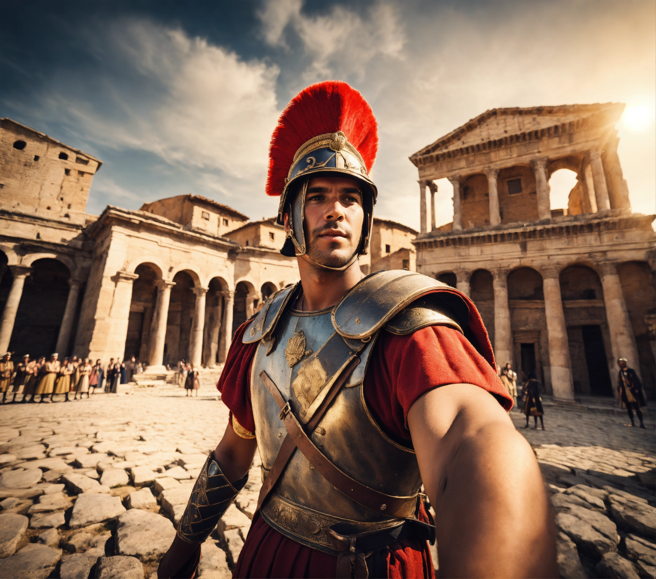 Roman soldier guard in front of roman city taking selfie with villagers while holding camera, hyper detailed, photorealistic, highly textured, wide-angle lens.