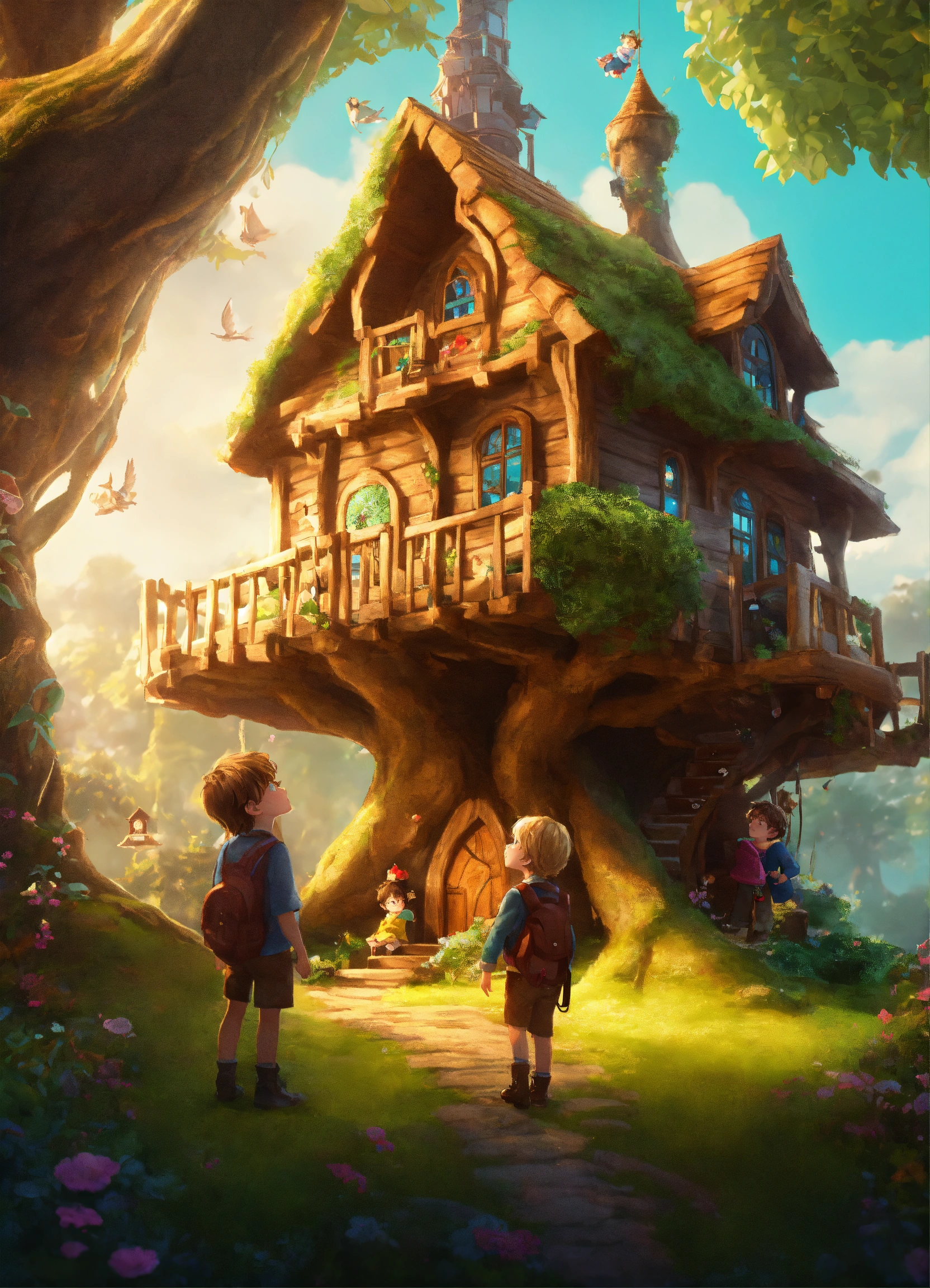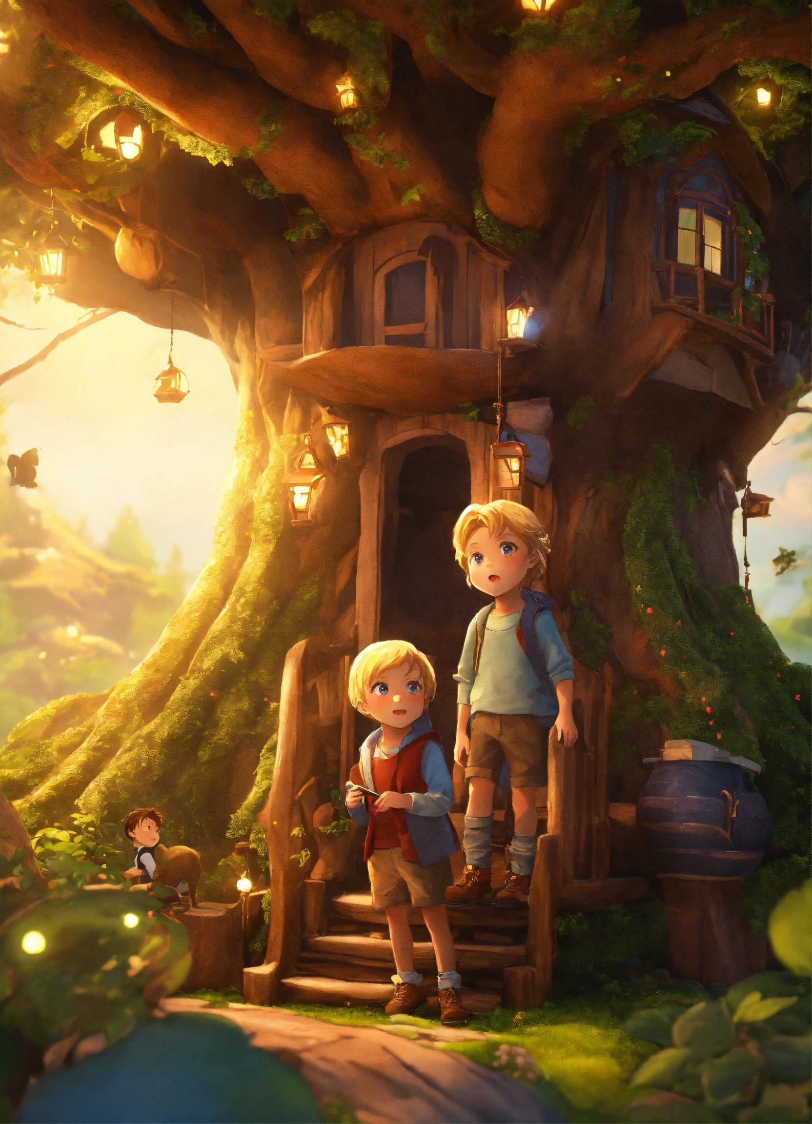 An adorable girl with blonde hair, and a little boy with brown hair, both characters looking up at a magical treehouse in a enchanted forest. high quality, 8k
