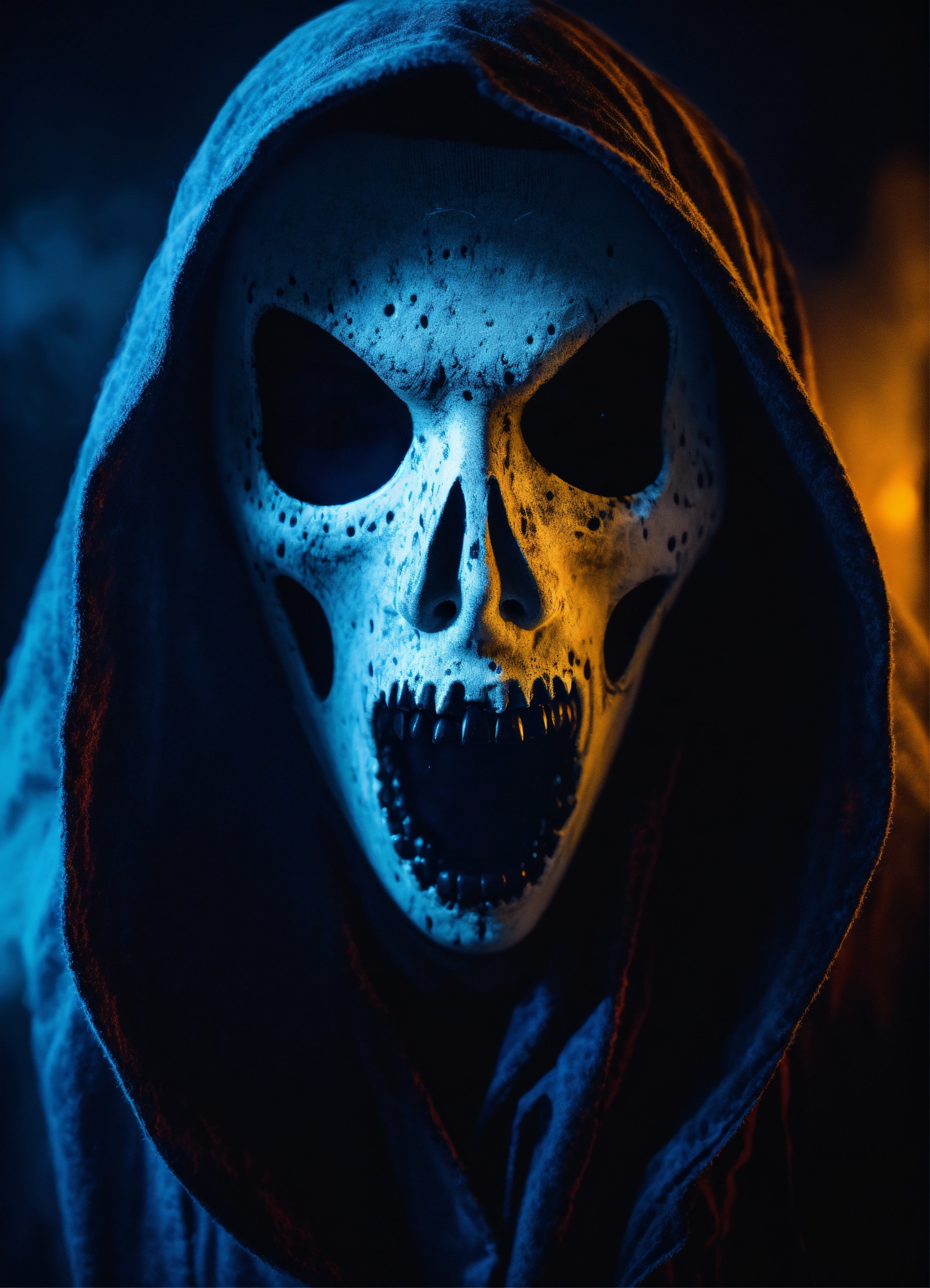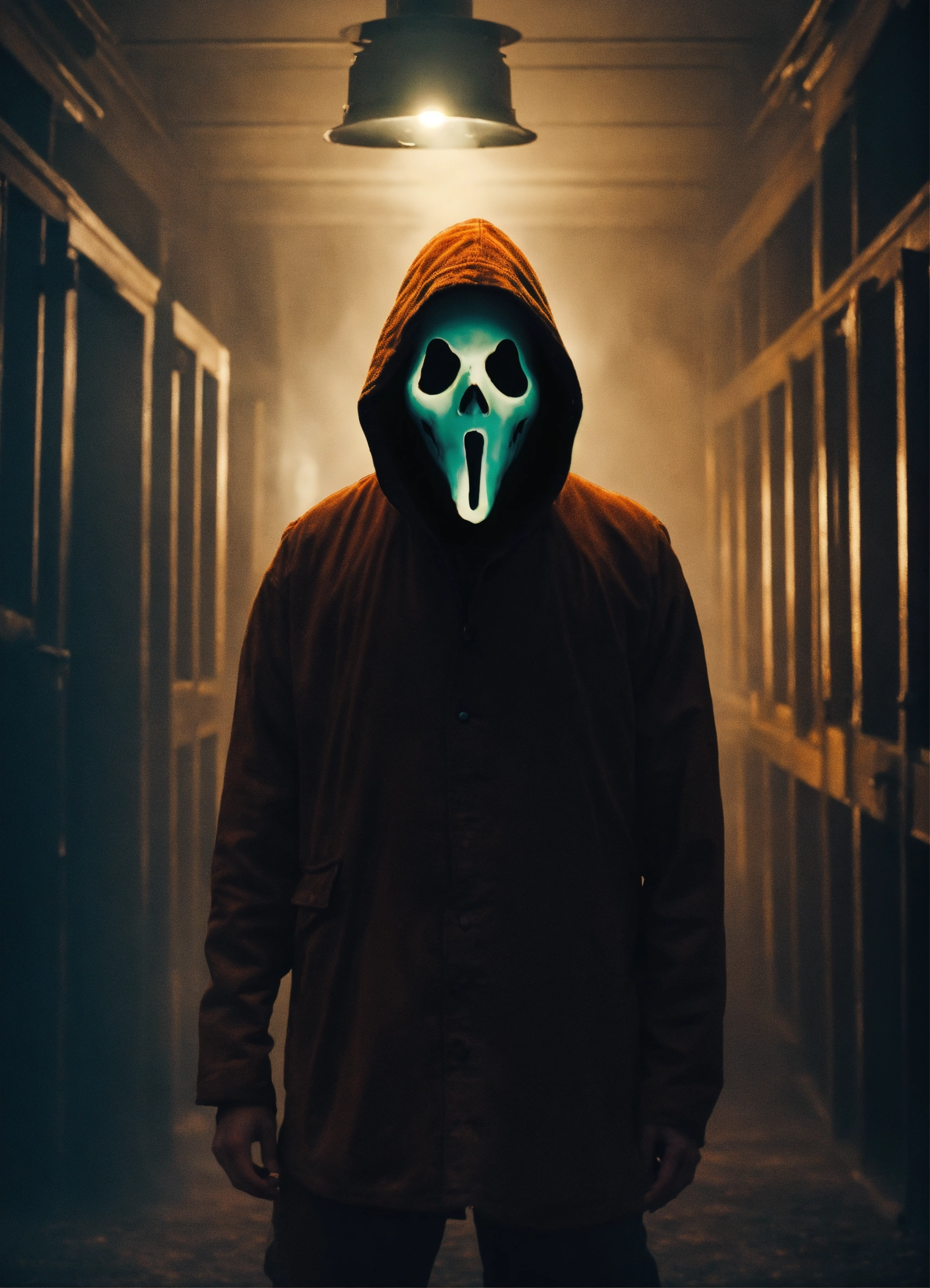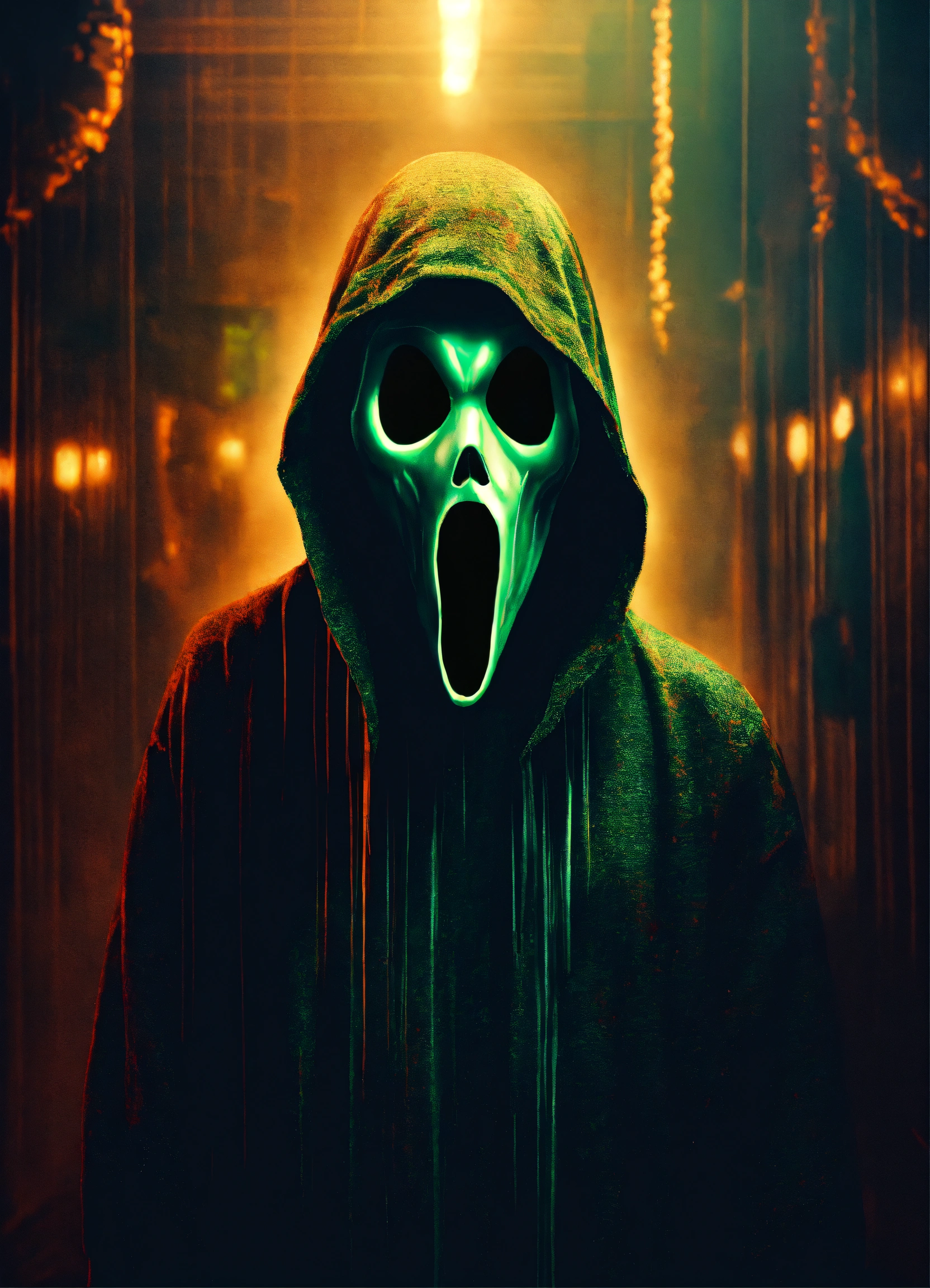 Ghost face from the movie scream in strobe lights and fog dmt roo