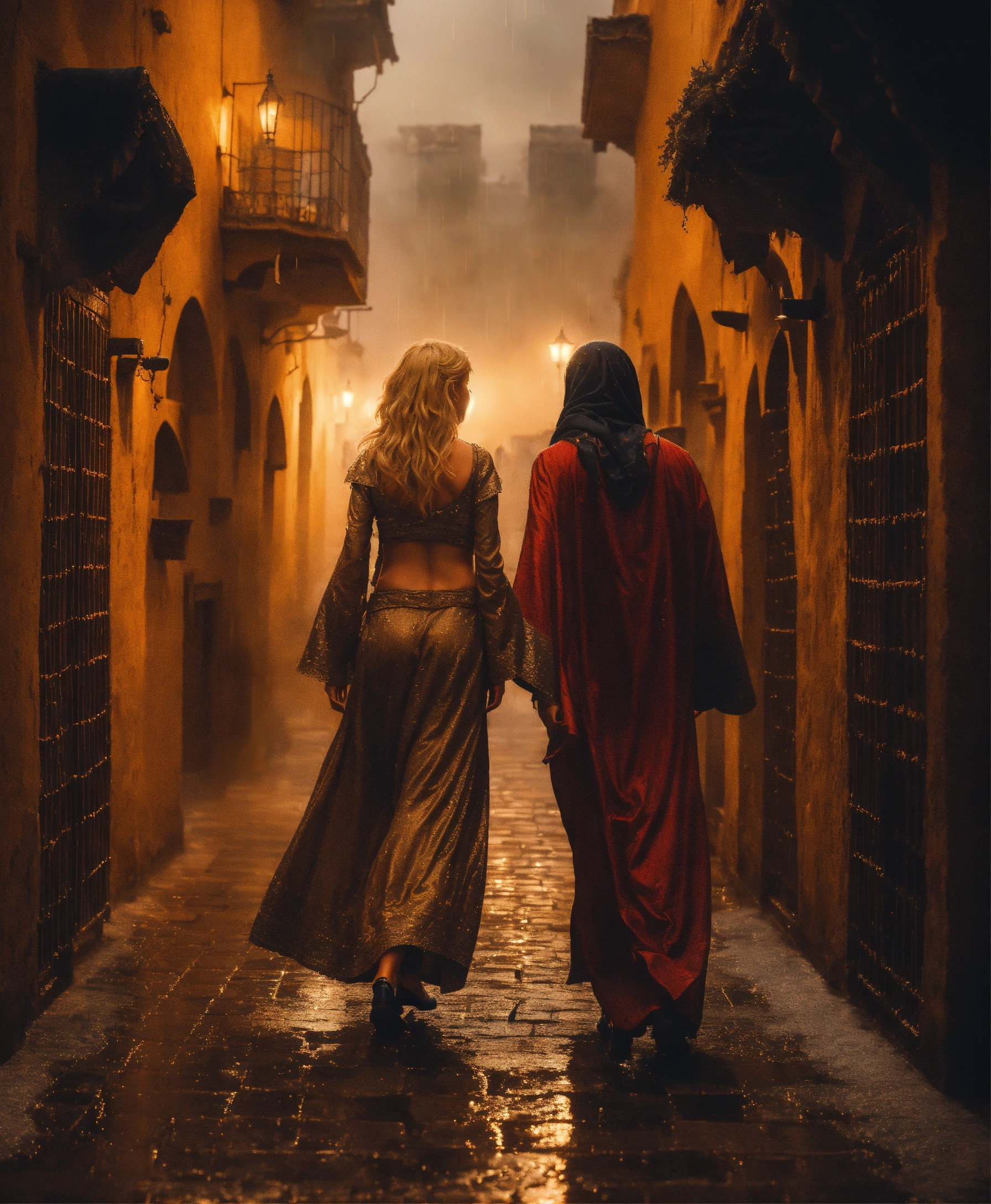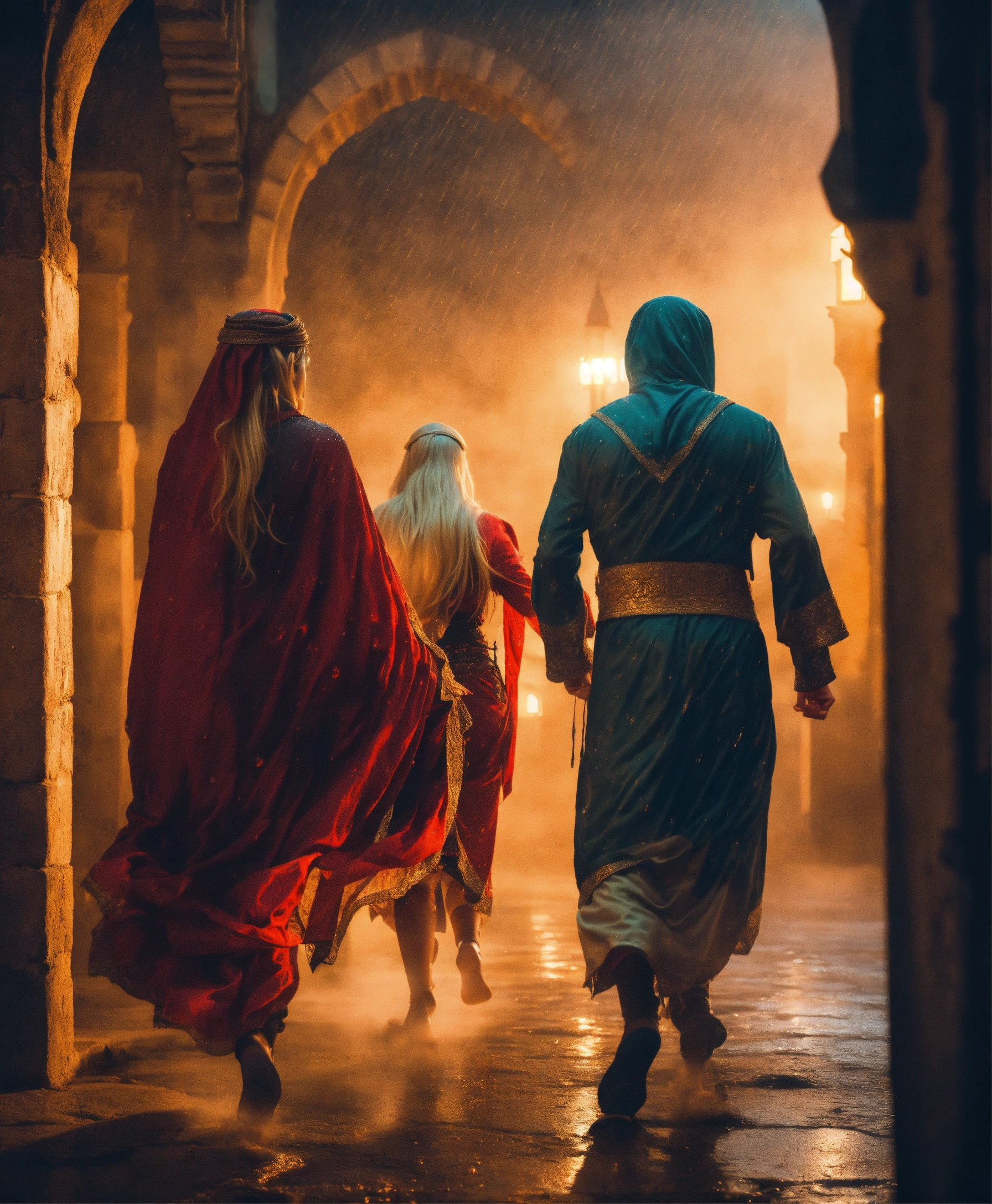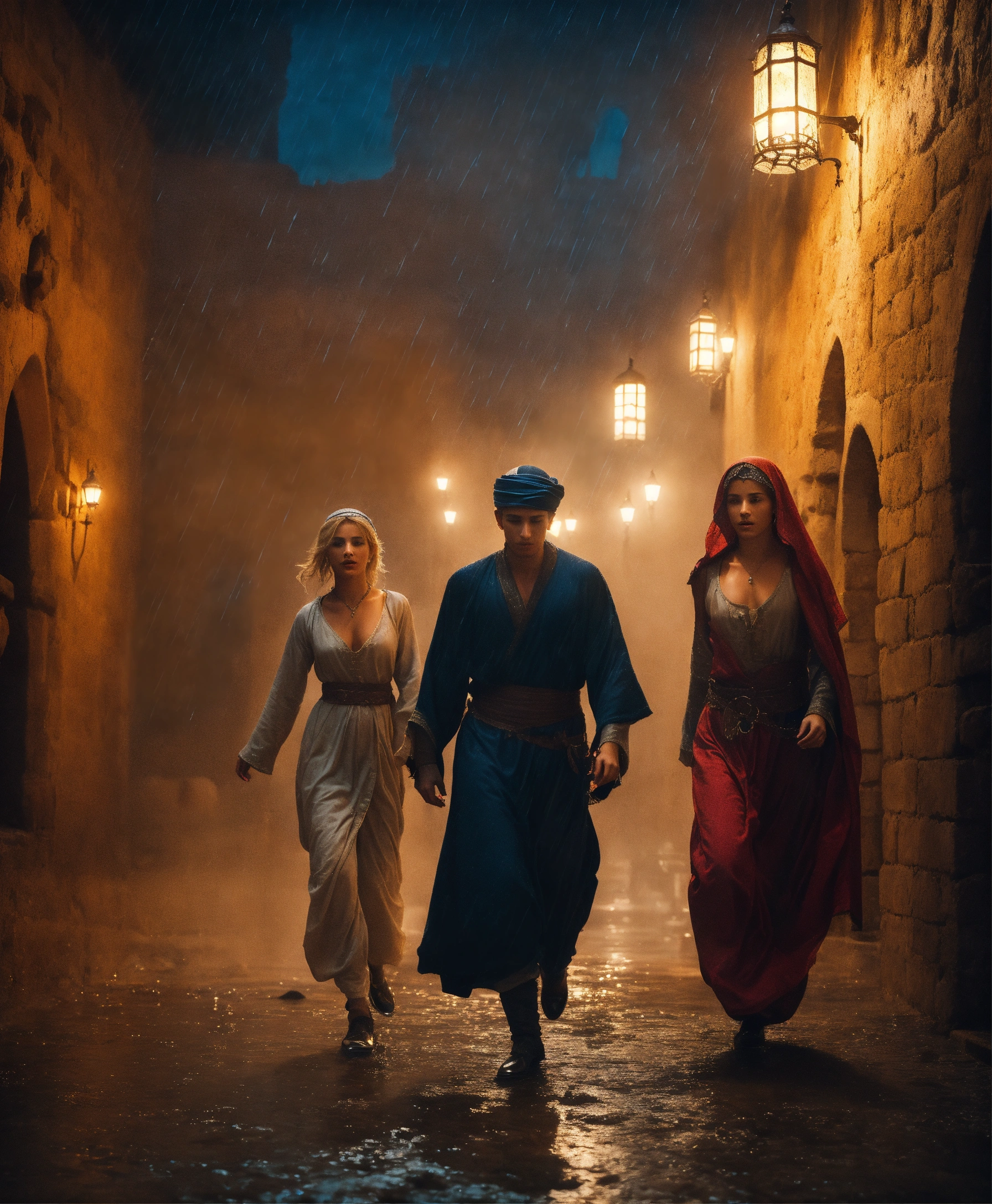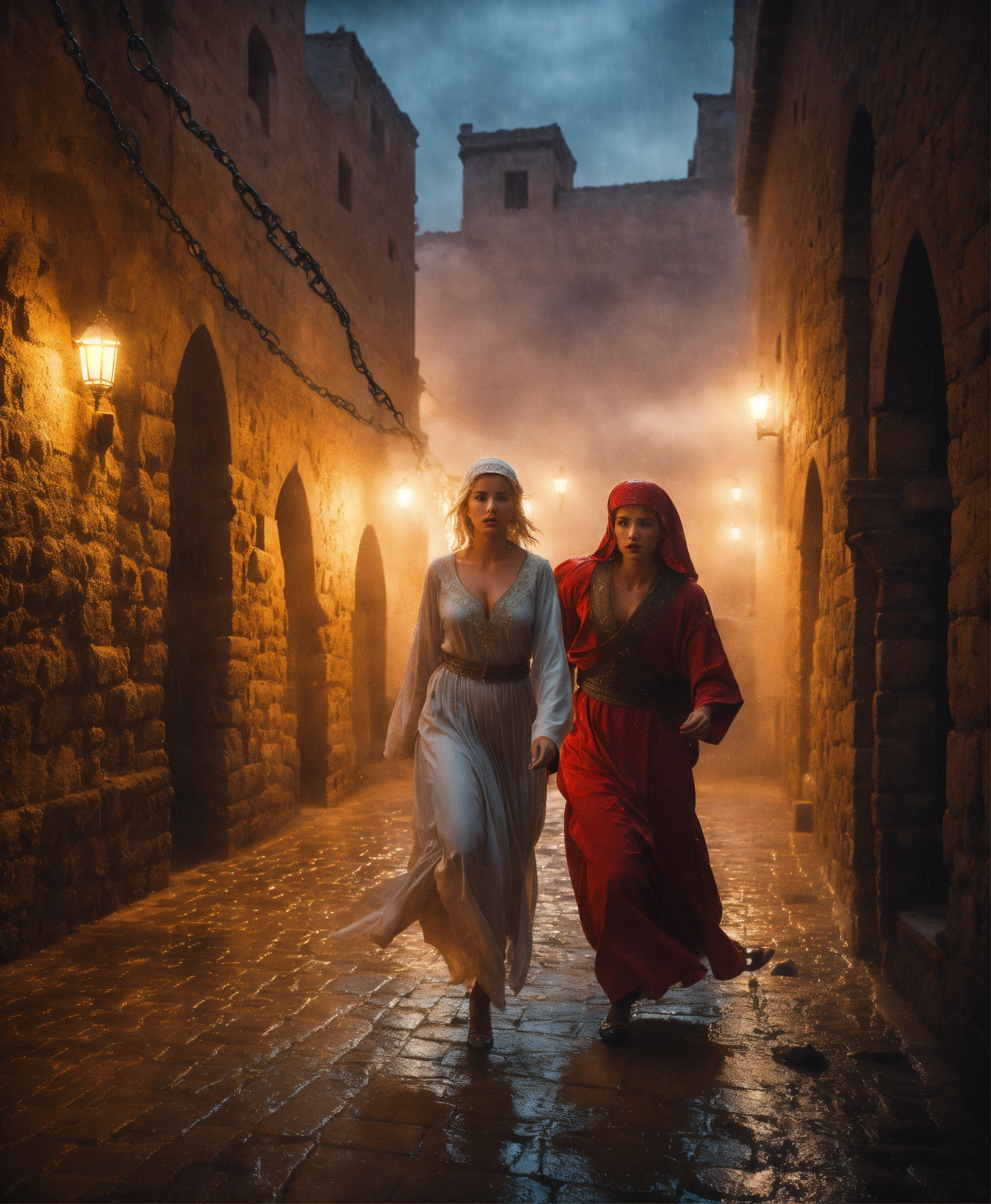 An epic fantasy scene featuring two gorgeous and beautiful blonde and brunette odalisques accompanied by arab merchant running away in the night, from a prison in medieval morocco. tension, fear and motion. misty and rainy atmosphere. cinematic view, sharp detail.
