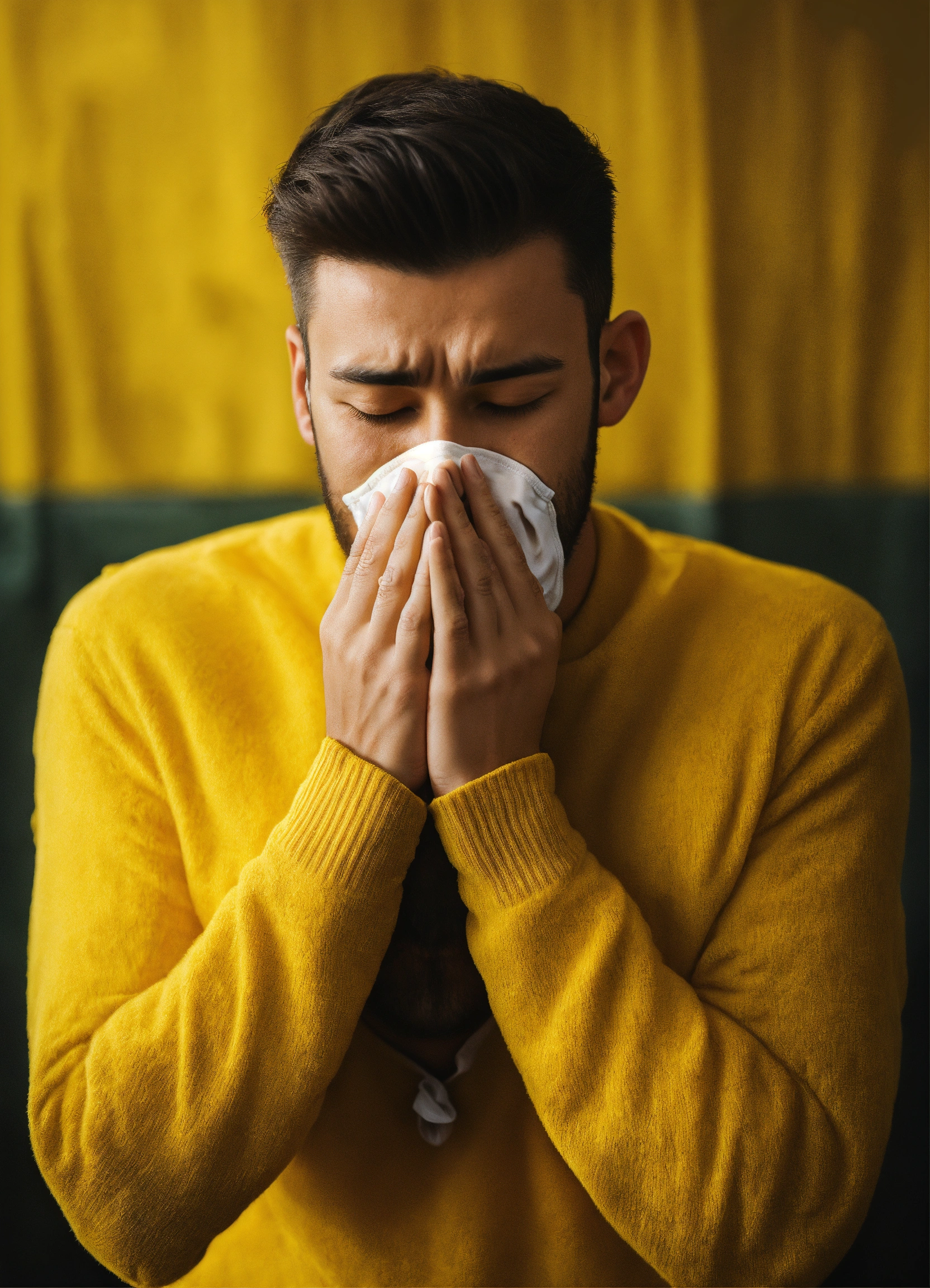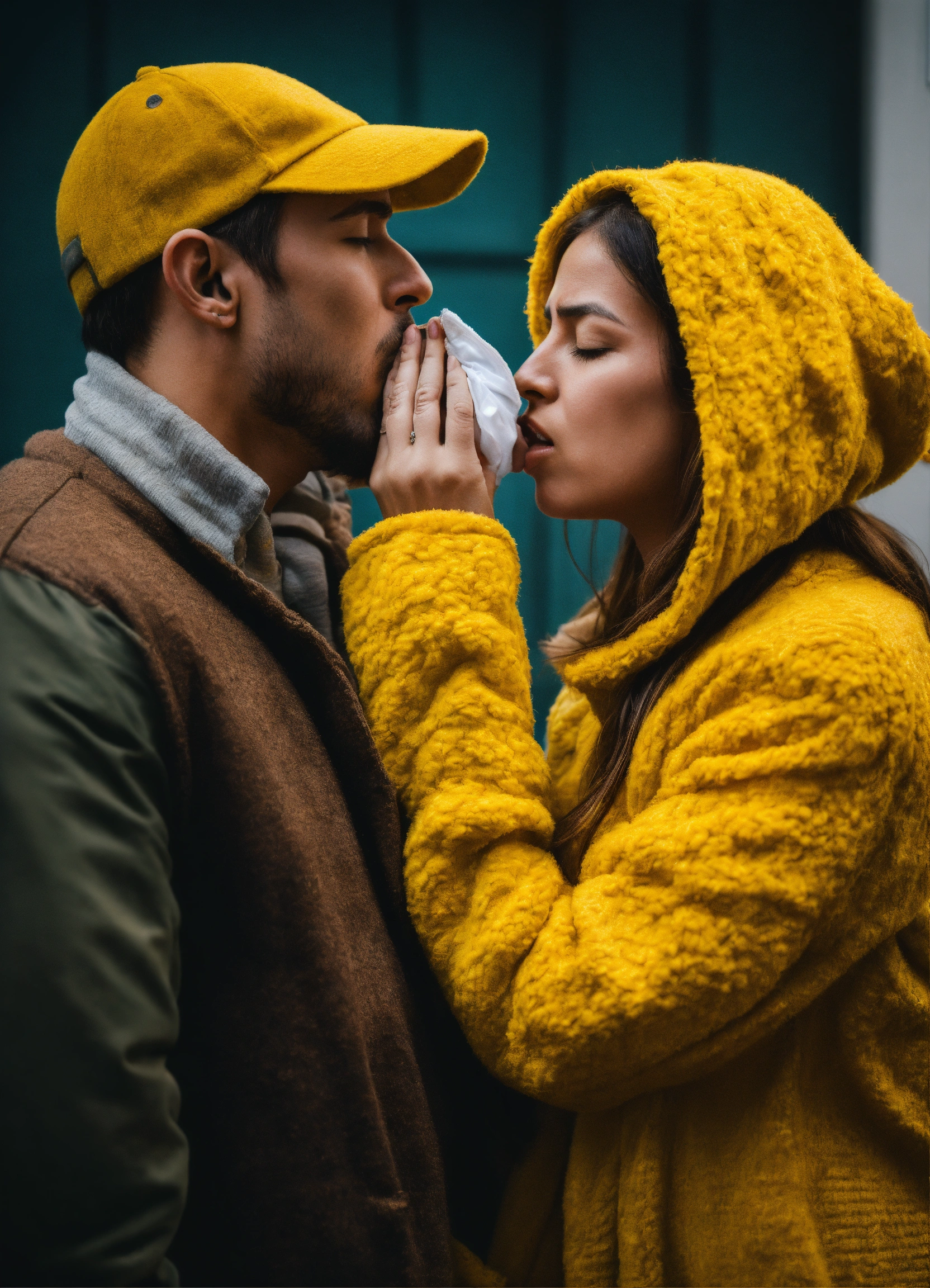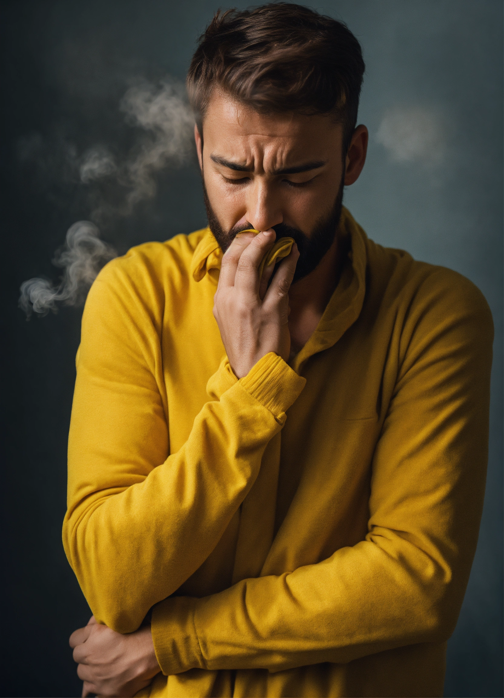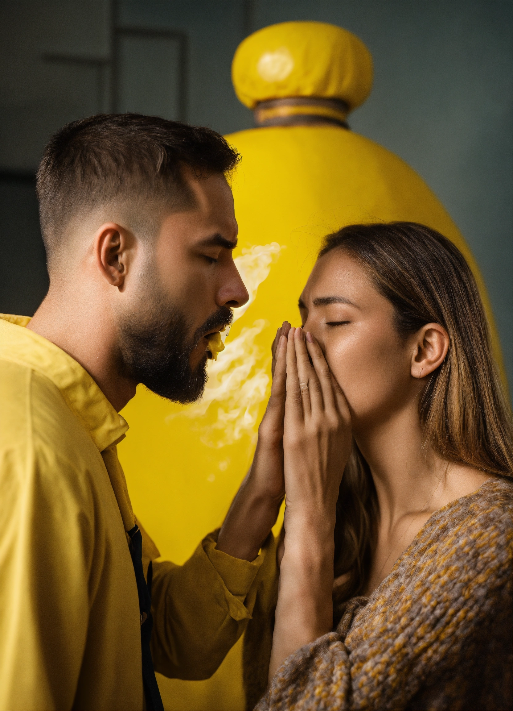 Realistic photo of a man breathing out yellow foul air from his mouth and a woman covering her nose with her hands against the foul odor and looking questioningly