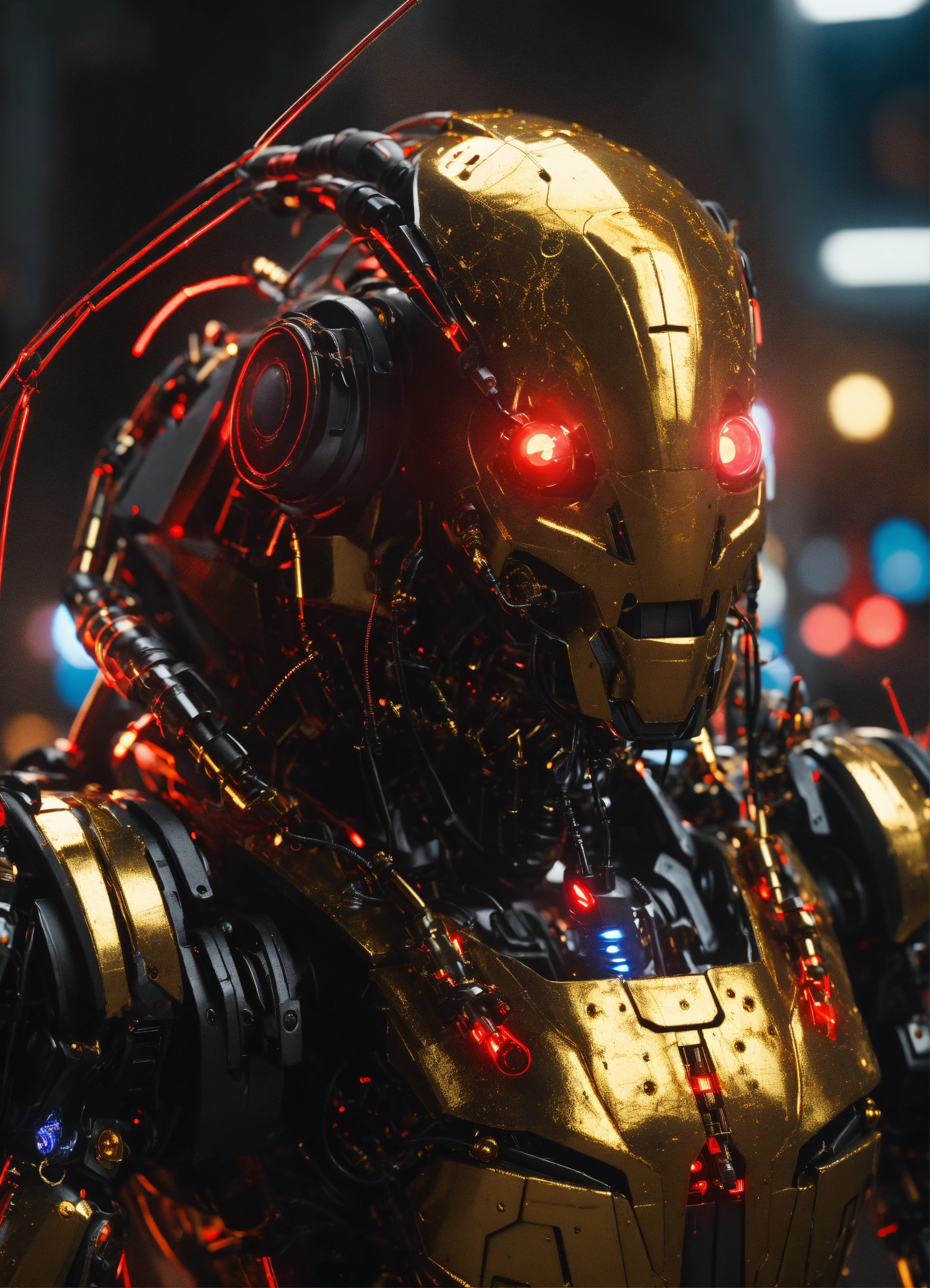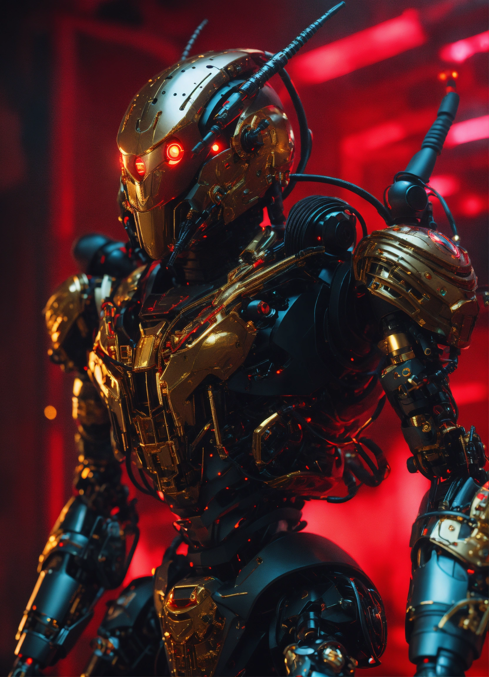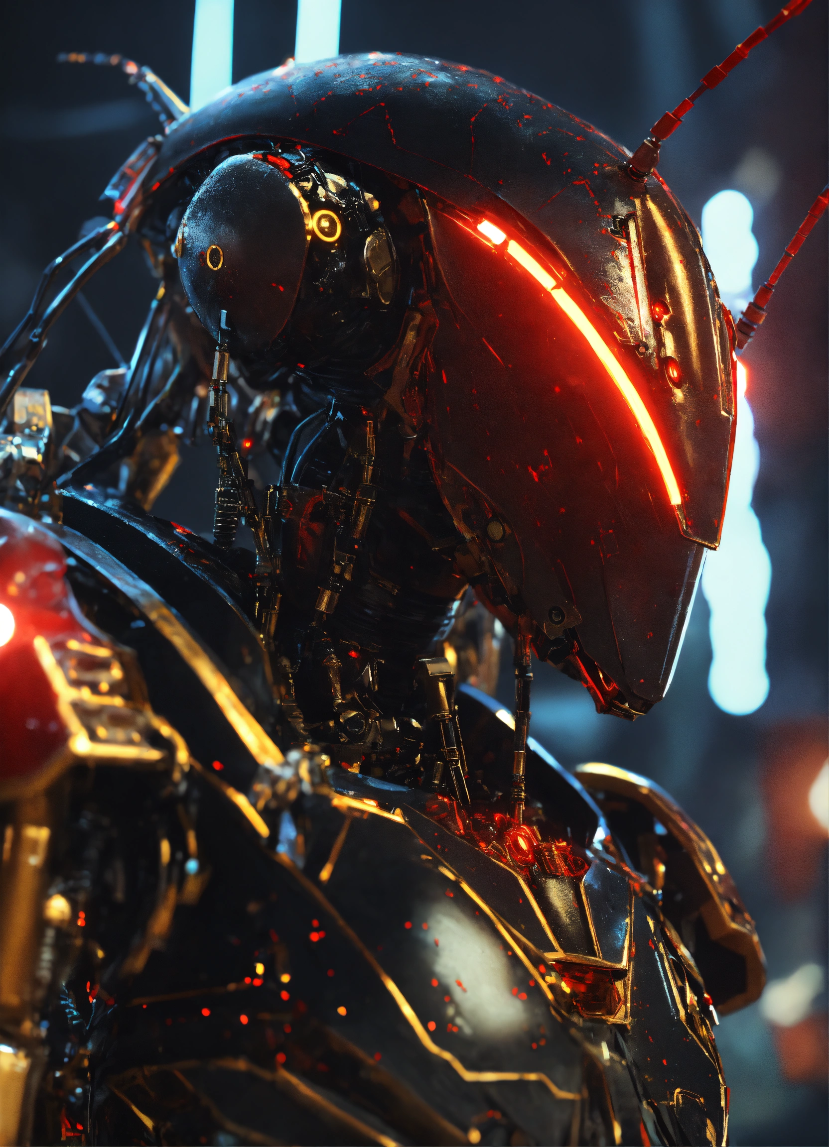 Zoom out of black cockroach faced humanoid robot with red glowing eyes, detailed gold circuitry on it's armor. standing and shooting electricity from his powerful antenna attacking, realistic, 8k